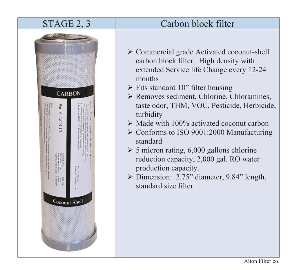 Compatible APEC FILTER-SET bottom 3 filters for model ROES-50, ROES-75, RO-45, RO-90, RO-PH90, RO-PERM, RO-PUMP, RO-Hi, WFS-1000, ROES-UV75, ROES-PH75, ROES-PHUV75, ROES-UV75-SS includes 1 sediment filter and 2 carbon block filters. 1st stage: Multi-layer 5 micron Sediment filter for more dirt holding capacity and extended service life. Dimension 2.5” diameter, 9.84” length” , standard size Fits standard 10” filter housing canister Made with Pure Polypropylene, no BPA Conform toe ISO 9001:2000 Manufacturing standard Removes sediment, dirt, sand, rust Replace every 12 months 2nd & 3rd stage: Activated coconut shell carbon block for extra capacity 5 micron rating 6,000 gallons chlorine reduction capacity or 2,000 gallons RO water usage capacity Dimension 2.75” diameter, 9.84” length Activated carbon block filter made with 100% high quality coconut shell carbon. Removes sediment, chlorine, chloramines, taste, odor, THM, VOC, Pesticide, Herbicide, turbidity Replace every 12 to 18 months Save Money and Time 100% compatible includes bottom 3 filters, one sediment filter, two carbon block filters + instructions and free tech support, extended service life, Contractor’s Choice 1st stage: Multi-layer 5 micron Sediment filter for more dirt holding capacity and extended service life. Dimension 2.5” diameter, 9.84” length” , standard size Fits standard 10” filter housing canister Made with Pure Polypropylene, no BPA Conform toe ISO 9001:2000 Manufacturing standard Removes sediment, dirt, sand, rust Replace every 12 months 2nd & 3rd stage: Activated coconut shell carbon block for extra capacity 5 micron rating 6,000 gallons chlorine reduction capacity or 2,000 gallons RO water usage capacity Dimension 2.75” diameter, 9.84” length Activated carbon block filter made with 100% high quality coconut shell carbon. Removes sediment, chlorine, chloramines, taste, odor, THM, VOC, Pesticide, Herbicide, turbidity Replace every 12 to 18 months Better bonding and structure designed minimize channeling effect and extend service life