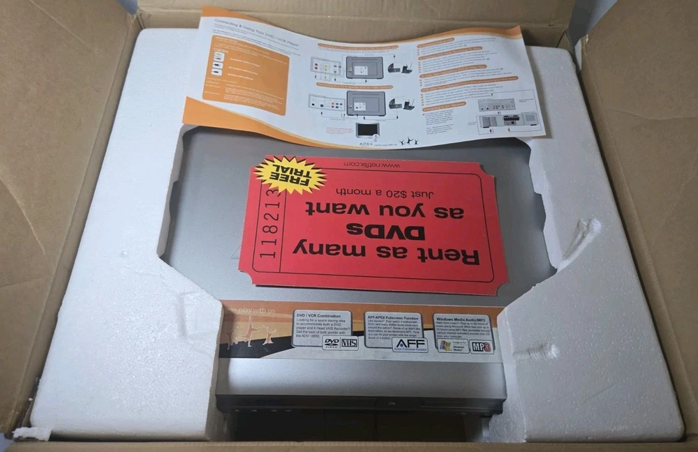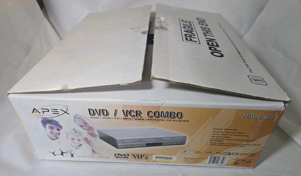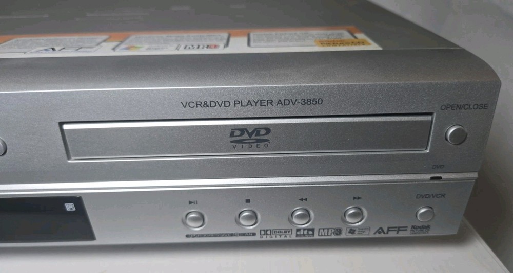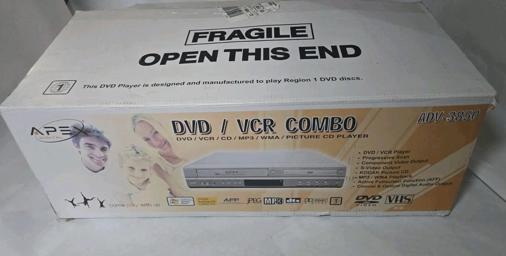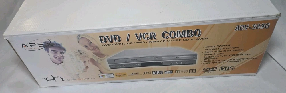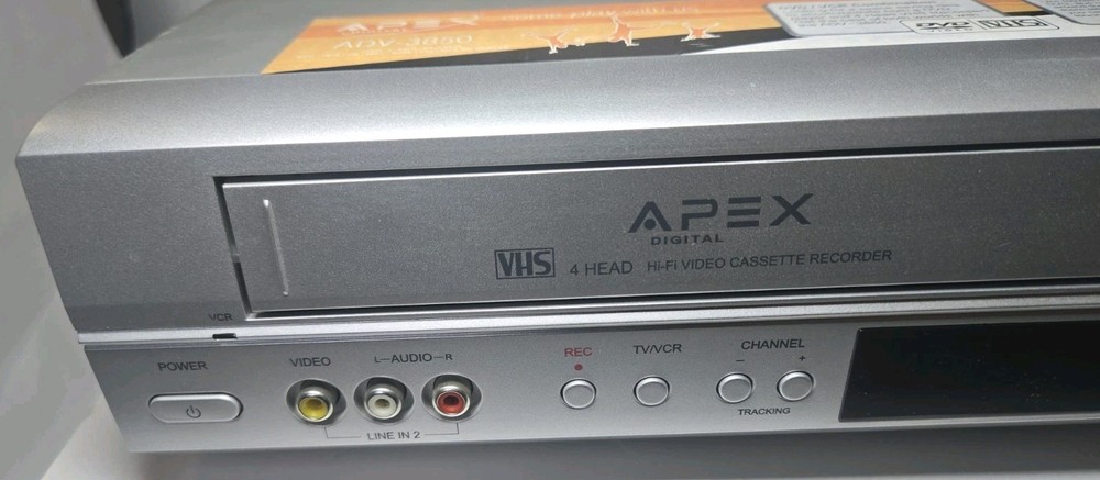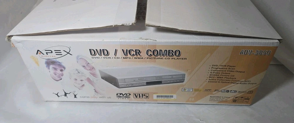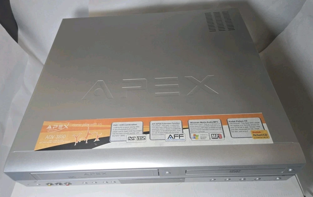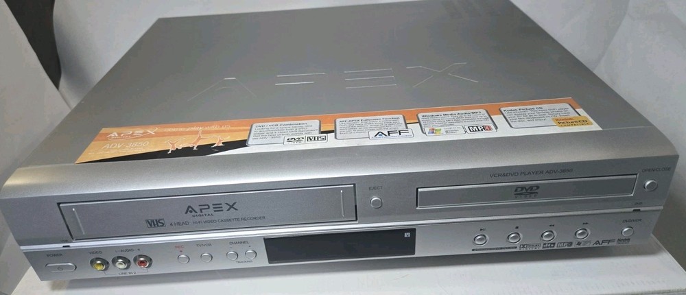The APEX DigitalADV-3850 VCR DVD Combo Player is a versatile device that allows you to play both VHS tapes and DVDs. This player, in sleek silver color, comes with an OEM box, cables, and a remote for convenient usage. With composite video RCA connectivity, you can easily connect to your TV or other devices for a seamless viewing experience. The player's features include the ability to play both DVDs and VHS tapes, making it a great addition to any home entertainment setup. Fully Tested and ready to use! Please reach out with any questions