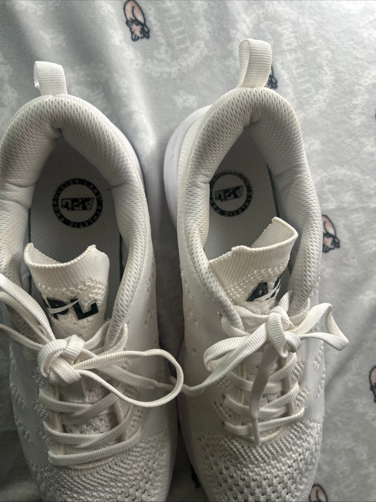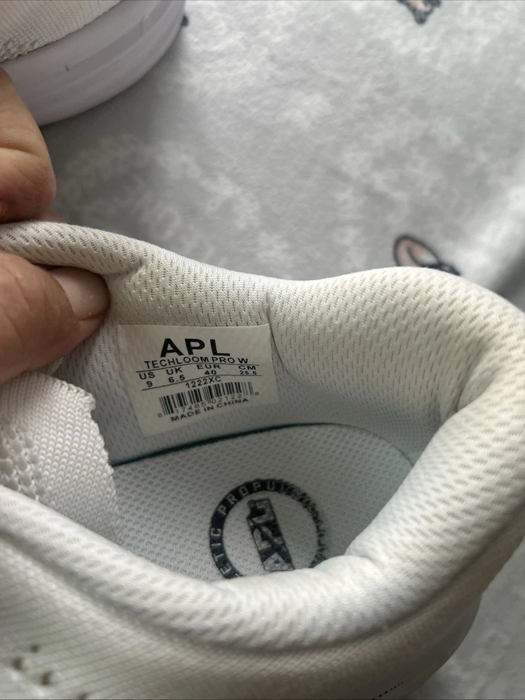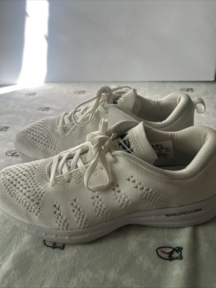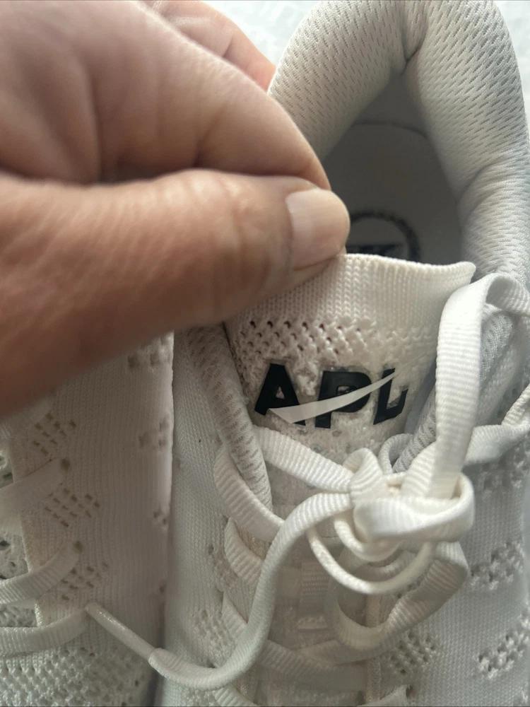 The APL Techloom Pro size9 shoes are a stylish and comfortable choice for women who enjoy running and jogging. With a low top design and lace-up closure, these athletic sneakers are perfect for active occasions. The solid white color with logo accents adds a fashionable touch to the knit fabric lining. These shoes provide a standard shoe width and are ideal for the spring, summer, and fall seasons. The rubber outsole offers durability and support for your active lifestyle.