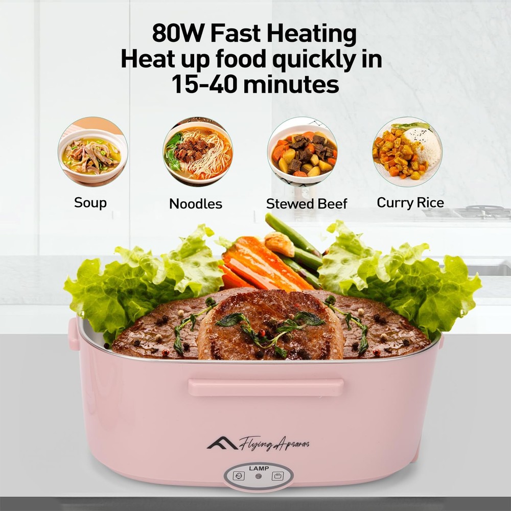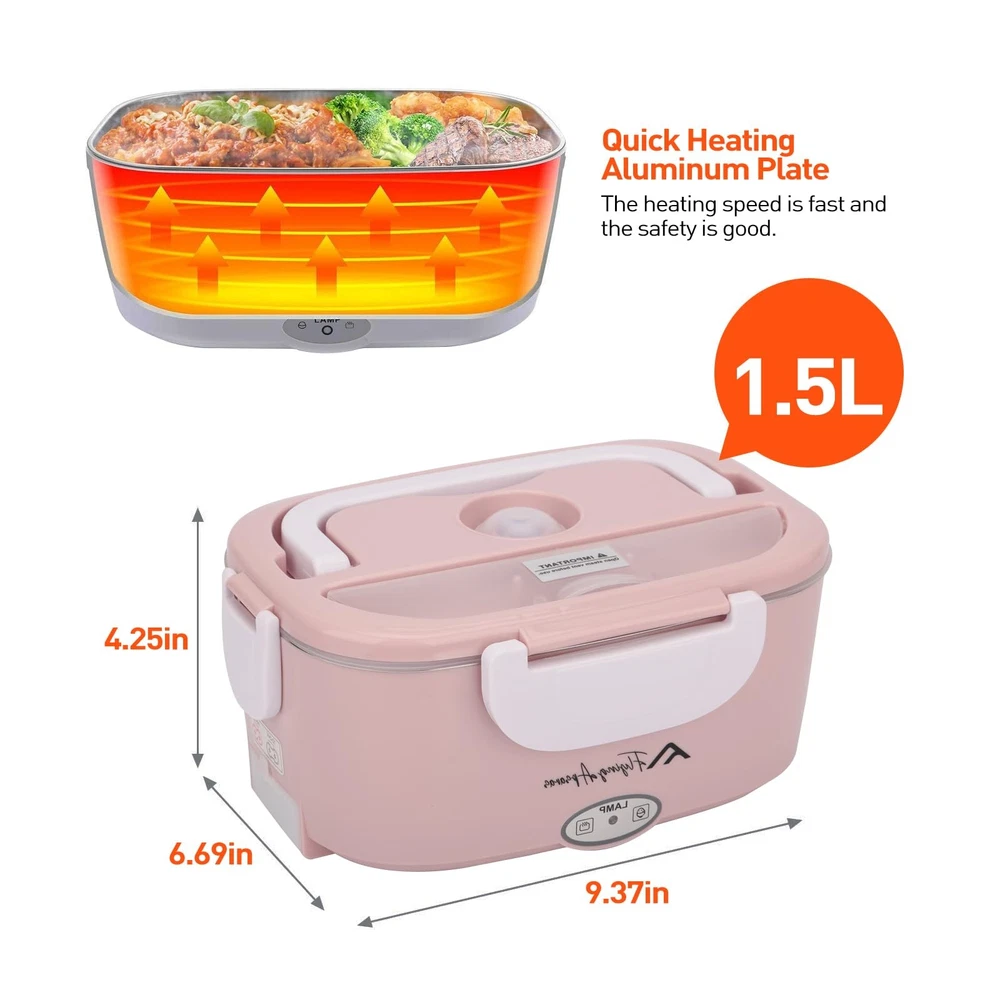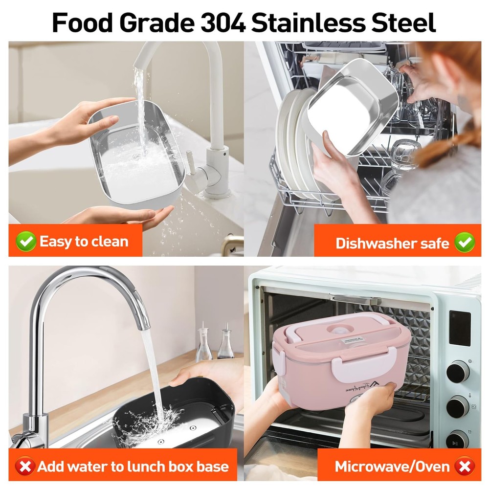Our heated lunch box is made of food-grade PP material and 304 food-grade stainless steel, corrosion-resistant and oxygen-resistant, with improved heat preservation, and the bottom of the heater is designed with an aluminum plate, which ensures even heating by circulating the heat. The electric heated lunch box includes a 1.5L large capacity stainless steel inner tray, a complimentary divider and stainless steel knife and fork, the electric lunch box adds a four-sided locking mechanism to ensure the sealing of the lunch box, and the lid is equipped with an anti-scald handle and stainless steel cutlery built-in storage slot. Heating time is 15-30 minutes, a huge time saver. >>>đA Small USA Businessđ<<< >>> đ Unique Ingeniously Designed by APSARAS USA LLC In Compliance with E.U and F.D.A Standards. đ <<< â ăHIGH-QUALITY MATERIALlăApsara electric lunch box is made from high-quality food grade stainless steel and PP plastic. All electrical components, including charging cables, comply with E.U safety standards, which are more stringent than those in the U.S. The stainless-steel container can be easily cleaned by hand or placed in the dishwasher to save time. The heating base and lid are not dishwasher-safe but can easily be wiped clean. â ă3 in1 LUNCH HEATER ăThe Apsaras electric lunch box/food heater supports 110v, 12v, and 24V power heating, allowing you to conveniently heat your meals at home, in the office, or on the go-whether in your car or truck. It provides constant heating while plugged in, eliminating the need to search for a microwave or wait in line to heat your lunch. â ă60-80W FAST HEATINGăThe Apsaras electric lunch box uses PTC constant temperature heating technology and low-consumption heat cycle to maintain food at an idea temperature in 20-30 minutes while preserving its moisture. It operates silently, with no water vapor release or odor. With this enhanced feature, you can experience more efficient heating, ensuring your meals are ready in no time. Say goodbye to cold sandwiches or fast food â now you can enjoy a hot, homemade meal anytime and anywhere. â ăLEAK-PROOF DESIGNăApsaras electric lunch box food heater features a four-side locking clasps that securely stabilize the inner base, preventing spills and ensuring a firm hold. The lid is designed with an anti-scald handle for safe handling, and it includes built-in storage for stainless steel cutlery. Perfect for office workers and construction professionals, it keeps soups and sauces, allowing you to enjoy a mess-free, warm meal. â ăLARGE CAPACITYăApsaras electric lunch box comes with a 1.5L capacity stainless steel food container and a 0.45L food-grade plastic compartment, providing a perfect capacity to pack a full meal for you or your loved ones. â ăGRAB-and-GO CARRY HANDLEăApsara electric lunch box features a built- in, sturdy carry handle for easy portability. The included insulated carry bag keeps your lunch box clean and fresh while on the go, protecting your food from bad weather, dust and contamination. â ăALL-IN-ONE PACKAGE ăApsaras electric lunch box comes with one heating base, one stainless steel container, one plastic divder box, one insulated carry bag, one set of stainless steel fork and spoon, one car power cord, one office/home power cord and one instruction manual. All this in one package ensures the lunch box is ready to use from day one. â Apsaras USA a small USA Business that believes in providing customers with the best-quality products. If you find that the lunch box cannot be heated or has any other issues after receiving it, feel free to contact us. We offer a 30-day money-back guarantee and a 12-month replacement warranty.