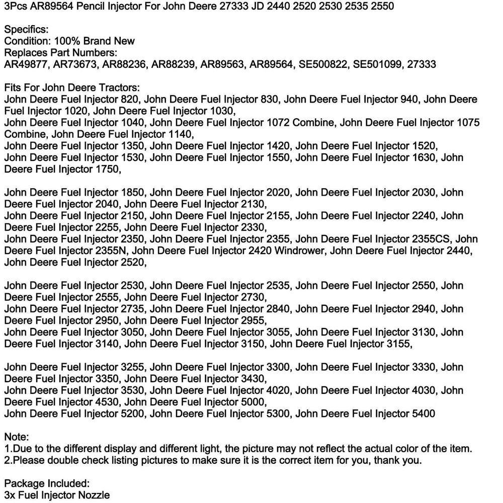 You may also like 1/2/4Sets Fuel Injector RE36939 For John Deere 3029D 4039D 4045D 6059D 6068 35.85 USD Free shipping SA-3405T 366-07197 1502-12C7U2B2S1 12V Fuel Shutoff Solenoid For Lister Petter 48.85 USD Free shipping 1/6Sets 8N7005 For Cat Caterpillar Fuel Injector Pencil Nozzle 3304 3306 Engine 48.85 USD Free shipping 4Pcs 9L6969 Pencil Fuel Injector For CAT Caterpillar 22762 3204 3208 Diesel 155.85 USD Free shipping Carburetor For Massey Ferguson To35 35 40 50 F40 50 135 450 202 204 533969M91 56.85 USD Free shipping Carburetor Carb Repair Kit For International Farmall Cub Tractor 63349C91 15.85 USD Free shipping Solenoid Valve Assembly 25/220994 25220994 Fits For JCB Backhoe Parts 3CX 4CX 63.85 USD Free shipping Fuel Shut Off Solenoid 17208-60015 For Kubota D905 D1005 D1105 17208-60010 32.85 USD Free shipping 2Pcs 9L6969 Pencil Fuel Injector For CAT Caterpillar 22762 3204 3208 Diesel 80.85 USD Free shipping 6670602 Fuel Shut Off Solenoid Valve For Bobcat Loader(s) 463 553 S70 S100 12V 38.85 USD Free shipping For Caterpillar Cat 216 226 236 246 Skid Steer Fuel Shut Off Solenoid 2848A278 . 26.85 USD Free shipping EAE9510C Carburetor For Ford Jubilee NAA NAB Tractor 600 620 660 700 740 800 33.85 USD Free shipping 3Pcs AR89564 Pencil Injector For John Deere 27333 JD 2440 2520 2530 2535 2550 Specifics: Condition: 100% Brand New Replaces Part Numbers: AR49877, AR73673, AR88236, AR88239, AR89563, AR89564, SE500822, SE501099, 27333 Fits For John Deere Tractors: John Deere Fuel Injector 820, John Deere Fuel Injector 830, John Deere Fuel Injector 940, John Deere Fuel Injector 1020, John Deere Fuel Injector 1030, John Deere Fuel Injector 1040, John Deere Fuel Injector 1072 Combine, John Deere Fuel Injector 1075 Combine, John Deere Fuel Injector 1140, John Deere Fuel Injector 1350, John Deere Fuel Injector 1420, John Deere Fuel Injector 1520, John Deere Fuel Injector 1530, John Deere Fuel Injector 1550, John Deere Fuel Injector 1630, John Deere Fuel Injector 1750, John Deere Fuel Injector 1850, John Deere Fuel Injector 2020, John Deere Fuel Injector 2030, John Deere Fuel Injector 2040, John Deere Fuel Injector 2130, John Deere Fuel Injector 2150, John Deere Fuel Injector 2155, John Deere Fuel Injector 2240, John Deere Fuel Injector 2255, John Deere Fuel Injector 2330, John Deere Fuel Injector 2350, John Deere Fuel Injector 2355, John Deere Fuel Injector 2355CS, John Deere Fuel Injector 2355N, John Deere Fuel Injector 2420 Windrower, John Deere Fuel Injector 2440, John Deere Fuel Injector 2520, John Deere Fuel Injector 2530, John Deere Fuel Injector 2535, John Deere Fuel Injector 2550, John Deere Fuel Injector 2555, John Deere Fuel Injector 2730, John Deere Fuel Injector 2735, John Deere Fuel Injector 2840, John Deere Fuel Injector 2940, John Deere Fuel Injector 2950, John Deere Fuel Injector 2955, John Deere Fuel Injector 3050, John Deere Fuel Injector 3055, John Deere Fuel Injector 3130, John Deere Fuel Injector 3140, John Deere Fuel Injector 3150, John Deere Fuel Injector 3155, John Deere Fuel Injector 3255, John Deere Fuel Injector 3300, John Deere Fuel Injector 3330, John Deere Fuel Injector 3350, John Deere Fuel Injector 3430, John Deere Fuel Injector 3530, John Deere Fuel Injector 4020, John Deere Fuel Injector 4030, John Deere Fuel Injector 4530, John Deere Fuel Injector 5000, John Deere Fuel Injector 5200, John Deere Fuel Injector 5300, John Deere Fuel Injector 5400 Note: 1.Due to the different display and different light, the picture may not reflect the actual color of the item. 2.Please double check listing pictures to make sure it is the correct item for you, thank you. Package Included: 3x Fuel Injector Nozzle -About US Founded in 2012, VIPJQ have professional development and sales, and are involved in various products, providing customers with various high-quality products. Since its establishment, VIPJQ has always adhered to the service concept of "customer first" and the management concept of "pursuit of quality", and is committed to providing customers with high-quality original designs. We commit to provide you the best innovative, quality products & professional services with competitive prices. We value every customer, and we look forward to providing solutions for your business needs to help your business achieve its goals, please contact us immediately! We are all about you! We are a Japanese seller,but with large warehouse in USA. We are profesional on Auto Parts,Car Parts,Motorcycle Parts,3C,other hot sale items and so on. We aim to provide to customers high quality product and best service. -About Shipment&Returns The item usually will be dispatched within 3 days after you ordered.All are free shipping. And it usually takes 3-10 working days to delivery depends on buyers' address or other majeure on the way. If you are not satisfied with the items and want to return the item,we hope you could message us first,we will give you the return details, we think we could give you the best service to save your time and money.Thank you. -About Feedback&Customer Service If you are enjoy your shopping here,not only enjoy the items but also the service,we are appreciate you could give us a 5-star feedback. If you are not satisfied with the item,before you give us the negative feedback,we hope we could give you the best solution through our commutication. We think we could do it if you give us the chance.Thank you.