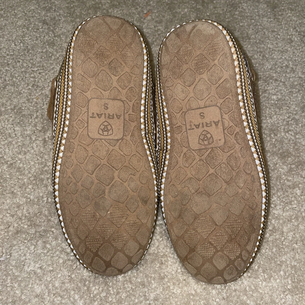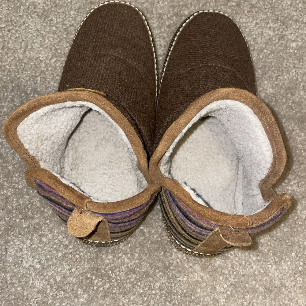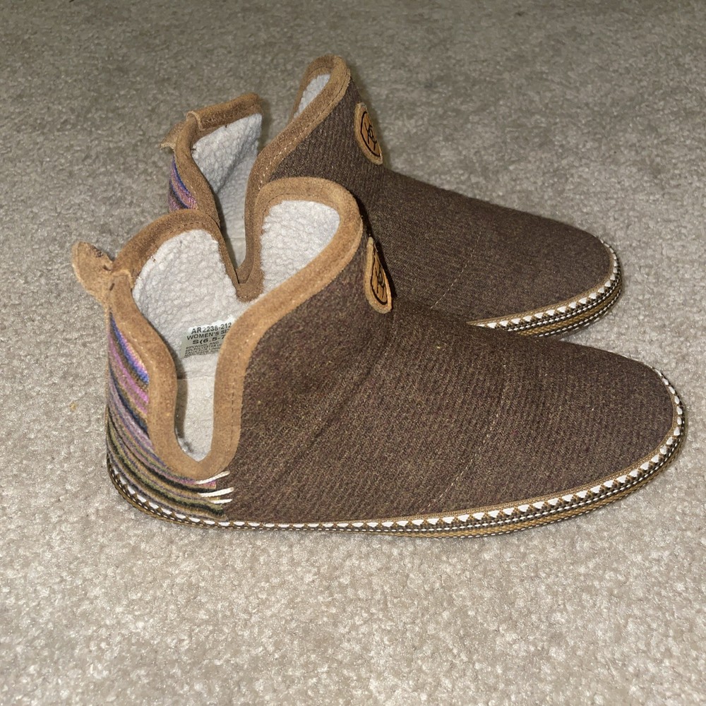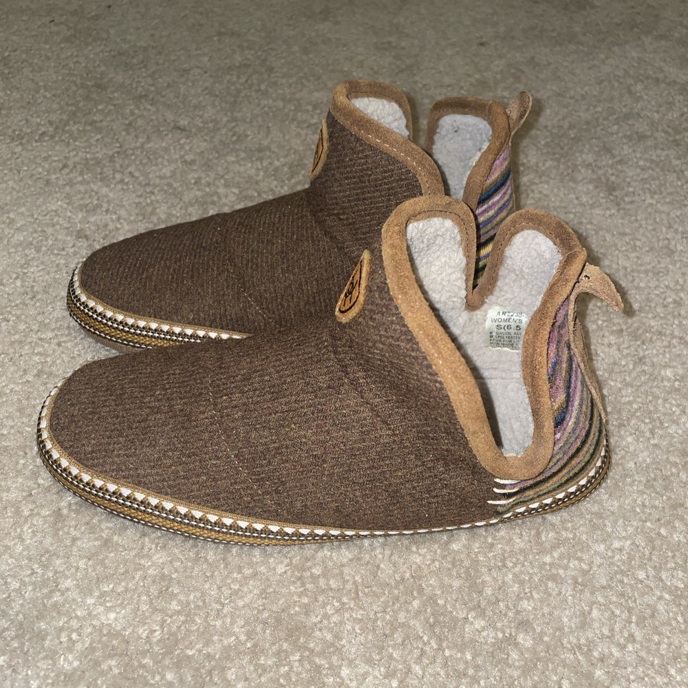 Type: Slipper Upper Material: Wool Fabric Type: Fleece Brand: Ariat Color: Brown Department: Women Style: Bootie US Shoe Size: 6.5-7 Features: Lined