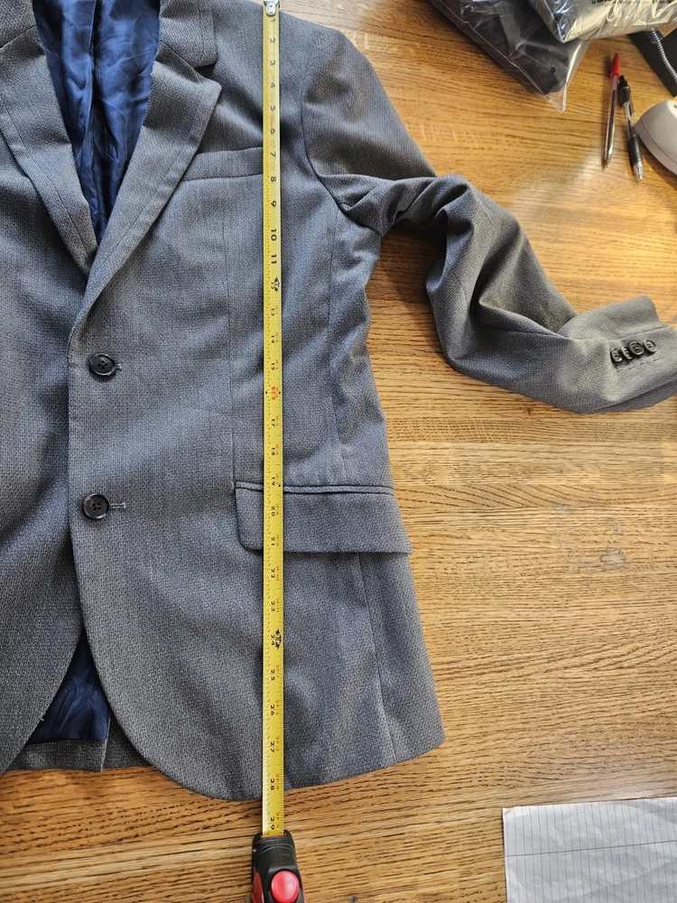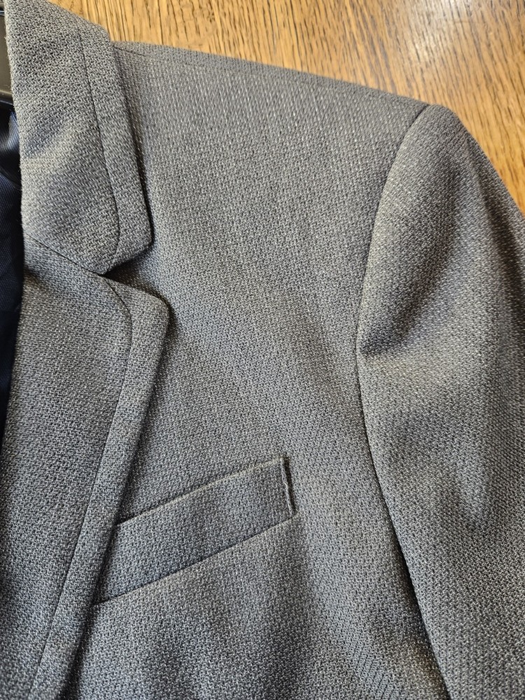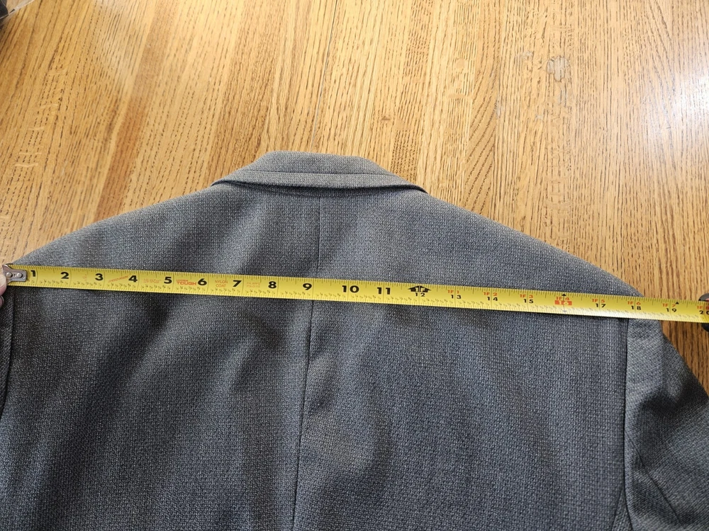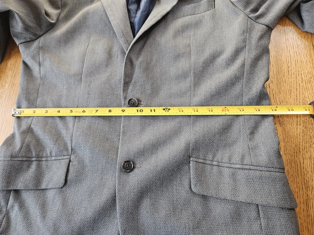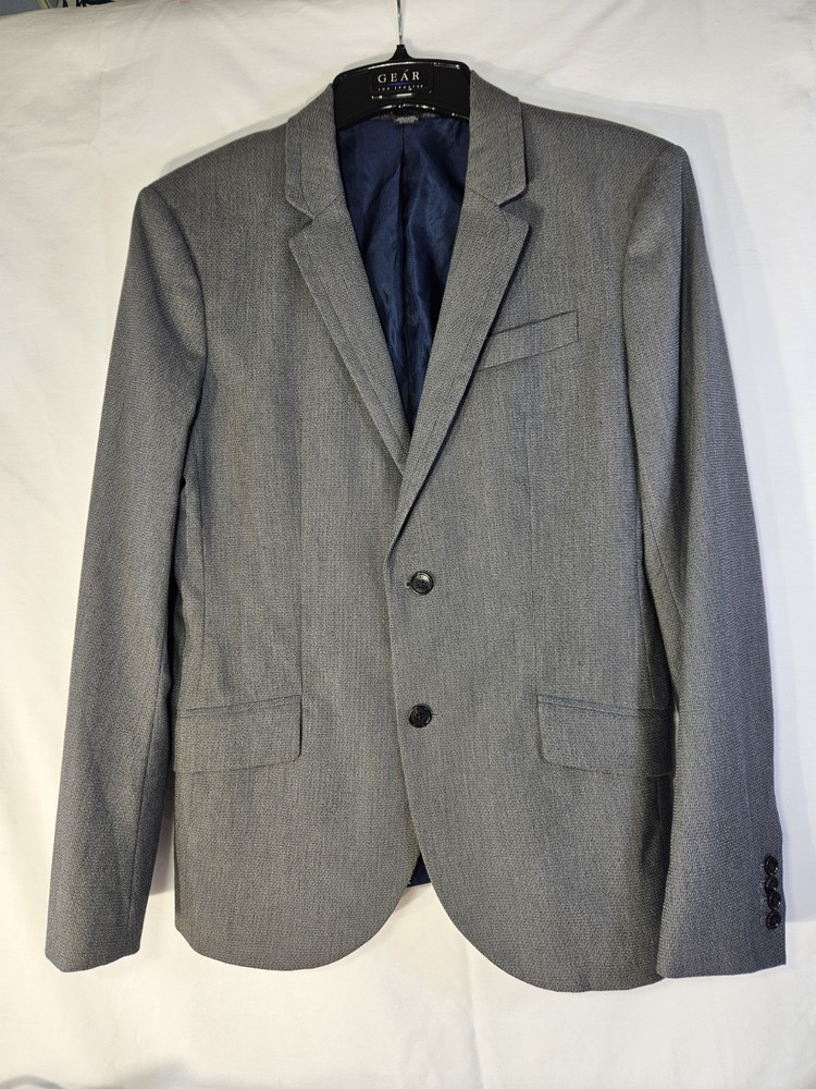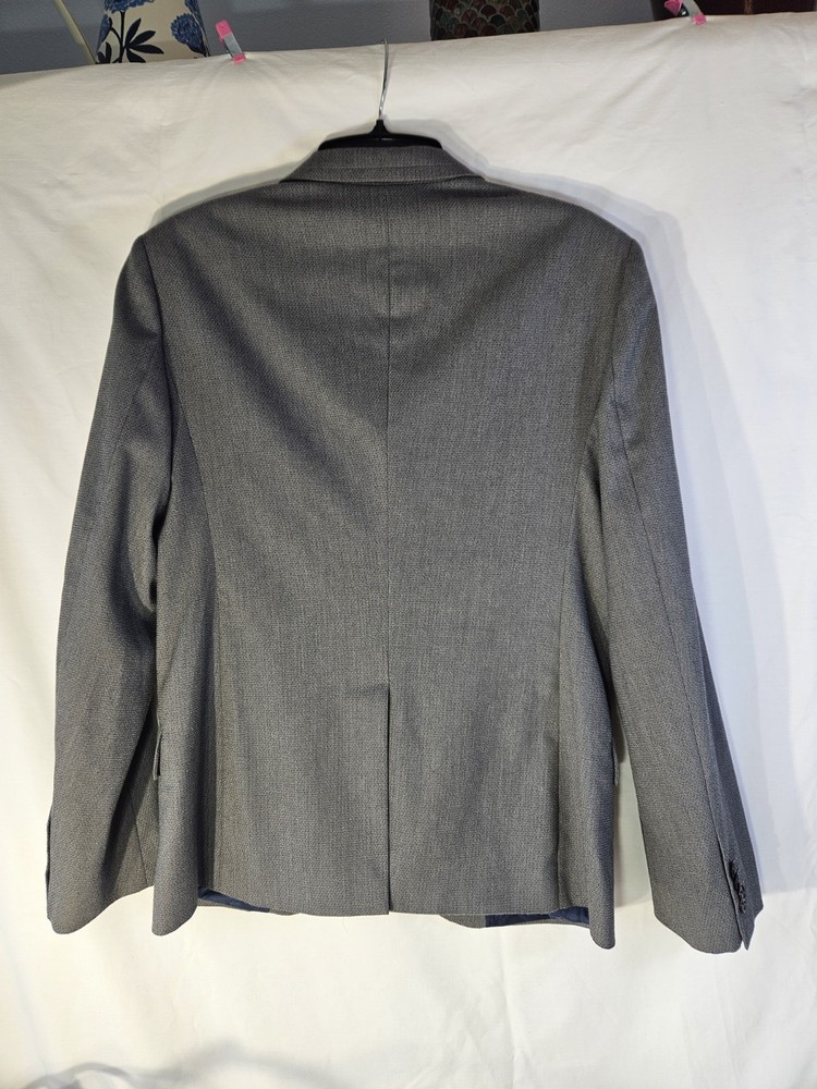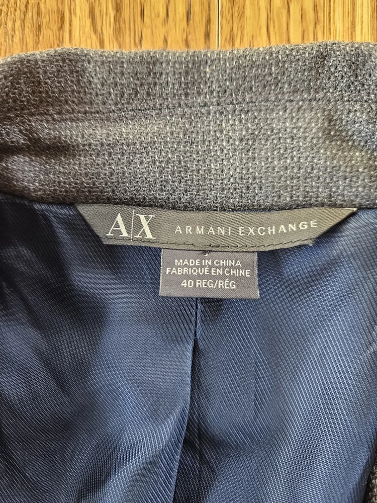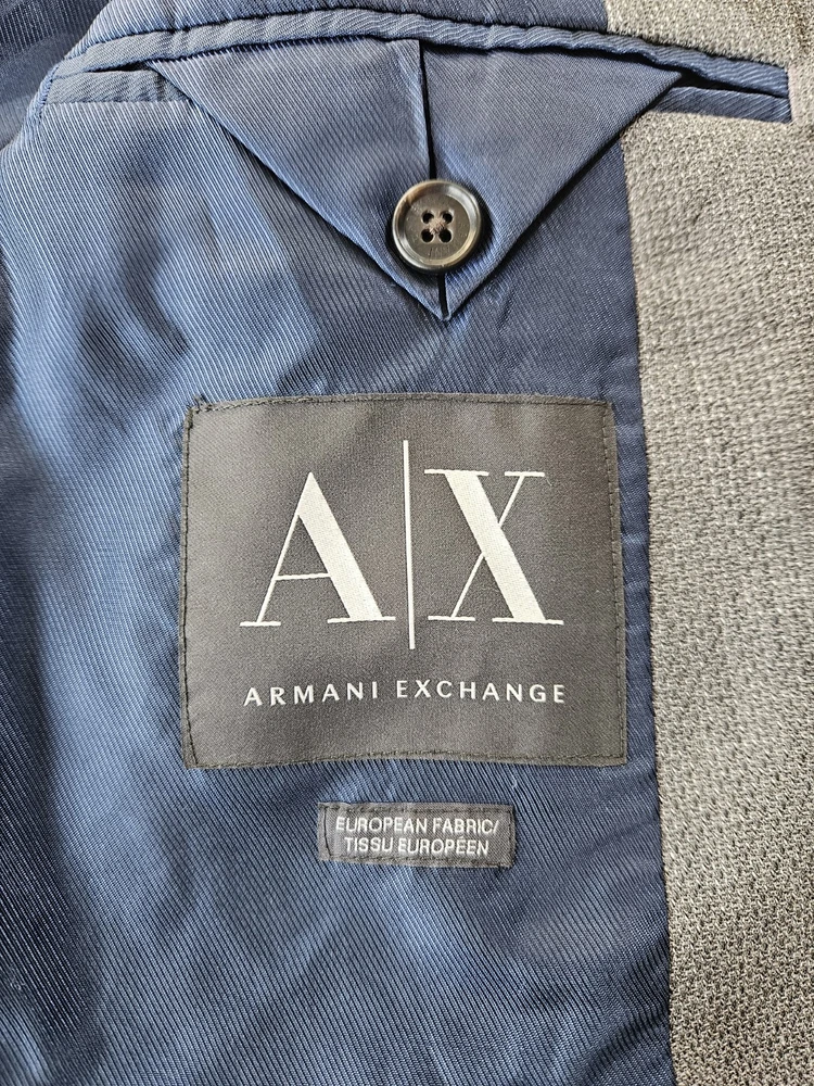 Chest Size: 40 Handmade: No Type: Suit Jacket Fit: Regular Jacket/Coat Length: Regular Jacket Cut: Single-Breasted Pattern: Solid Leg Style: Straight Vintage: No Jacket Lapel Style: Notch Front Type: Flat Front Size: 40 Brand: Armani Exchange Jacket Vent Style: Double-Vented Jacket Front Button Style: Two-Button Color: Gray Country/Region of Manufacture: Italy Size Type: Regular Features: Inner Pockets, Stretch Style: Blazer Garment Care: Dry Clean Only Jacket Sleeve Button Style: Four-Button Department: Men Material: 98% Wool, 2% Elastane, Wool Personalize: No Occasion: Business, Wedding