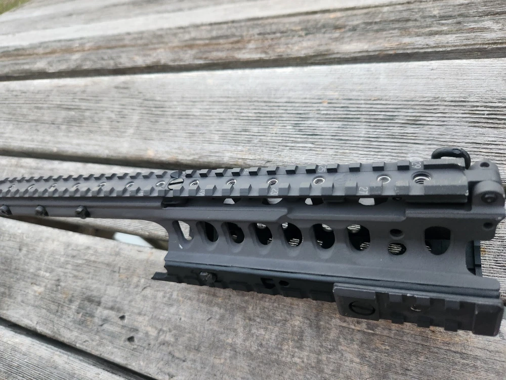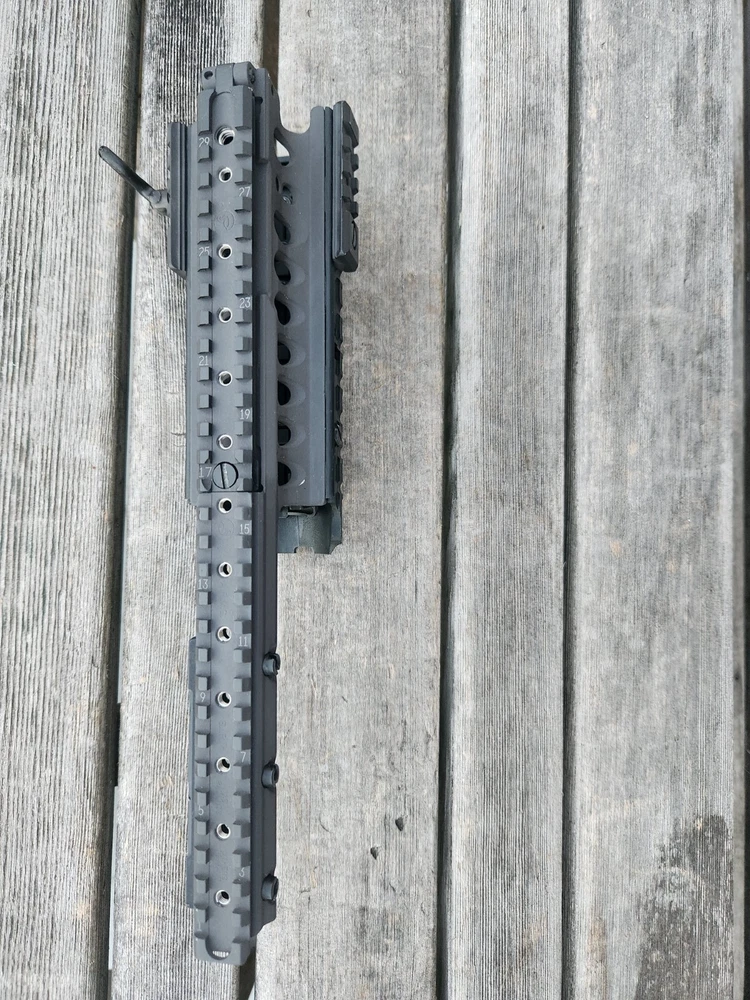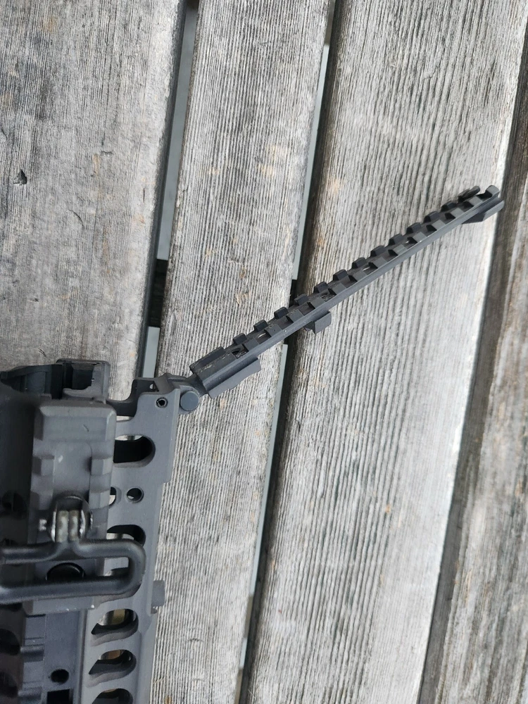 very hard to find ARMS 45C rail and mount. also has a PEQ-2 flip up section! these rail are very sought after. A.R.M.S flat top mount. Carbine length rail. all hardware is present to mount. look at photos for description and condition. thank you!