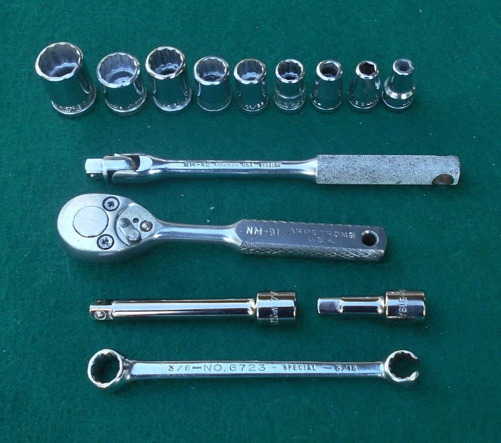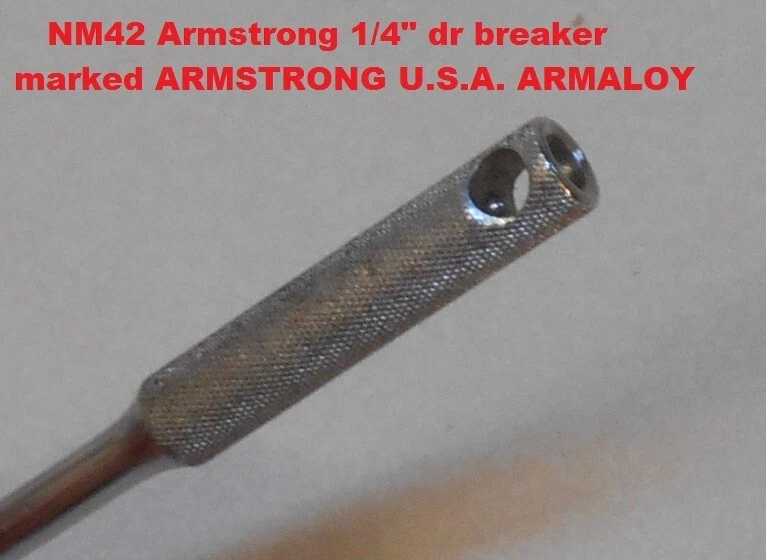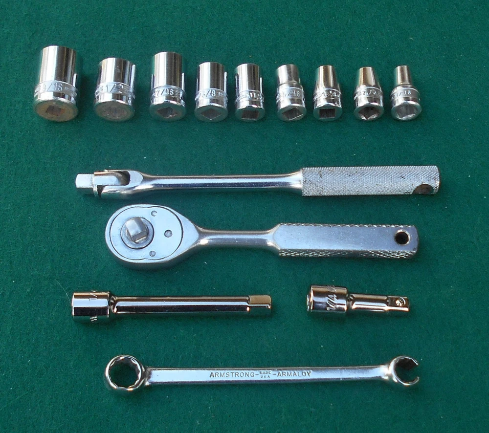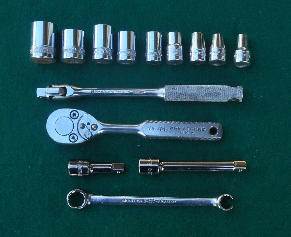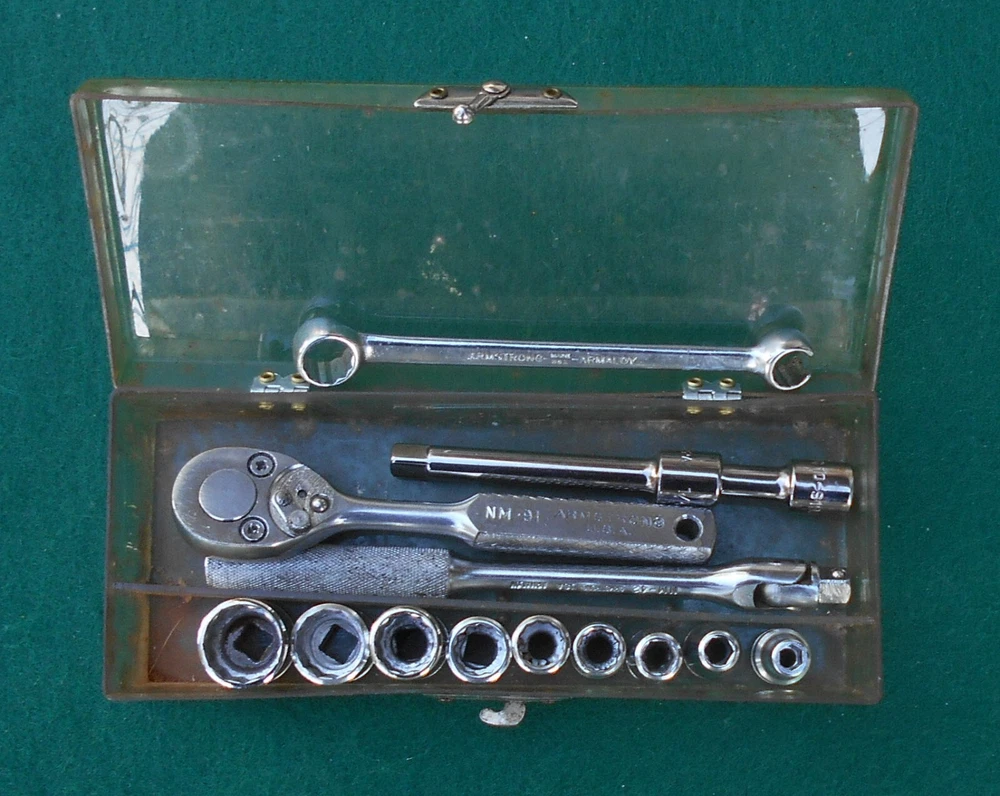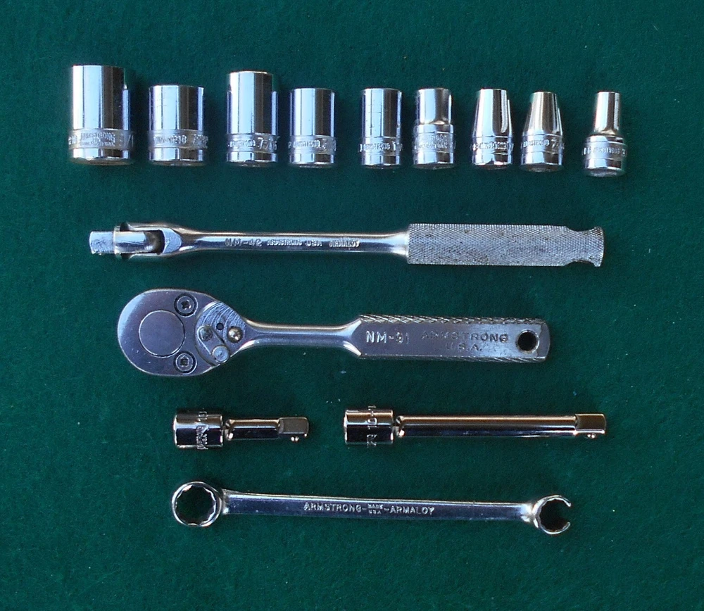 ARMSTRONG 14 piece 1/4" drive SAE Socket Wrench Set with Box manufactured by Armstrong Bros., Chicago, Illinois * this set contains: NM606 3/16" 6-point marked ARMSTRONG ** NM607 7/32" " NM608 1/4" " NM1210 5/16" 12-point marked ARMSTRONG MADE IN USA NM1211 11/32" 12-point marked ARMSTRONG NM1212 3/8" " NM1214 7/6" " NM1216 1/2" 12-point marked ARMSTRONG MADE IN USA ARMALOY NM1218 9/16" 12-point marked ARMSTRONG MADE IN USA ARMALOY (with logo) 10-919A 1-inch extension marked ARMSTRONG 1/4 10-922A 3-inch extension marked ARMSTRONG USA 1/4 NM42 6-inch flex handle (breaker bar) marked ARMSTRONG U.S.A. ARMALOY NM91 Oval-Head Ratchet marked ARMSTRONG U.S.A. 6723 3/8" 12-pt box wrench x 5/16" 12-pt flare nut wrench marked ARMSTRONG MADE IN USA SPECIAL * the 10-919A one-inch extension and the 10-922A three-inch extension are not original to the set, and are of later production than the other (original) pieces in the set - presumably manufactured after the acquisiton of Armstrong by the Apex group. they are both add-ons to the set and are NOS. - Several of the pieces in the set have light engraving marks from a previous owner. (looks like "EH" or "LH") - No chips, cracks, peeling chrome, and nothing is rounded out. - The box, as odd as it is, came with the set. I have no idea if it's original. Works fine. Latch is very cool. - I have no clue on the wrench. 5/16" flare nut? Marked "Special". - I found another Armstrong 1/4" dr 5/16" 12-pt socket in another box and I'm tossing it in with the deal here. ** there are TWO NM606 3/16" sockets in this set. 07/31/24 - Ratchet works just fine. - Exceptionally well-made tools with lustrous chrome in excellent condition. This item is sold as is. There is no guarantee or warranty, either express or implied, regarding merchantability or fitness for a particular use or purpose. All sales are final. No returns, no exchanges, no cancellations, no refunds. I ship only to destinations within the 50 U.S. States, and only to buyers who pay immediately through PayPal. These terms are expressly in lieu of any and all other terms, "user agreements", or "terms of use", and no party has the authority to vary or extend them. Bidding on this item or clicking "Buy Now" indicates your full agreement with seller's terms.
