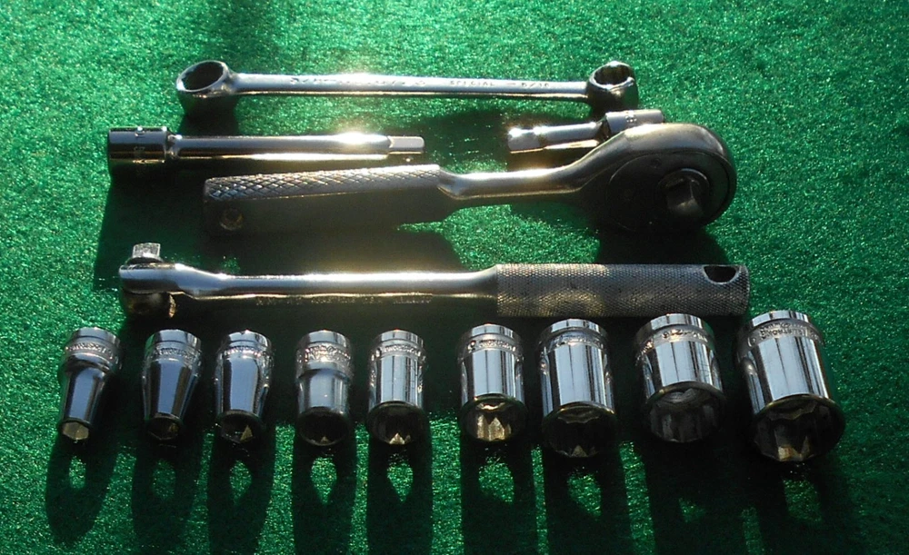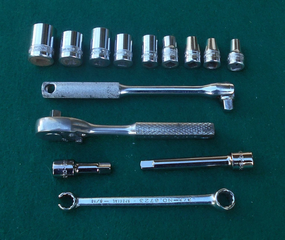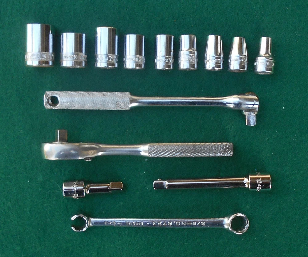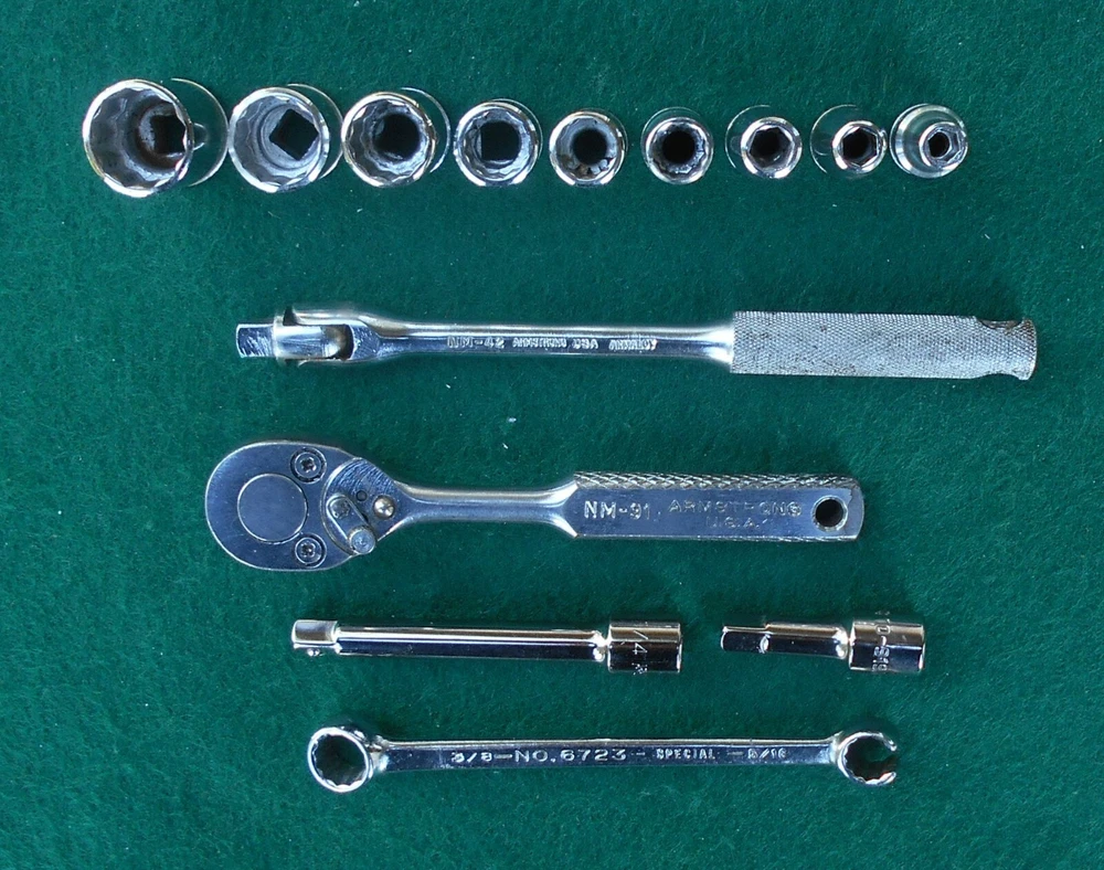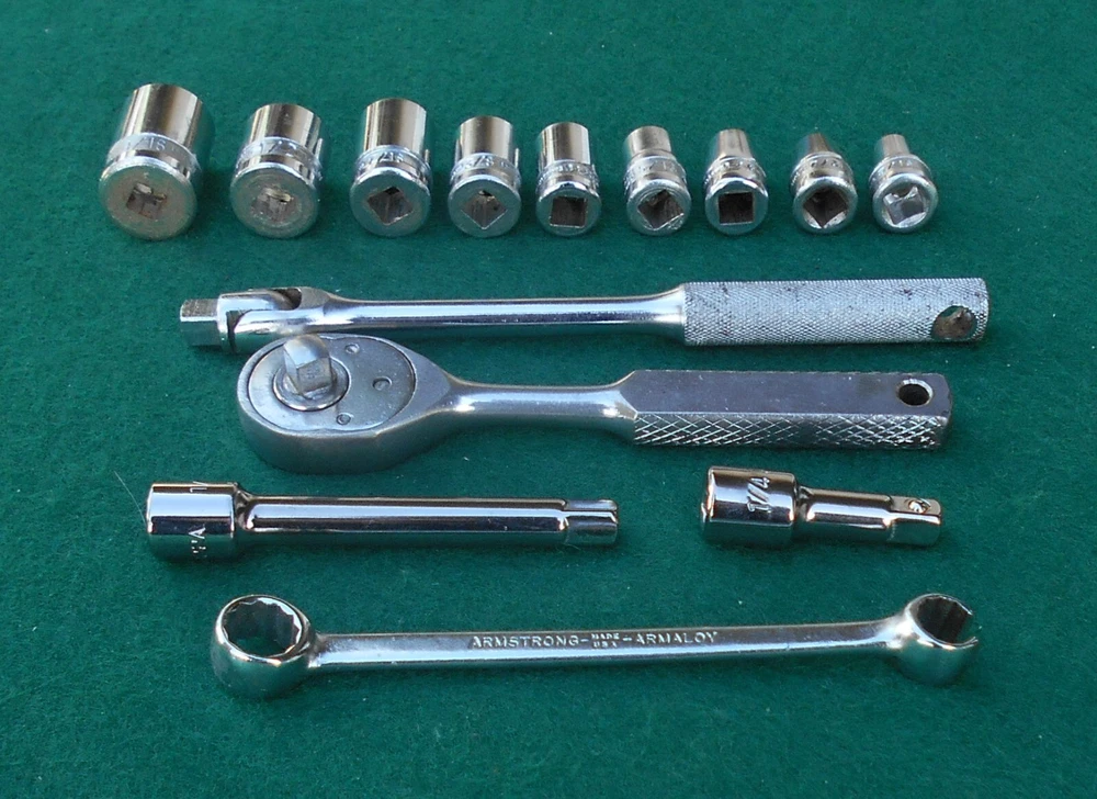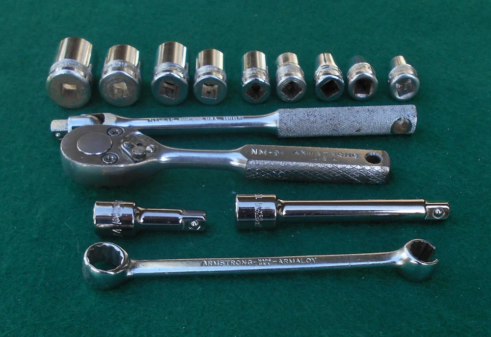 ARMSTRONG 14 piece 1/4" drive SAE Socket Wrench Set with Box manufactured by Armstrong Bros., Chicago, Illinois * this set contains: NM606 3/16" 6-point marked ARMSTRONG ** NM607 7/32" " NM608 1/4" " NM1210 5/16" 12-point marked ARMSTRONG MADE IN USA NM1211 11/32" 12-point marked ARMSTRONG NM1212 3/8" " NM1214 7/6" " NM1216 1/2" 12-point marked ARMSTRONG MADE IN USA ARMALOY NM1218 9/16" 12-point marked ARMSTRONG MADE IN USA ARMALOY (with logo) 10-919A 1-inch extension marked ARMSTRONG 1/4 10-922A 3-inch extension marked ARMSTRONG USA 1/4 NM42 6-inch flex handle (breaker bar) marked ARMSTRONG U.S.A. ARMALOY NM91 Oval-Head Ratchet marked ARMSTRONG U.S.A. 6723 3/8" 12-pt box wrench x 5/16" 12-pt flare nut wrench marked ARMSTRONG MADE IN USA SPECIAL * the 10-919A one-inch extension and the 10-922A three-inch extension are not original to the set, and are of later production than the other (original) pieces in the set - presumably manufactured after the acquisiton of Armstrong by the Apex group. they are both add-ons to the set and are NOS. - Several of the pieces in the set have light engraving marks from a previous owner. (looks like "EH" or "LH") - No chips, cracks, peeling chrome, and nothing is rounded out. - The box, as odd as it is, came with the set. I have no idea if it's original. Works fine. Latch is very cool. - I have no clue on the wrench. 5/16" flare nut? Marked "Special". - I found another Armstrong 1/4" dr 5/16" 12-pt socket in another box and I'm tossing it in with the deal here. ** there are TWO NM606 3/16" sockets in this set. 07/31/24 - Ratchet works just fine. - Exceptionally well-made tools with lustrous chrome in excellent condition. This item is sold as is. There is no guarantee or warranty, either express or implied, regarding merchantability or fitness for a particular use or purpose. All sales are final. No returns, no exchanges, no cancellations, no refunds. I ship only to destinations within the 50 U.S. States, and only to buyers who pay immediately through PayPal. These terms are expressly in lieu of any and all other terms, "user agreements", or "terms of use", and no party has the authority to vary or extend them. Bidding on this item or clicking "Buy Now" indicates your full agreement with seller's terms.