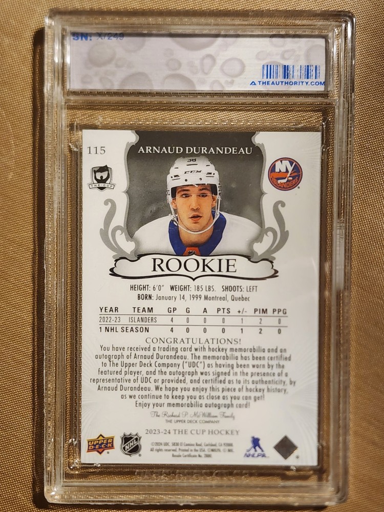 2023-24 Upper Deck The Cup Arnaud Durandeau RPA 016/249 of the New York Islanders