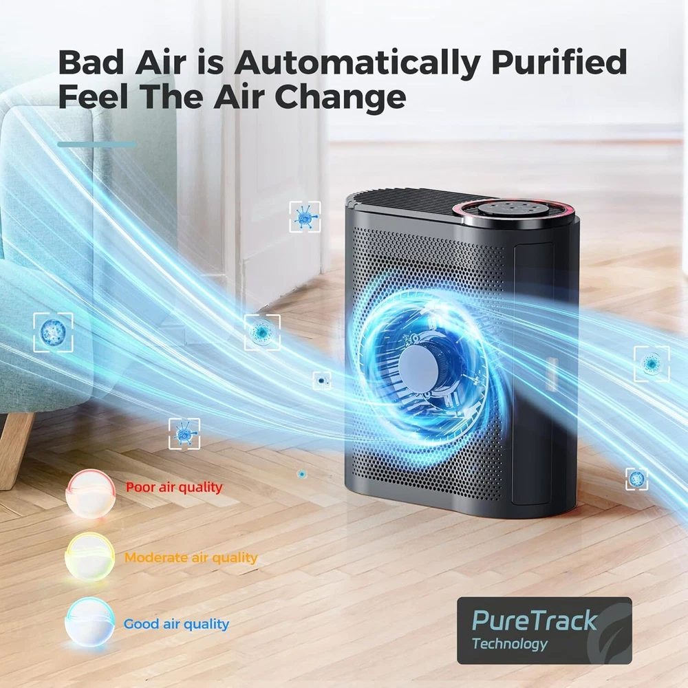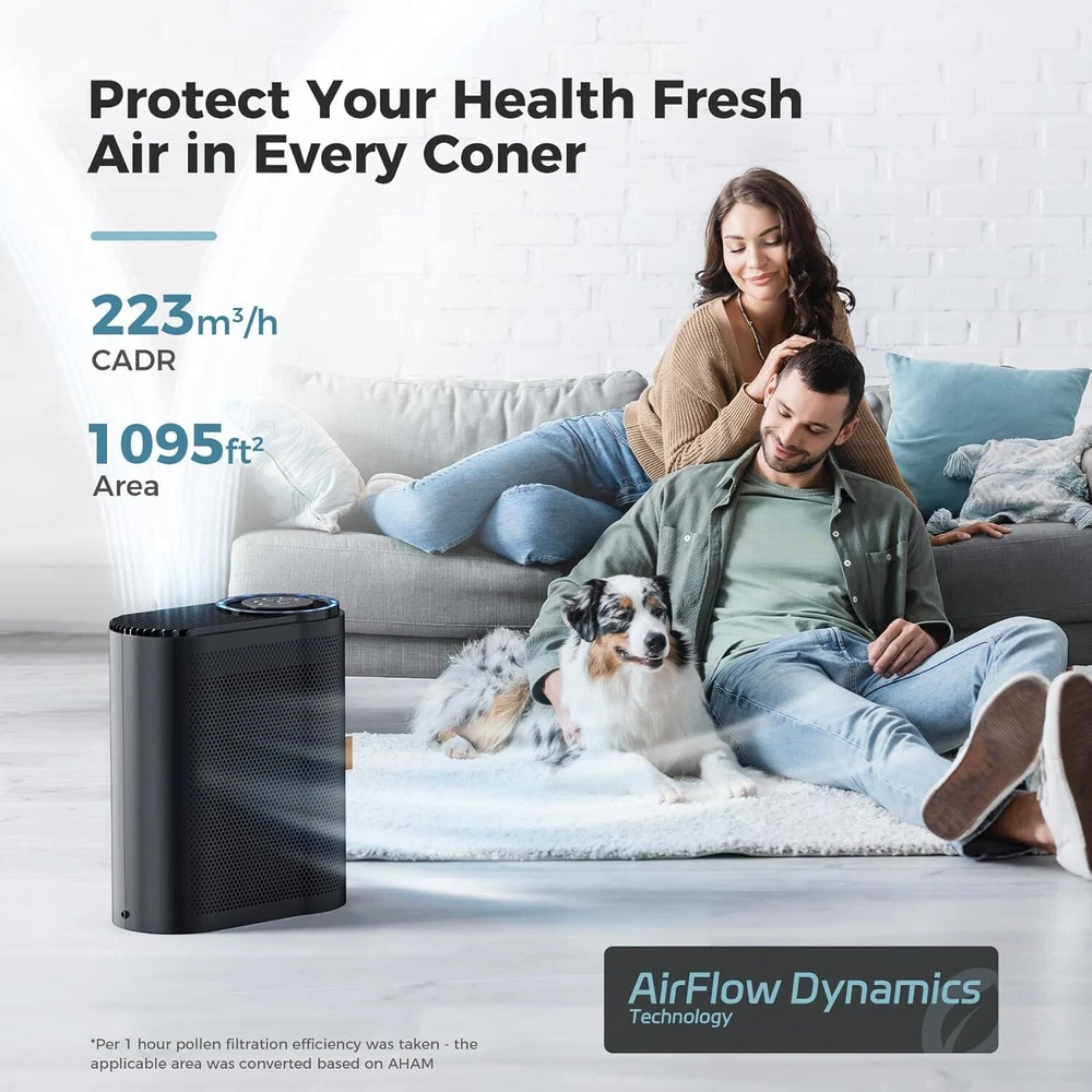 AROEVE Air Purifiers for Home Large Room Up to 1095 Sq.Ft Coverage with Black Product Details Color: Black Brand: AROEVE Product Dimensions: 7.5"D x 13.5"W x 17.25"H Floor Area: 1095 Square Feet Specification Met: ETL Certified Noise Level: 22 dB Particle Retention Size: 12 minutes Controller Type: Button Control Manufacturer: AROEVE Item Weight: 5.42 pounds Item model number: MK04 Care instructions: Before use for the first time, please take out the filter to unpack it, then fit it back. Assembly required: No Number of pieces: 1 Batteries required: No Included Components: Filter Power SourceItem Weight: ac5.42 Pounds Control MethodFilter Type: TouchFilter Impressive Filtration: Equipped with a impressive filtration system, our air cleaner can filter particles in the air. When you turn on the air purifier, it can refresh the air in a room as large as 1095 sq ft / 100 m² every hour, providing you with a new and comfortable air environment throughout the day in your home or office. Dual Air Treatment: Our air purifier not only uses impressive purification filter to capture particles, but also features a light treatment technology to further purify the air. With this dual treatment system, we provide more comprehensive air purification, ensuring a healthier living environment for you and your family. (Note: The function is turned off by default, please turn it on to maximize the air purifier's performance.) Feel The Air Change: Our air purifier comes equipped with a built-in PM2.5 sensor, so you don't have to play the guessing game with your nose. When the air quality drops, our purifier will go into action and the indicator will turn yellow or red, and the fan will speed up to clean the air faster. Trust us, your lungs will thank you for the break from the dirty air. Your Silent Companion: Ssshh...can you hear that? No, it's not the sound of silence, it's the sound of our air purifier in sleep mode! With low noise and low speed, it's the perfect companion for a good night's sleep. It will not disturb your sweet sleep, and even a light sleep baby can enjoy the comfortable air on a quiet night. Filter Replacement Made Easy: Say goodbye to the hassle of replacing air filters. Our air purifier makes it a breeze! Simply open the filter cover, grab the rope on the side, and voila! You can easily take out or replace the filter inside. We recommend replacing the air filter every 3-6 months to ensure optimal air purification. (Pro tip: For best results, always use the official filter!)