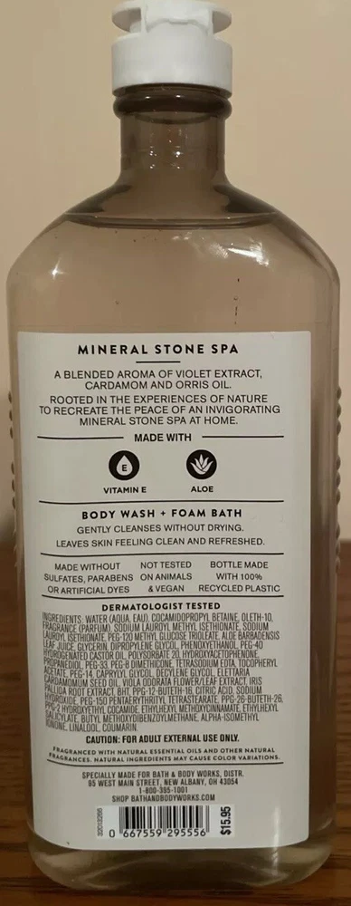 Type:Body Wash + Foam BathFormulation:FoamCountry/Region of Manufacture:United StatesVolume:10 fl ozUPC:0667559295556Size:RegularScent:Violet,cardamom,orris Oilgtin13:0667559295556Body Area:BodyBrand:Bath & Body Works