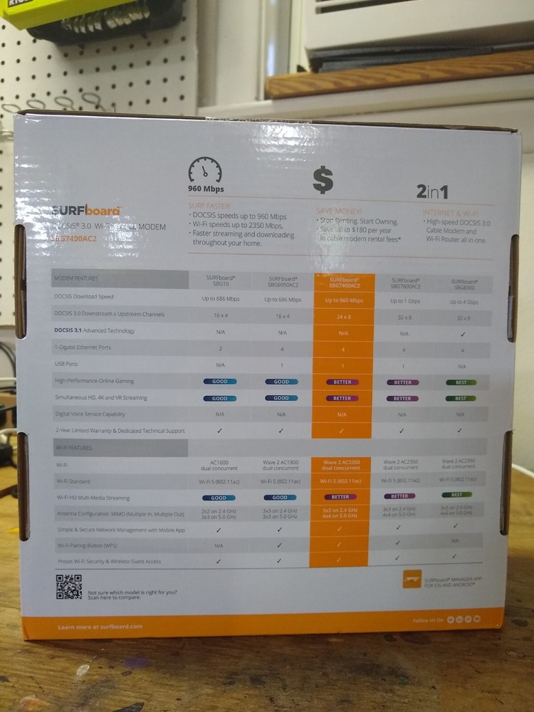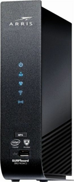 The ARRIS SURFboard 2350 Mbps 4 Port 10000 Mbps Cable Modem and Wi-Fi Router is a high-speed networking device designed for home use. With a maximum LAN data rate of 1000 Mbps and a maximum wireless data rate of 2350 Mbps, this modem and router provide fast and reliable internet connectivity for various devices such as gaming consoles, audio receivers, PCs, television sets, and iPods. The unit features four LAN ports and wireless connectivity with Wi-Fi 802.11ac, making it suitable for gaming and other bandwidth-intensive activities. With a sleek black color and compact dimensions, the ARRIS SURFboard is a versatile and efficient networking solution for modern households.