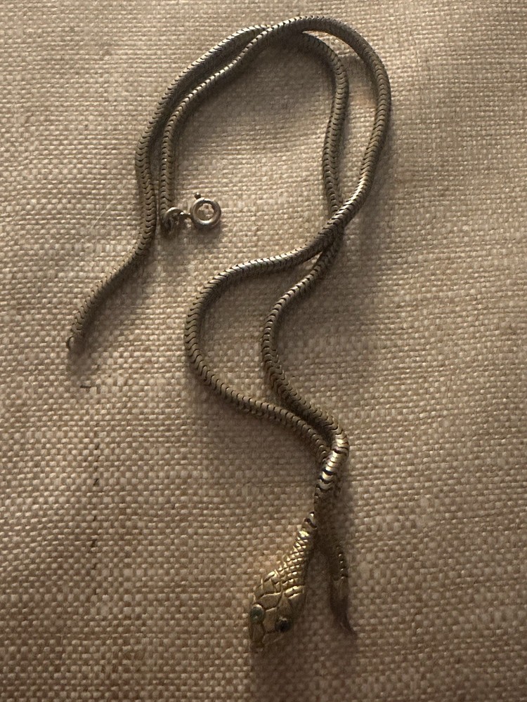 This antique Art Deco gold filled snake chain necklace features glass emerald eyes and measures 14 inches in length, making it a stylish choker necklace for women. Crafted in the United States during the 1930s, this vintage piece is a stunning accessory for a special occasion like an anniversary. With its unique design and original Art Deco style, this necklace is sure to make a statement with its yellow gold filled metal and elegant snake chain. NOTE: one of the glass eyes is missing and is lodged inside the snake head so it is need of repair