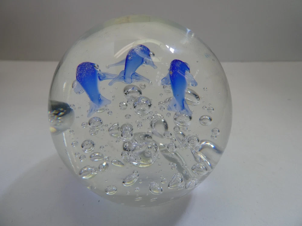 ART GLASS PAPER WEIGHT CASED DOLPHINS & AIR BUBBLES 7.5 CM HIGH GOOD CONDITION SEE PHOTOS FOR BEST GUIDE