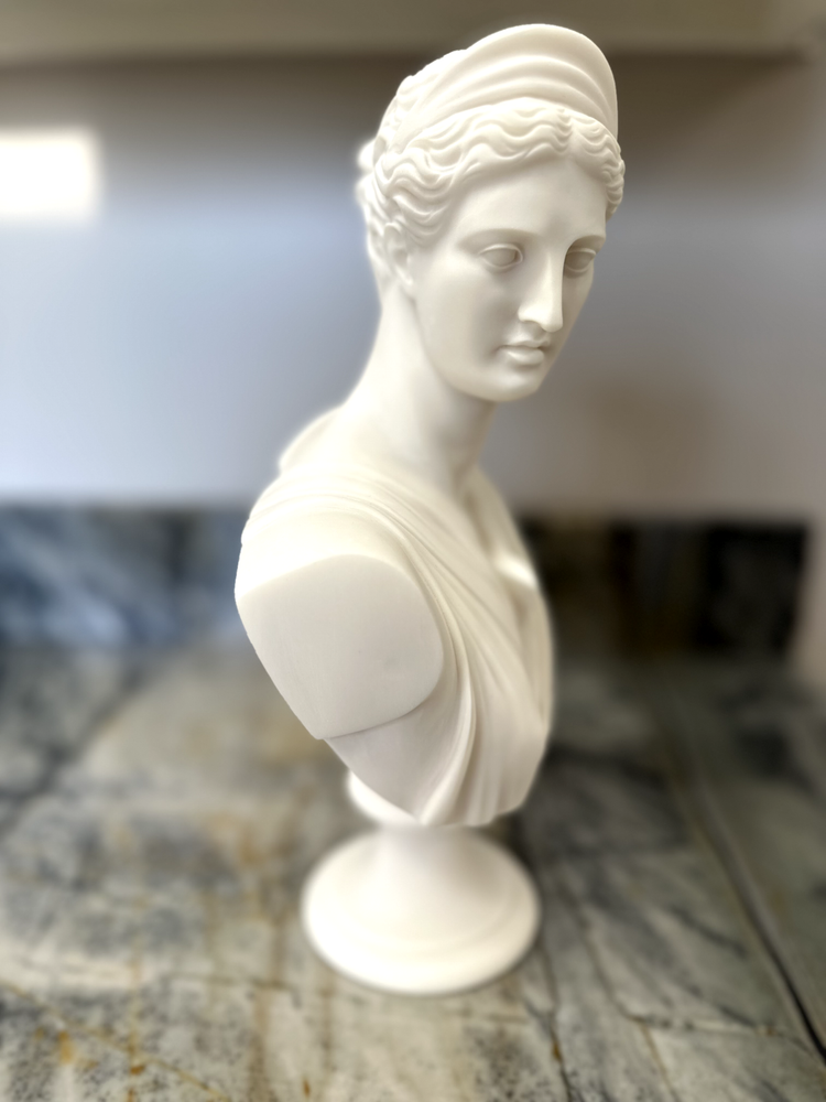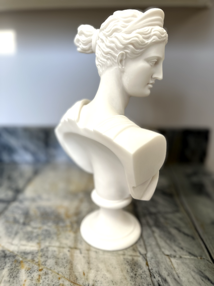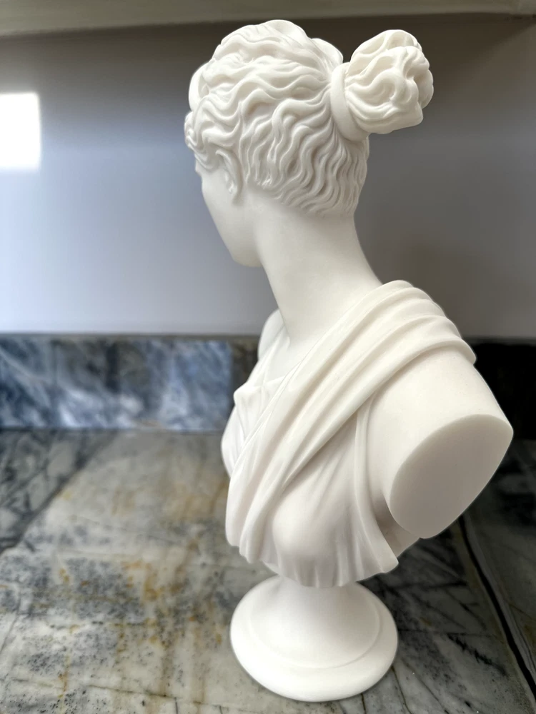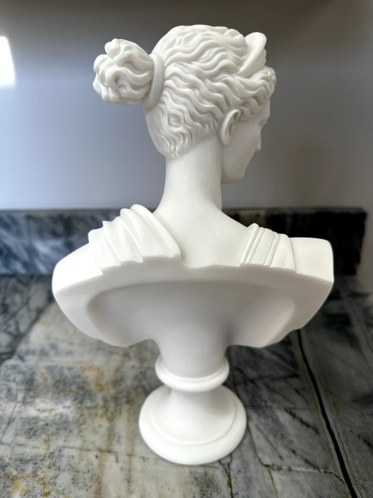 Elevate your space with the Artemis Diana Bust Head Greek Roman Goddess Statue, an exquisite representation of mythological artistry. In Greek mythology, Artemis was the daughter of Zeus and Leto and the twin sister of Apollo. In Roman mythology, she was known as Diana. She was the virgin moon goddess of the hunt, wild animals, healing, wilderness, chastity, and, ironically, childbirth (she was worshipped as a fertility/childbirth goddess mostly in cities). Carved with meticulous attention to detail, this 12.2-inch medium-sized bust brings the enigmatic allure of Greek culture directly to your table. The natural alabaster material provides a cool, understated texture and a touch of timeless elegance. This piece is an ideal addition for collectors and enthusiasts alike who value the intersection of cultures and ethnicities in their décor. Dimensions: Height - 12.2" / Width - 7.48" / Depth - 2.5" Finish: Cast Alabaster Cast Alabaster is a natural crushed stone that gives the feeling of marble; it's a solid, heavy-weight material that is water-resistant. It was first cast from a mold and finished by hand to ensure the finest quality. Made in Crete, Greece ******** I am a brand new seller on eBay, however you may contact me for FBMP reviews.