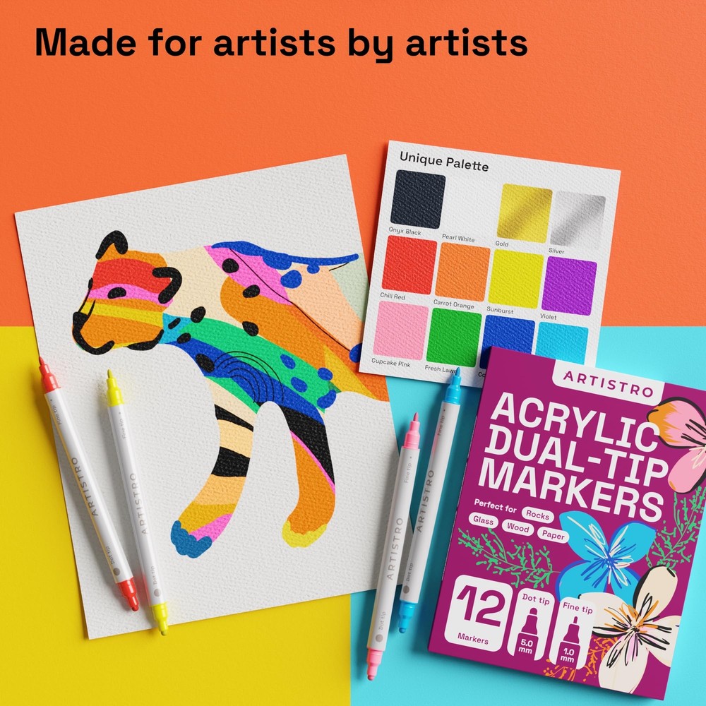 ARTISTRO 12 Acrylic Paint Pens, Acrylic Paint Markers,Fabric Markers for Textile Dual Tip Acrylic Paint Pens with Fine and Dot Tips – Each pen is equipped with a 1-5 mm dot tip for filling large areas and bold points, and a 1 mm fine tip for detailed work. Ideal for versatile use, whether it’s precision or bold color application you need. Pre-Activated Cotton Nibs for Immediate Use – No shaking or pressing required. These acrylic paint markers come ready with pre-activated cotton nibs, allowing you to start creating instantly with quick-drying, smudge-resistant ink. 12 Bright, Eye-Catching Colors for Creative Expression – With a palette of 12 vibrant colors, these markers are perfect for DIY projects, cards, scrapbooks, and unique gifts. Mix, layer, and blend for custom shades and effects on every surface. Multi-Surface Acrylic Markers for Any Project – Designed to perform on paper, fabric, wood, metal, glass, rock, and ceramic, these water-based markers provide consistent, fade-resistant results, letting you create with confidence across multiple surfaces. Perfect for Kids & Adults, Beginners & Pros – Whether you’re exploring paint pens for rocks or looking to elevate your artwork, these markers are versatile tools for all ages and skill levels—perfect for kids, hobbyists, and professional artists alike. Convenient Horizontal Storage for Longevity – Store markers horizontally with caps tightly closed to maintain ink quality and flow. This tip ensures your markers are always ready for smooth, vibrant strokes. Shipping We offer FREE shipping on all orders! We ship within Three business days of payment, usually sooner. We use a selection of shipping services such as UPS, FedEx, USPS etc. We only ship to the lower 48 states, no APO/FPO addresses or PO Boxes allowed. Local pickups and combined shipping options are not provided at this time. Return You can return a product for up to 30 days from the date you purchased it. Any product you return must be in the same condition you received it and in the original packaging. Please keep the receipt. Payment We accept payment by any of the payment methods accepted by eBay. Please pay as soon as possible after winning an auction, as that will allow us to post your item to you sooner! Feedback Customer satisfaction is very important to us. If you have any problem with your order, please contact us and we will do our best to make you satisfied. Contact Us If you have any queries, please contact us via ebay. We usually respond within 24 hours on weekdays. Please visit our eBay store to check out other items for sale! Thank you for shopping at our store.