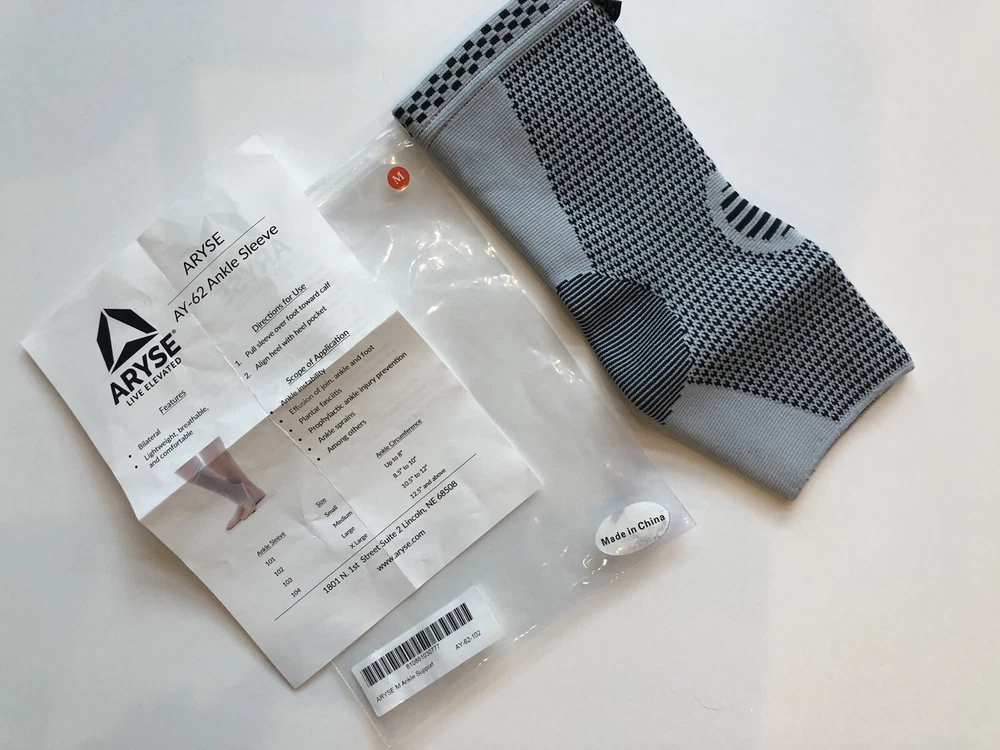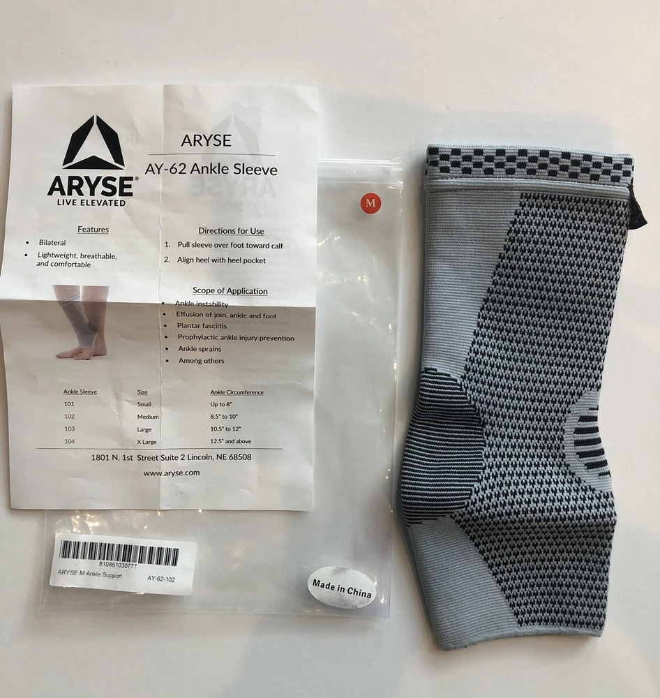 New ARYSE Ankle Sleeve AY-62-102 Compression Ankle Support Medium 8.5”-10” Circumference Grey/Black Bilateral Lightweight, Breathable Nylon, Bamboo Carcoal Fiber, Rubber Thread, Polyester Fiber