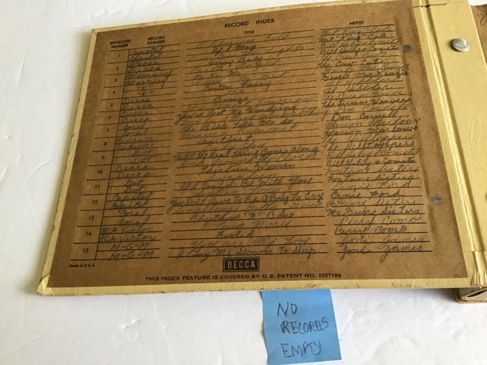 ************ NOTE: Will Combine shipping on items that close the same day ************* International ships via ebay GLOBAL service, or if multi purchases using B.I.N. ADD ITEMS TO SHOPPING CART thanks Combine shipping $2.00 each additional storage book please wait for the invoice on auctions ---for your consideration NO RECORDS JUST THE DECCA STORAGE BOOK AS215 Vintage EMPTY Decca Storage Book Album hold (15) 45 RPM Records EMPTY Acceptable condition has some shelf wear, stains Index has writing Thanks For Looking Ship every day, except for Saturdays, Sundays, and postal holidays.
