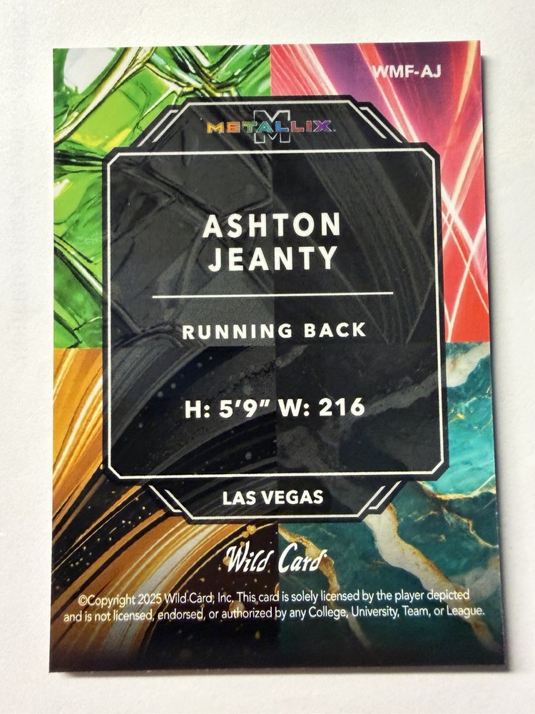 The product is a highly sought-after Ashton Jeanty 1/1 2024 Wild Card Metallix Shimmer rookie trading card featuring the player from the Las Vegas Raiders in the National Football League. This unique card is a one-of-a-kind, making it a rare find for collectors looking to add a special piece to their collection. With a limited print run of just one, this card is a valuable addition for fans of football trading cards, especially those interested in the Raiders and rookie players like Jeanty.