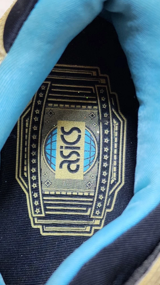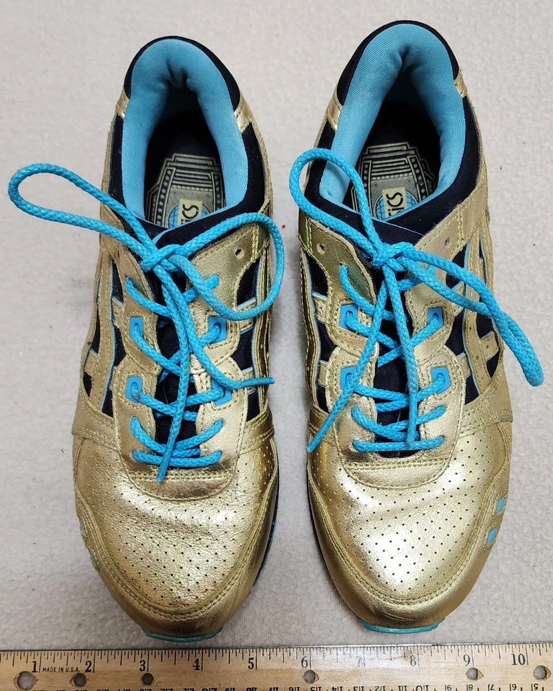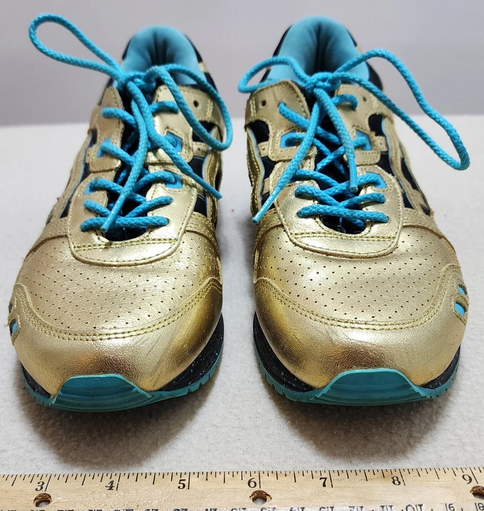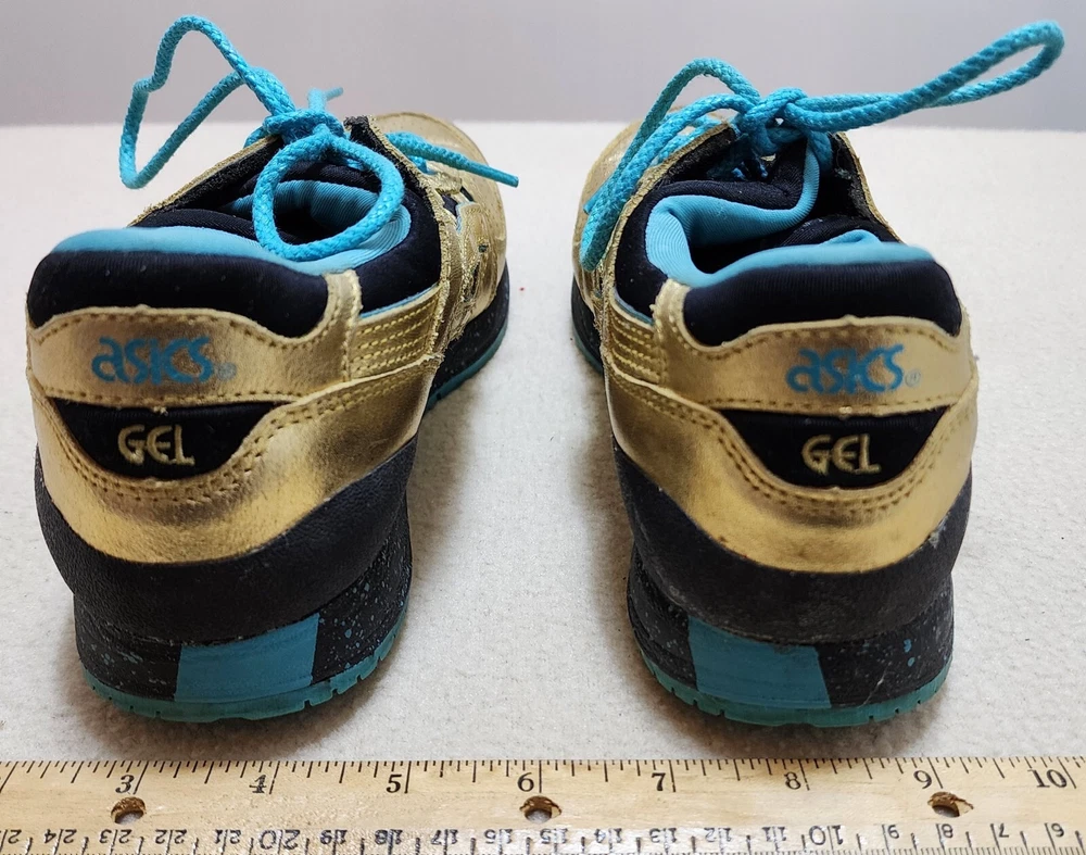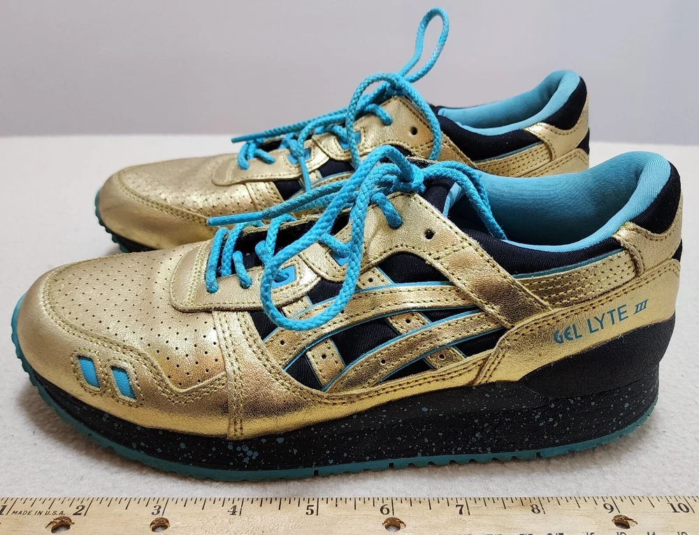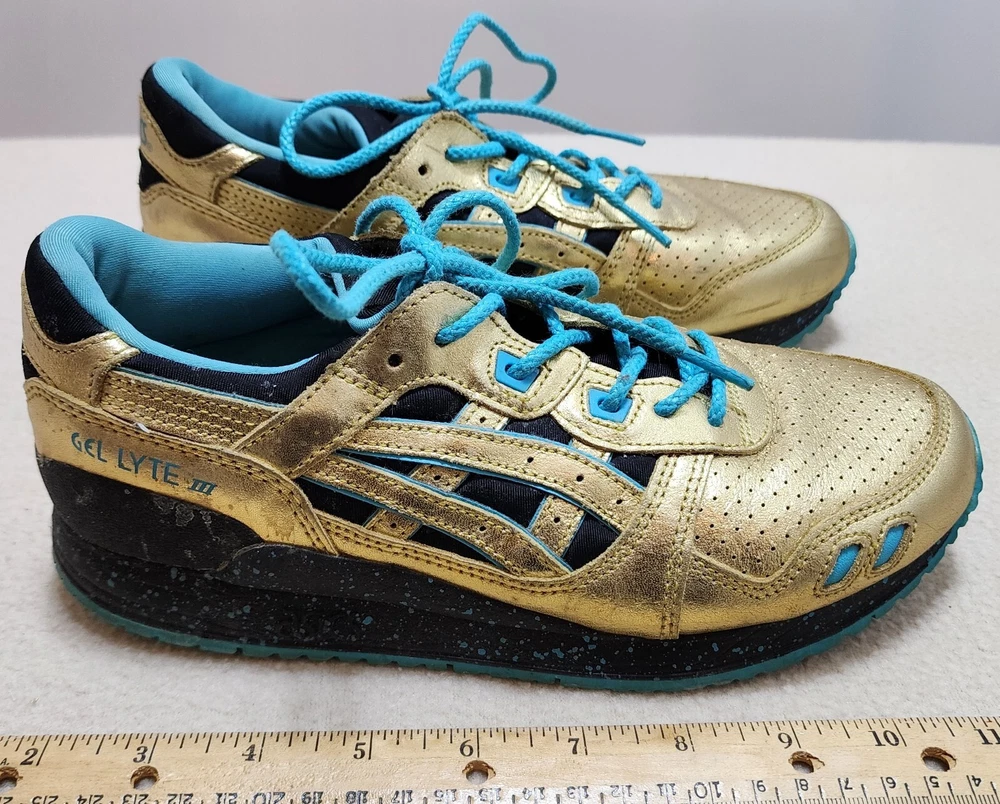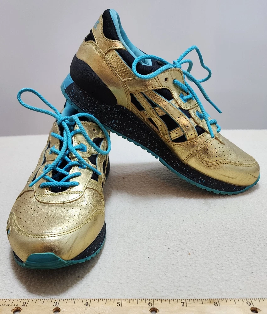 ASICS Gel-Lyte III GS GOLD & TEAL ATHLETIC RUNNING SHOES Size Women 5 / 37.5 ASICS Wale x Villa x Gel Lyte 3 Intercontinental Champion This Asics Gel-Lyte III features a metallic gold and black upper, a black midsole with blue speckles, and a blue rubber outsole. Shoes are in pre-owned condition with light wear. Shoes are overall in great condition. Please check out the photos and ask any questions before bidding. All Sales Final Happy Bidding........Shipping by mail. Buyer to contact and make payment by Paypal within 3 days.