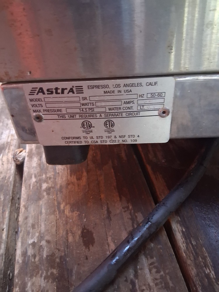 Voltage: 110V Components Included: Water Tank Brand: Astra Power: 1800 W Model: MBLAC Bar Pressure: 14.5 PSI Item Depth: 50-60HZ Coffee Type: Ground Coffee Features: Made in USA, Frother Material: Stainless Steel Country of Origin: United States Type: Espresso Machine Color: Black Control Panel: Analog Finish: Shiny Item Width: 20 AMPS Power Source: Electrical Type of Coffee Made: Espresso
