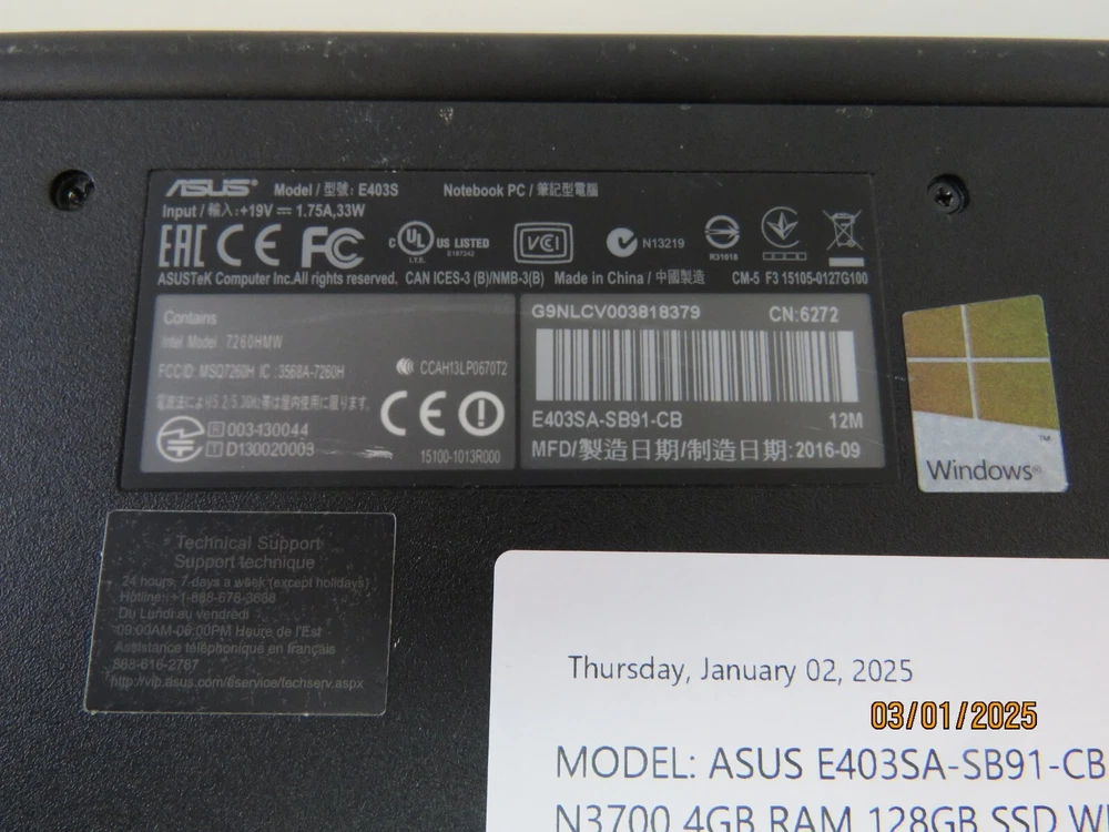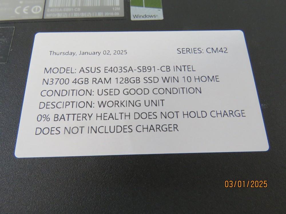 ASUS E403SA-SB91-CB INTEL N3700 4GB RAM 128GB SSD WIN 10 HOME [CM42] Functional Condition: Tested and Functional With Issue. ISSUE: Battery Does Not Hold Charge At All. Laptop Only Works When Plugged In. Charger Not Included. Cosmetic Condition: This is a Used Item and Normal Wear (Scuffs & Scratches) is Expected. Items included in this listing: Laptop Items NOT included in this listing: Charger Thank you for Shopping with Us! ENJOY Free Shipping in USA & Low Cost Shipping to CANADA! Terms of Sale NOTE: Our Listings only include items as pictured - Please do not assume any item is included if its not pictured. We will try our best to picture all items included in this listing as well as its cosmetic condition. We Guarantee & Stand Behind our product and commitment to provide you with o nly Original, Branded, OEM & Genuine Products Shipping A complete and correct shipping address is essential. We cannot guarantee the shipping address can be changed after checkout. Sales Tax will be charged to all Canadian & USA Buyers. Combined shipping is not guaranteed. We are unable to change any content of your order based on the eBay checkout note or PayPal message. Customers with shipping addresses outside of the U.S.A and Canada are responsible for all duties and import taxes. Please contact your customs for information Bidding All items are accurately described and pictured. Please ensure you are consciously bidding on the items as described. Payment Payments are expected at the time of purchase or in case of Auctions, at the end of auctions. Payments are managed via eBay Managed Payments Contact Us Your positive feedbacks are extremely valuable to us. If you have any concerns about your order, please contact us through eBay message to resolve any issues before leaving a negative feedback or opening a dispute. We will reply within 24 Hours Return Policy All items are in used condition unless specified.