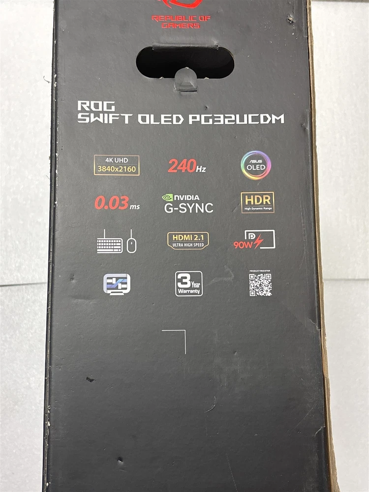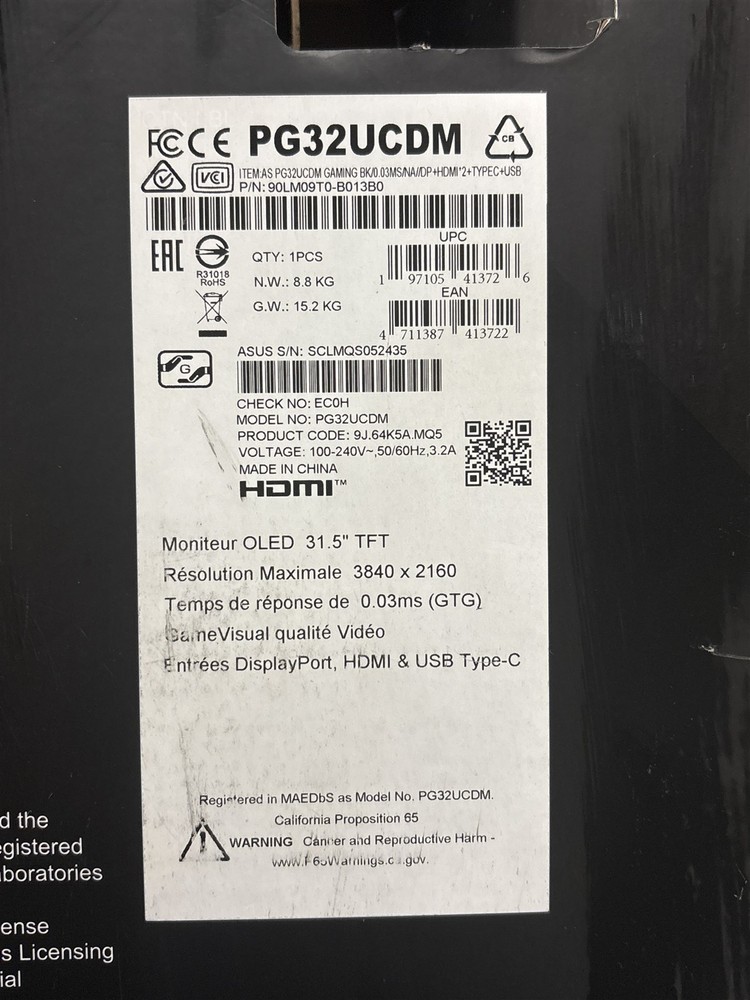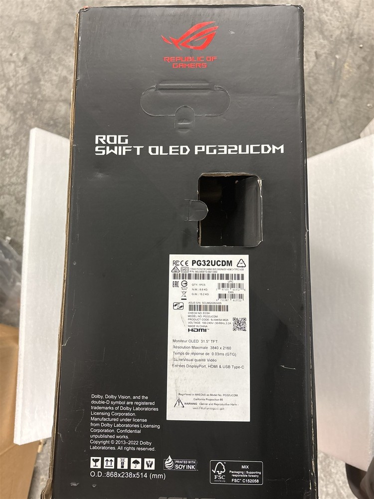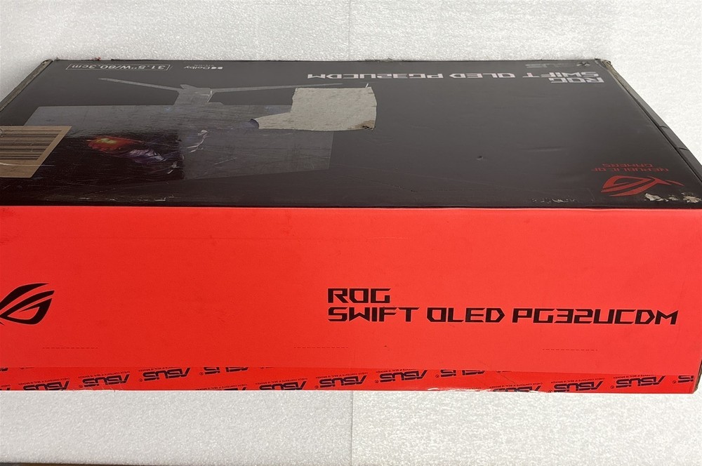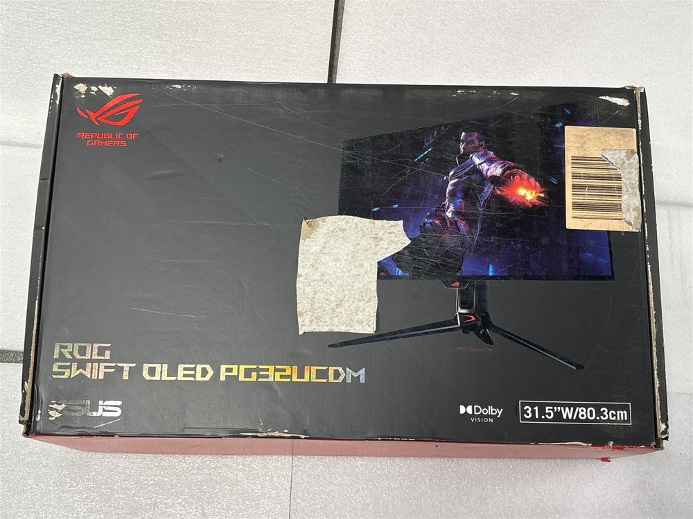 Product Description ASUS ROG Swift OLED 31.5" TFT 4K Monitor Model: PG32UCDM The monitor is new in the original packaging. The box has some damage from storage and the removal of labels. (please refer to the photos) Only what is pictured is included in this listing. Classification: New. Powered by SixBit's eCommerce Solution