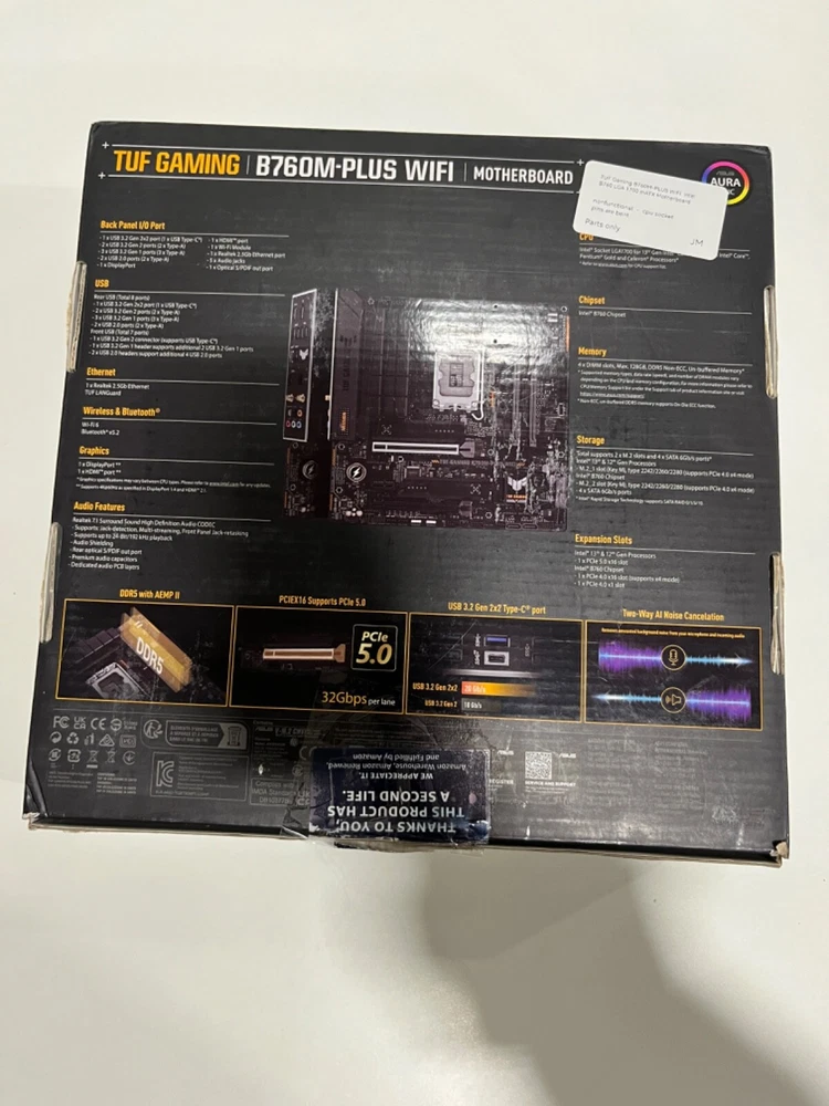 Compatible CPU Brand: Intel MPN: 90MB1ET0-M0AAY0 Form Factor: MicroATX Model: ASUS TUF Gaming B760M-PLUS WiFi Memory Type: DDR5 SDRAM Socket Type: LGA 1700/Socket V Brand: ASUS UPC: 197105121331 Most Suitable For: Gaming Input/Output Ports: DisplayPort, HDMI, Ethernet (RJ-45), USB 2.0, USB-C, USB 3.1 gtin13: 197105121331 Number of Memory Slots: 4 Expansion Slots: M.2, PCI Express 5.0x16, PCI Express 4.0x1, PCI Express 4.0 x16