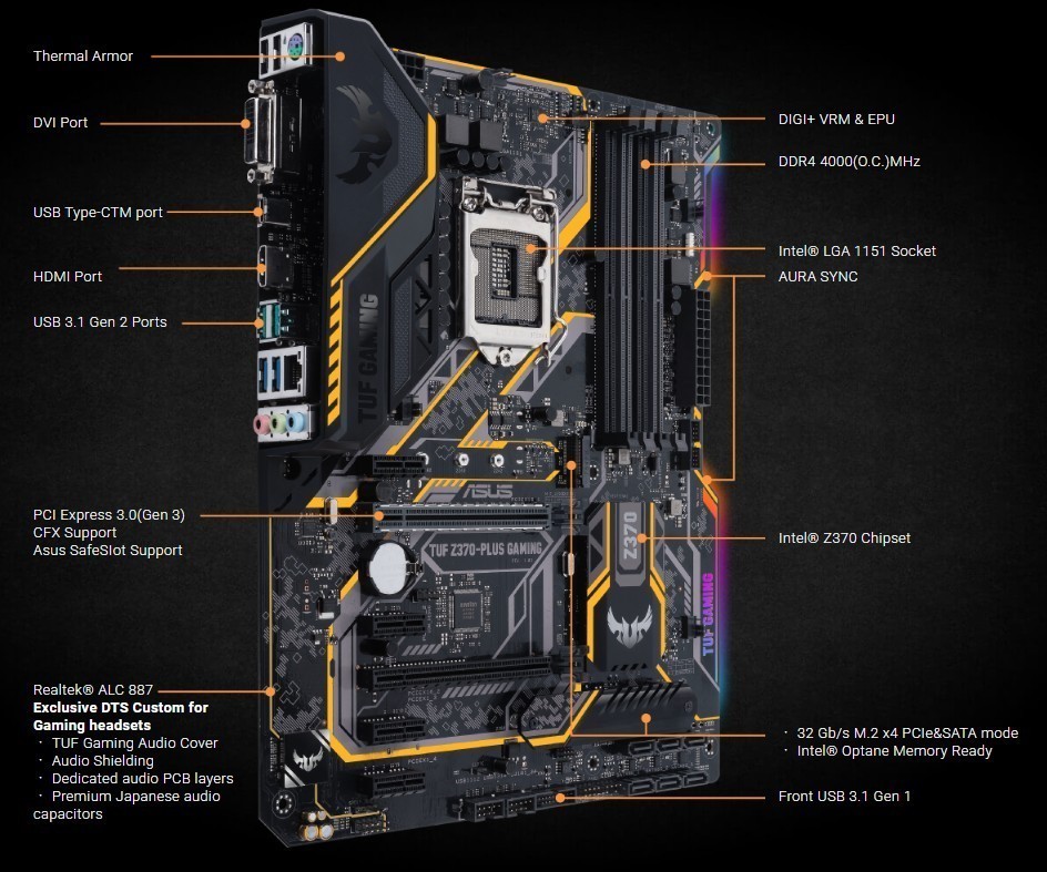 Store Categories Store Categories Battery Auto Parts & Accessories Toys & Hobbies Smart Electronics Sports & Outdoor Business & Industrial Home & Garden Fashion/Beauty Battery Series CPU Series Other Item Description TUF Z370-PLUS GAMING CPU Supports Intel® 14nm CPU,Supports Intel® Turbo Boost Technology 2.0,Intel® Socket 11519th / 8th Gen Intel ® Core™, Pentium ® Gold and Celeron ® Processors,* Refer to ASUS for CPU support list Chipset Intel® Z370 Memory 4 x DIMM, Max. 64GB, DDR4 4000(O.C.)/3866(O.C.)/3733(O.C.)/3600(O.C.)/3466(O.C.)/3400(O.C.)/3333(O.C.)/3300(O.C.)/3200(O.C.)/3000(O.C.)/2800(O.C.)/2666/2400/2133 MHz Non-ECC, Un-buffered Memory *,* The maximum memory frequency supported varies by processor.,Supports Intel® Extreme Memory Profile (XMP),Dual Channel Memory Architecture,* Refer to ASUS for the Memory QVL (Qualified Vendors Lists). Graphic Multi-VGA output support : HDMI/DVI-D ports,Integrated Graphics Processor- Intel® HD Graphics support,Maximum shared memory of 1024 MB (for iGPU exclusively),- Supports DVI-D with max. resolution 1920 x 1200 @ 60Hz,- Supports HDMI 1.4b with max. resolution 4096 x 2160 @ 24 Hz / 2560 x 1600 @ 60 Hz Multi-GPU Support Supports AMD CrossFireX™ Technology Expansion Slots *For 3 SSD on CPU support, install a Hyper M.2 X16 card (sold separately) into the PCIeX16_1 slot, enable this card under BIOS settings.,1 x PCIe 3.0/2.0 x16 (x16, x8/x4+x4) *,4 x PCIe 3.0/2.0 x1,1 x PCIe 3.0/2.0 x16 (max at x4 mode) Storage Intel® Z370 Chipset : ,2 x M.2 Socket 3* 1 , , with M Key, type 2242/2260/2280 storage devices support (SATA mode & X4 PCIE mode),6 x SATA 6Gb/s port(s), gray,Support Raid 0, 1, 5, 10,Intel® Optane™ Memory Ready LAN Intel® I219V, 1 x Gigabit LAN Controller(s),ASUS Turbo LAN Utility,TUF LANGuard Audio - Supports : Jack-detection, Front Panel Jack-retasking, Audio Feature : ,- Exclusive DTS Custom for GAMING Headsets.,- Audio Shielding: Ensures precision analog/digital separation and greatly reduced multi-lateral interference,- Dedicated audio PCB layers: Separate layers for left and right channels to guard the quality of the sensitive audio signals,- Premium Japanese audio capacitors: Provide warm, natural and immersive sound with exceptional clarity and fidelity,- Audio Cover: Effective shielding preserves the integrity of audio signals to ensure best quality.,Realtek® ALC8878-Channel High Definition Audio CODEC USB Ports 2 x USB 3.1 Gen 2 port(s) (2 at back panel, +teal blue, Type-A),1 x USB 5Gb/s port(s) port(s),6 x USB 3.1 Gen 1 port(s) (2 at back panel, +blue), Intel® Z370 Chipset : ,6 x USB 2.0 port(s) (2 at back panel, ), ASMedia® USB 3.1 Gen 2 controller : Special Features TUF ENGINE! Power Design : ,- TUF Components (Choke, Cap. & MOSFET; certified by military-standard),- ASUS O.C. Tuner, Overclocking Protection : ,- Stylish Fanless Design: PCH Heat-sink & MOS Heat-sink & M.2 Heat-sink solution,- ASUS Fan Xpert 4 Core, M.2 Onboard(The latest transfer technologies with up to 32Gb/s data transfer speeds) ,- ASUS C.P.R.(CPU Parameter Recall), ASUS TUF PROTECTION ,- ASUS SafeSlot: Protect your graphics card Investment,- ASUS ESD Guard: Enhanced ESD protection,- ASUS Overvoltage Protection: World-class circuit-protecting power design,- ASUS Stainless-Steel Back I/O: 3X corrosion-resistance for greater durability!, ASUS EPU : ,- EPU, AURA : ,- Aura Lighting Control,- Aura RGB Strip Headers, ASUS Exclusive Features :,- AI Suite 3,- Ai Charger, ASUS Quiet Thermal Solution :, ASUS EZ DIY : ,- ASUS CrashFree BIOS 3,- ASUS EZ Flash 3,- ASUS UEFI BIOS EZ Mode, ASUS Q-Design : ,- ASUS Q-Slot,- ASUS Q-DIMM,- ASUS DIGI+ VRM: Precision control for stable power Back I/O Ports 1 x 5Gb/s port(s) USB Type-C TM ( support 3A power output ),2 x USB 3.1 Gen 2 (teal blue),2 x USB 3.1 Gen 1 (blue) Type-A,1 x PS/2 keyboard/mouse combo port(s),1 x DVI-D,1 x HDMI,1 x LAN (RJ45) port(s),2 x USB 2.0,3 x Audio jack(s) Internal I/O 1 x W_Pump+ Header,2 x M.2 Socket 3 with M Key, type 2242/2260/2280 storage devices support (SATA mode & X4 PCIE mode),1 x AIO PUMP Header,2 x Chassis Fan connector(s) (2 x 4-pin),1 x Aura RGB Strip Header,2 x USB 3.1 Gen 1(up to 5Gbps) connector(s) support(s) additional 4 USB 3.1 Gen 1 port(s) (19-pin),1 x System panel connector,2 x USB 2.0 connector(s) support(s) additional 4 USB 2.0 port(s),6 x SATA 6Gb/s connector(s),1 x CPU Fan connector(s) (1 x 4-pin),1 x S/PDIF out header(s),1 x 24-pin EATX Power connector(s),1 x 8-pin ATX 12V Power connector(s),1 x Front panel audio connector(s) (AAFP),1 x Clear CMOS jumper(s) BIOS 128 Mb Flash ROM, UEFI AMI BIOS, PnP, DMI3.0, WfM2.0, SM BIOS 3.0, ACPI 6.0, Multi-language BIOS, ASUS EZ Flash 3, CrashFree BIOS 3, F11 EZ Tuning Wizard, F6 Qfan Control, F3 My Favorites, Last Modified log, F12 PrintScreen, and ASUS DRAM SPD (Serial Presence Detect) memory information Manageability WfM 2.0, DMI 3.0, WOL by PME, PXE Operating System Windows® 11 64-bit Feedback Payment Shipment About us Feedback We appreciate positive feedback . we always try our best to service our customers . so if you have ant question ,PLEASE DON’T HESITATE TO TELL US, we are always here to offer help . Payment We prefer PayPal .For purchasing multiple items , please contact us for a combined invoice . generally we would like to receive payment thin 48 hours if . Shipment We provide airmail service with good package . The items will be shipped within the nest 2 business days after we received the payment . when you buy multiple items ,your shipping cost will be combined with discount . SHIPPING TIME (weekends/holidays excluded) Country Name Shipping Time Country Name Shipping Time USA/Canada 10 -15d Spanish/Portugue 10-25d East/South Asia 10 -15d France/West Asia 10-25d United Kingdom 10 -20d Italy 10-30d Australia/New Zealand 10 -15d West Asia/Middle East 15-25d Most Country of West/North Europe 10-20d South America and Africa 15-30d East /Middle Europe/Russia 10-25d About us NEW, GOOD QUALITY, ORIGINAL PA