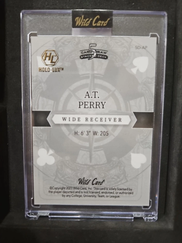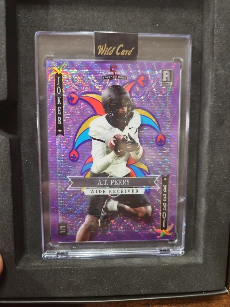 This trading card features A.T. Perry, a rookie player for the New Orleans Saints in the National Football League (NFL). It is a rare 1/1 rookie card from the 2023 Wild Card 5 Card Draw set. The card number is SD-AP and it includes the JOKER in the title, adding to its uniqueness. This autographed card is in near mint condition or better, making it a valuable addition to any sports trading card collection.