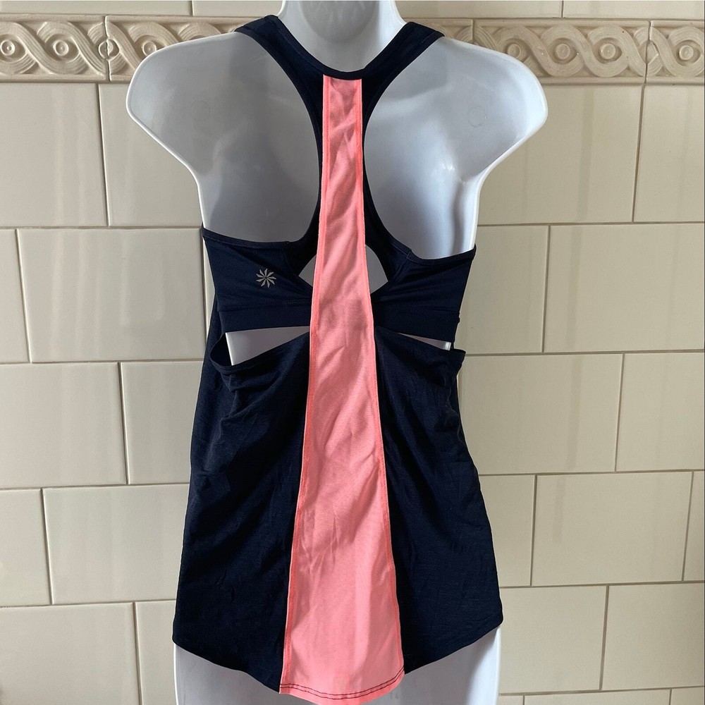 ATHLETA Women’s “Hullabraloo Support Top” Bra Tank Navy sports bra with attached navy tank Support top with coral pink mesh ventilation to keep you cool and supported through your workout Approx. length 23" Pre-owned in very good condition.