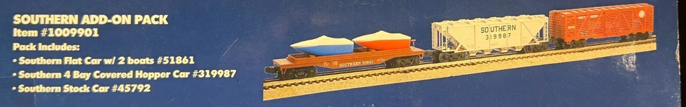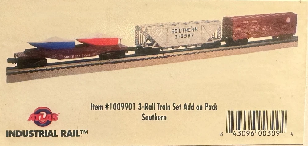 This Atlas O Industrial Rail #1009901 3-Rail Train Set Add On Pack Southern is a great addition to any model railroad enthusiast's collection. The set includes a freight car with the Santa Fe Southern Railway corporate roadname and is designed for use on a three-rail system. The power type is AC and the gauge is O-27. The set is perfect for those interested in the railroad theme and is a great addition to any collection of freight cars or railroads and trains. The brand is Atlas and the type is a freight car. This item is categorized under Freight Cars, Railroad and Trains, Model Railroads and Trains, and Toys and Hobbies.