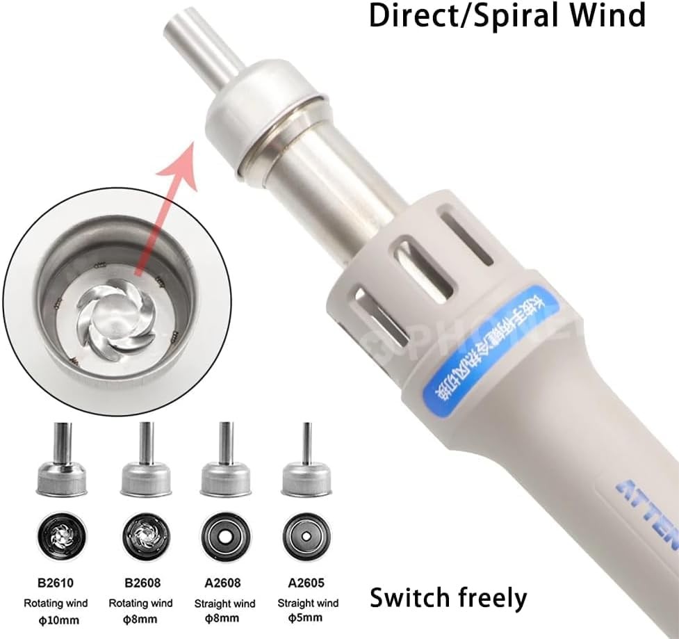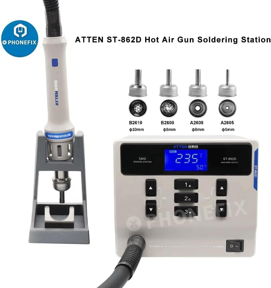 Intelligent constant temperature control system Intelligent constant temperature control, the hot air gun will automatically stop heating when it reaches the specified temperature. During use, it will collide with the air and the temperature will decrease. The hot air gun will automatically heat up and reach the specified temperature Magnetic induction automatic sleep mode The handle is equipped with a built-in magnetic induction device. When the handle is placed on the air gun bracket, the machine stops heating. When picked up and used again, press the switch on the handle to continue heating the air gun. Brushless eddy current fan The brushless vortex fan has a large air flow rate and strong air volume, making it easy to remove various components, including discrete, double row, and surface mount. Quickly replace the soldering iron bracket Quick replacement of air gun nozzle, user-friendly design, easy operation. Plug in heating element High heating efficiency, long lifespan, quick and convenient replacement of heating elements. High power transformer 1000W high power, suitable for high load areas, controllable temperature, able to work continuously, fast temperature recovery speed! Equipped with 4 air nozzles Equipped with 2 straight air nozzles and 2 cyclone air nozzles of different sizes to meet various welding needs. ATEEN 862D handle Ergonomic design, comfortable grip, lightweight and portable, with good insulation effect. LED display screen The large screen displays the working status and realizes visual human-machine operation. key Large buttons for easy operation Product size Compact and easy to place. Static grounding wire Plug and unplug design, with a wire length of about 1M, easy to use.