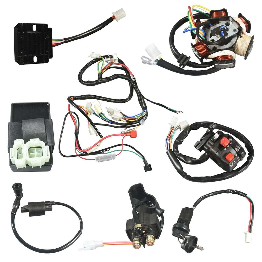 Complete Electric Wiring Harness Kit ATV Wire For GY6 150cc 125cc Scooter Moped Fitment: Fits almost all years Chinese made electric start upright engine GY6 125cc 150cc ATV / QUAD / Coolster / Go Kart / 4 wheelers / Scooter / buggy / Motowork & more Package Include:1 Wire loom, 1 Electric door lock, 1 Raley, 1 CDI, 1 Stablilzer, 1 Magneto Coil, 1 Ignition Coil Does NOT fit 49cc 50cc 70cc 110cc 150cc 200cc 250cc 300cc Zongshen Lifan ATV / QUAD with different stator Compatible: GY6 125cc 150cc ATV / QUAD with 6 coil stator ATTENTION: Please check the wiring diagram first before installation. Please consult or hire a mechanic to install this wiring harness if you are not sure about the wirings. Faulty assembly on rare occasions may cause fire. Shipping/Fulfillment We offer FREE shipping to most States except for the following: California, Connecticut, District of Columbia, Massachusetts, Louisiana, Maryland, Mississippi, Tennessee, Washington, New Mexico, Illinois We use a selection of shipping services such as but not limited to: UPS, FedEx, USPS, DGM SmartMail Expedited, etc. We only ship to the lower 48 states, no APO/FPO addresses, or PO Boxes allowed. Local pickups and combined shipping options are not provided at this time. ORDER FULLFILLMENT Most items are forwarded to our supplier for processing, which will then be fulfilled through a distributor that is closest to your location. Th ese distributors may be names you recognize or sourced from smaller local operations. Return You can return a product for up to 30 days from the date you purchased it. Any product you return must be in the same condition you received it and in the original packaging. Payment We accept payment by any of the following methods: PayPal, GPay, Venmo, Visa, Mastercard, American Express, and Discover Feedback Customer satisfaction is very important to us. If you have any problem with your order, please contact us and we will do our best to make you satisfied. Contact Us If you have any queries, please contact us via eBay. We usually respond within 24 hours on weekdays. Please visit our eBay store to check out other items for sale! Thank you for shopping at our store.