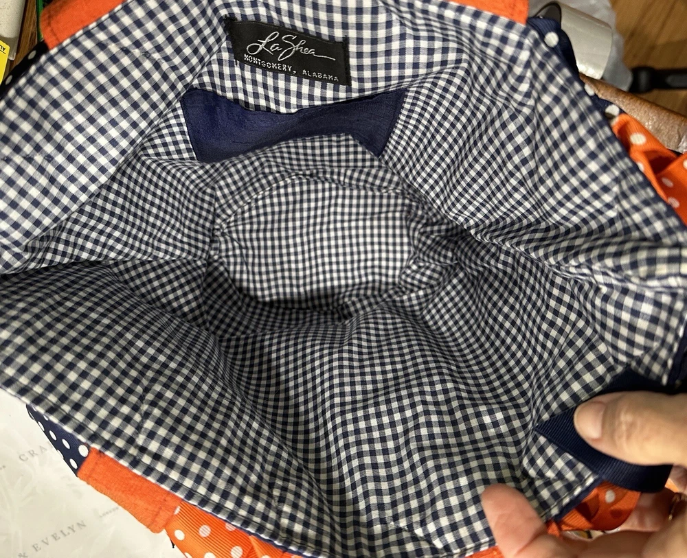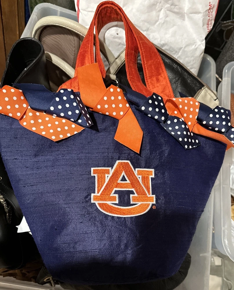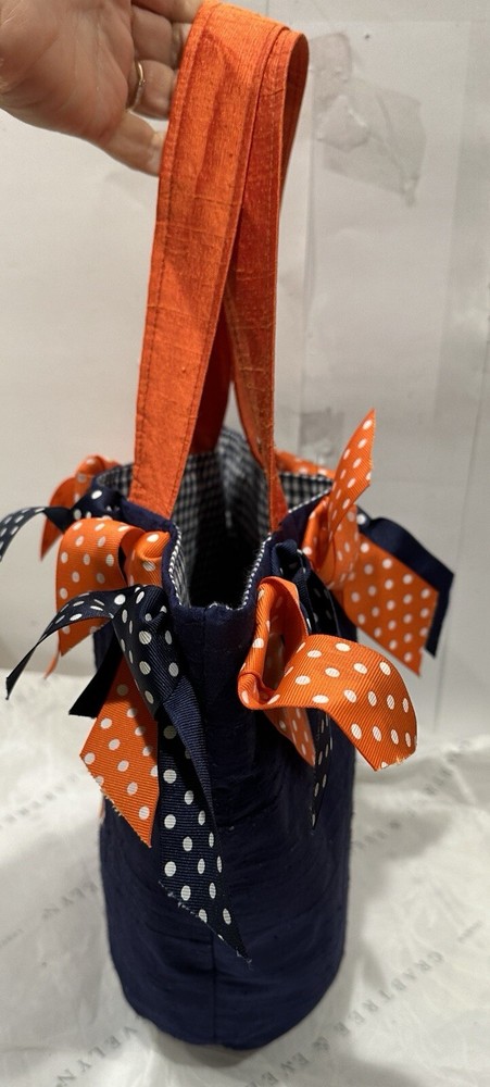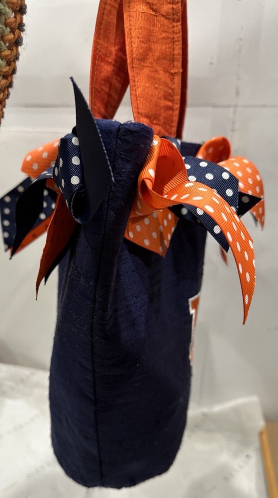 AUBURN UNIVERSITY Navy Orange Ribbon Satin Tote Medium size, approx. 7" bottom/14" wide top x 11" High x 4" deep Beautiful ribboned top. Inside pocket Great condition! Items will always be mailed within one business day of purchase, and by using the most reliable and cost efficient method, usually Priority. If there is a huge difference in price, you will receive a shipping credit. I want to foster great lines of communication with my buyers. Please check out all photos, and feel free to ask questions before purchase. Thanks for looking, and check out my other fab handbags for sale.