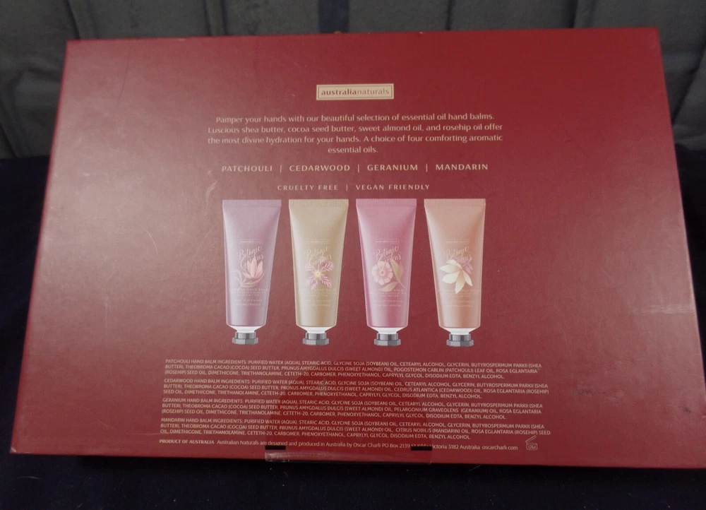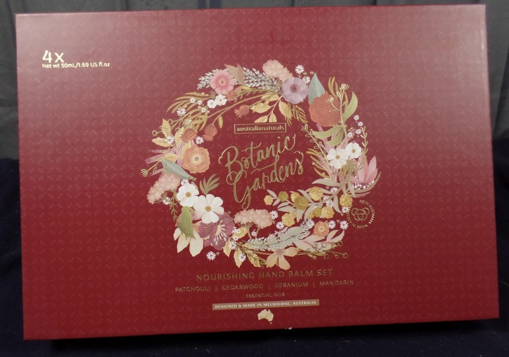 Australian Naturals Botanic Gardens Nourishing Had Balm 4 piece set: Patchouli, Cedarwood, Geranium and mandarin. Each a nice travel 1.69 oz travel size. This set in new in the unopened box. Please review the photos.