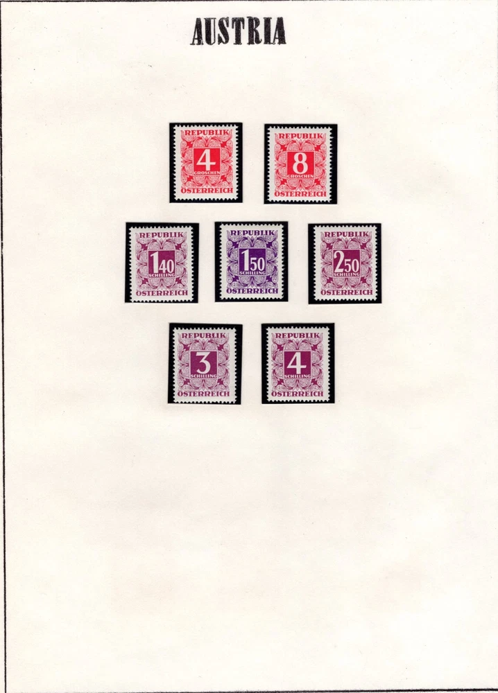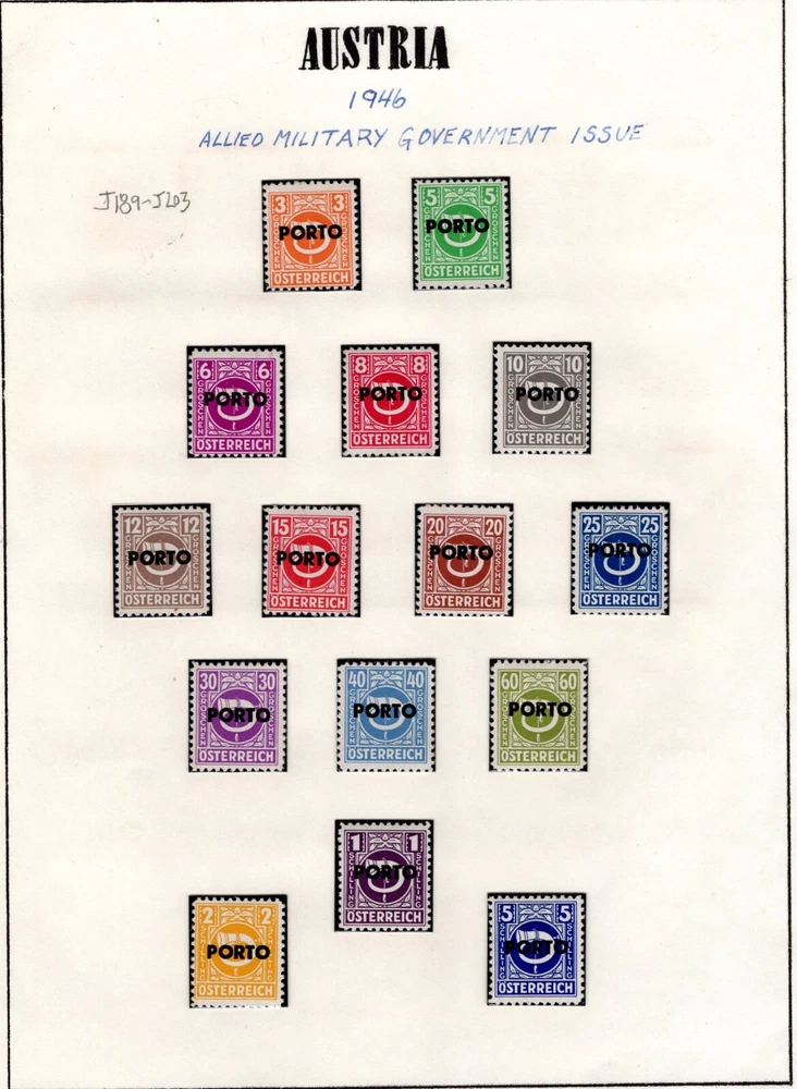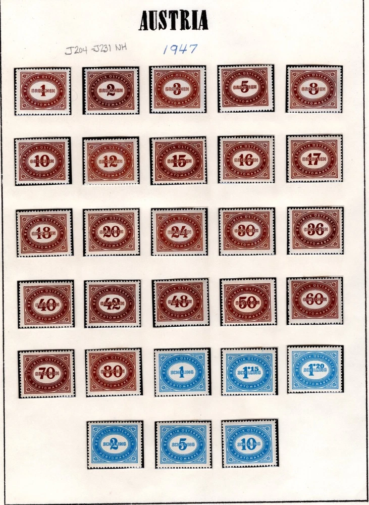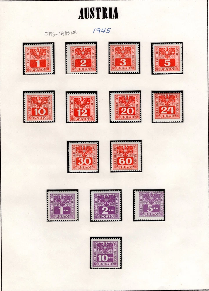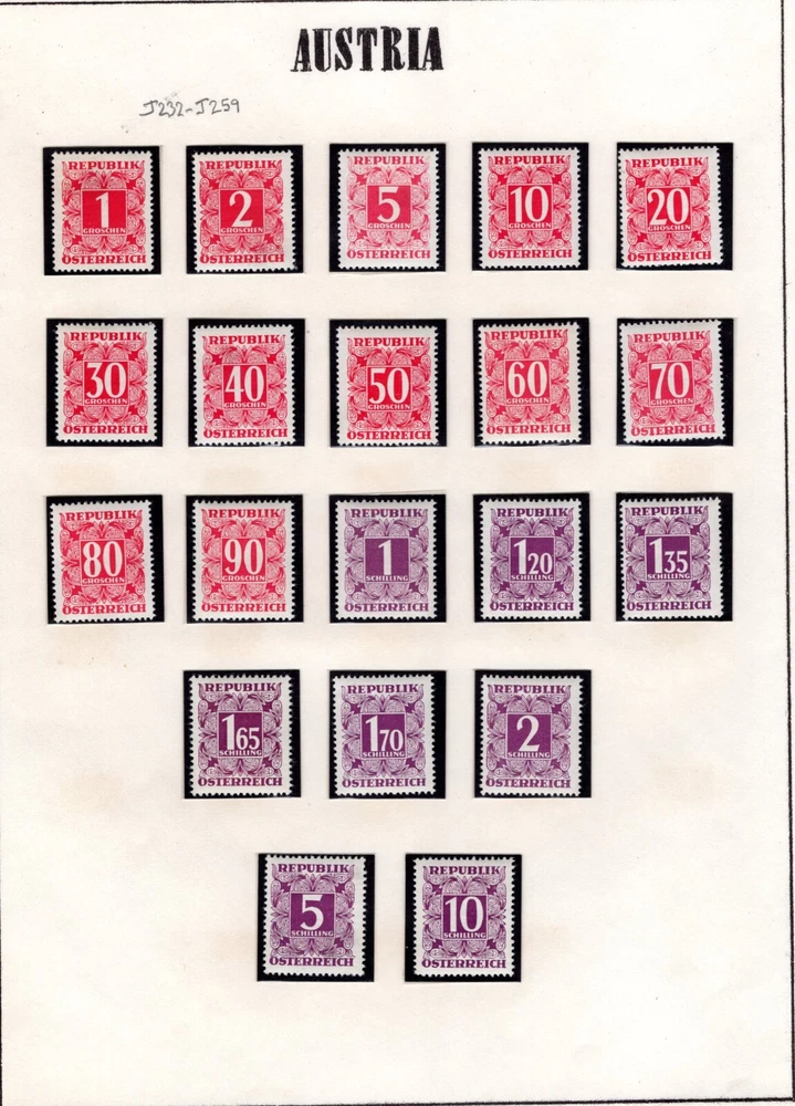 AUSTRIA 1894 -1957 COLLECTION OF POSTAGE DUES SCOTT # J1 - J259 IN HINGLESS PAGES ALL COMPLETE SETS LESS 2 STAMPS J45-J46 CV $450.00 FOR HINGED PLEASE VISIT MY EBAY STORE : Filatco Stamps BUY 5 ITEMS SHIPPING & REGISTRATION IS FREE INTERNATIONAL BUYERS PLEASE NOTE: EBAY AND PAYPAL REQUIRE REGISTRATION FOR TRACKING INTERNATIONAL SHIPMENTS. EBAY CHARGES $12.61 FOR SHIPPING LABELS WITH TRAKING # US POST OFFICE CHARGES $14.95 FOR REGISTRATION # + POSTAGE BUYER HAS THE CHOICE OF SHIPPING FIRST CLASS MAIL WITHOUT TRACKING # FOR $2.50 . IN THIS CASE BUYER ACCEPTS RESPONSIBILITY IF ITEM IS LOST IN TRANSIT. Feel free to ask if you have any questions. PAYMENT WITHIN 2 DAYS IS APPRECIATED . FEEDBACK : I APPRECIATE YOUR BUSINESS AND MY TOP CONCERN IS TO MAKE SURE YOU ARE 100% PLEASED WITH ANY ITEM YOU PURCHASE. IF YOU HAVE A CONCERN OR A PROBLEM WITH INVOICE, SHIPPING OR ANY ITEM YOU RECEIVED PLEASE CONTACT ME FIRST BEFORE YOU LEAVE ANY FEEDBACK. I GUARANTEE YOU WILL BE 100% SATISFIED WITH THE TRANSACTION. I WILL CERTAINLY LEAVE YOU A POSITIVE FEEDBACK AS SOON AS I RECEIVE YOURS.