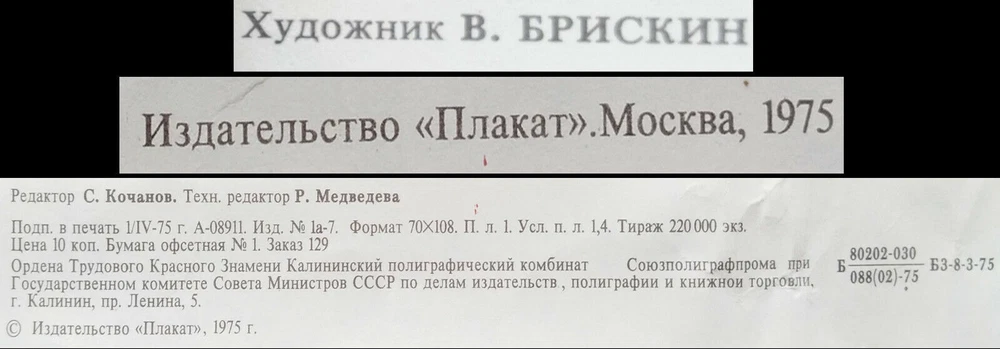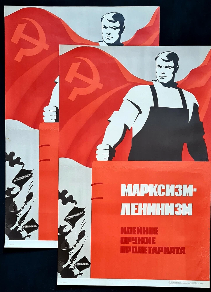 Original slogans on the poster: МАРКСИЗМ-ЛЕНИНИЗМ ИДЕЙНОЕ ОРУЖИЕ ПРОЛЕТАРИАТА Literally English translation: MARXISM - LENINISM IS IDEOLOGICAL WEAPON OF THE PROLETARIAT. ANTI-COMMUNISM, REVISIONISM POSTER ARTIST: BRISKIN VENIAMIN MARKOVICH PRINT YEAR: 1975 SUBJECT: ANI USA, MARXISM, LENENISM LANGUAGE: RUSSIAN PRINT RUN: 220.000 PUBLISHED BY: "PLAKAT", MOSCOW SIZE: IN: 26 ³/₈ x 40 ³⁵/₆₄ = CM: 67 x 103 CONDITION: ROLLED, SLIGHT FOLD IN THE MIDDLE The are two posters available, condition a little varies, all posters have horizontal fold in the middle plus some creases and tears, but the posters have been flattened under press and all of the defects are slightly to see alive plus there are minor tape repairs on the reverse, otherwise the poster is in a pretty nice overall condition ( For more condition information please feel free to require additional pictures or video ), is very impressive and hard to find one, created by one of the famous Soviet poster artist: BRISKIN VENIAMIN MARKOVICH (1906-1982) - Highly famous Ukrainian Soviet graphic artist; outstanding poster artist; received recognition as the author of satirical posters on sensitive social and political topics. Member of the Union of Artists of the USSR (since 1967). Honored Artist of the RSFSR. Founder and head editor of the famous workshop “Agitplakat”. Was born in Romny in 1906. Studied at the Kharkov Institute of Art and Industry (1921−1925) under S.M. Prokhorov and M.A.Sharonov. Participant of exhibitions since 1926. He was engaged in book and magazine graphics for the Military Publishing House, painted for the Krokodil magazine (1932−1933), the newspapers Komsomolskaya Pravda (from 1934), Pravda (1956), in easel graphics he performed the series Vasya Terkin (1940), "Postwar Europe" (1947), designed books by M. Gorky and M. Twain. In the poster genre, he achieved great success, an outstanding, subtle draftsman, easily and wittily revealed the characters of the characters in his works. Known for his posters on foreign policy, in them with humor, ridiculed the vices of capitalist society. In the 60s and 70s, in Briskin's works, the monumentality and generalization of forms increased, nevertheless, during this period, his posters stand out for their sharpness, attention to detail and technical perfection. Made several posters together with Peter Karachentsov. He fruitfully collaborated with his younger colleague Konstantin Ivanov, with whom in 1956 he created the creative and production association "Agitplakat". The chief art editor of which was Benjamin Briskin. Collaborated with the state publishing house "IZOGIZ" and "Soviet artist"; known for his cycle of satirical posters dedicated to the problems of agriculture, criticizing lazy people, truants, slovens and drunkards: “Don't expect a good tribe from a bad seed” (1954), “Don't be like that! I skipped the day ... I lost the harvest "(1954)," Closer to life, to a living business! " (1954), “Don't be like that! The work is in full swing, but she is going to the market ... ”(1955). Participated in numerous exhibitions in the USSR and abroad. In 1970, at the international exhibition "Satire in the Struggle for Peace" in Moscow, he received the gold medal of the Soviet Peace Fund. Author of the book "Experience of working on a propaganda poster." Briskin in the poster genre has achieved great success, superior, fine draftsman, easily and cleverly revealed the characters in his works. Here created some posters about foreign policy, where with humor, made fun of the vices of capitalist society. In 60-70 years in the artworks of Briskin amplified monumental and generalized forms, nevertheless during this period, his posters are distinguished by the sharpness, attention to detail and technical perfection. Veniamin Briskin died on March 28, 1982. He was buried in Moscow Cemetery Vagankovsky. Listing and template services provided by inkFrog
