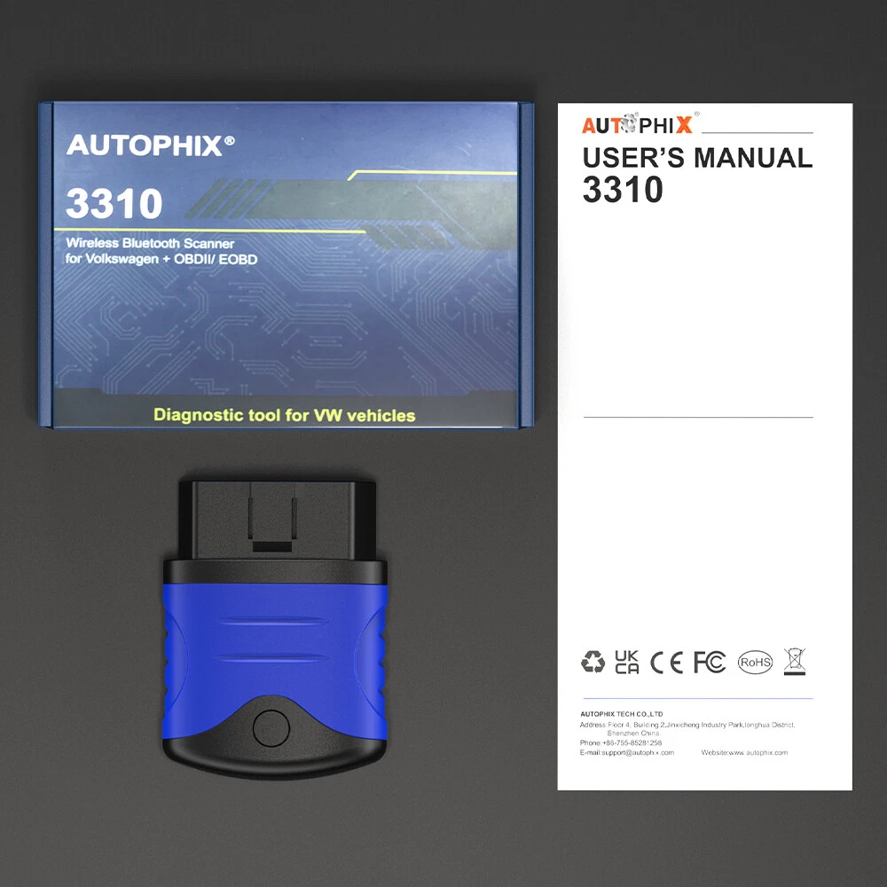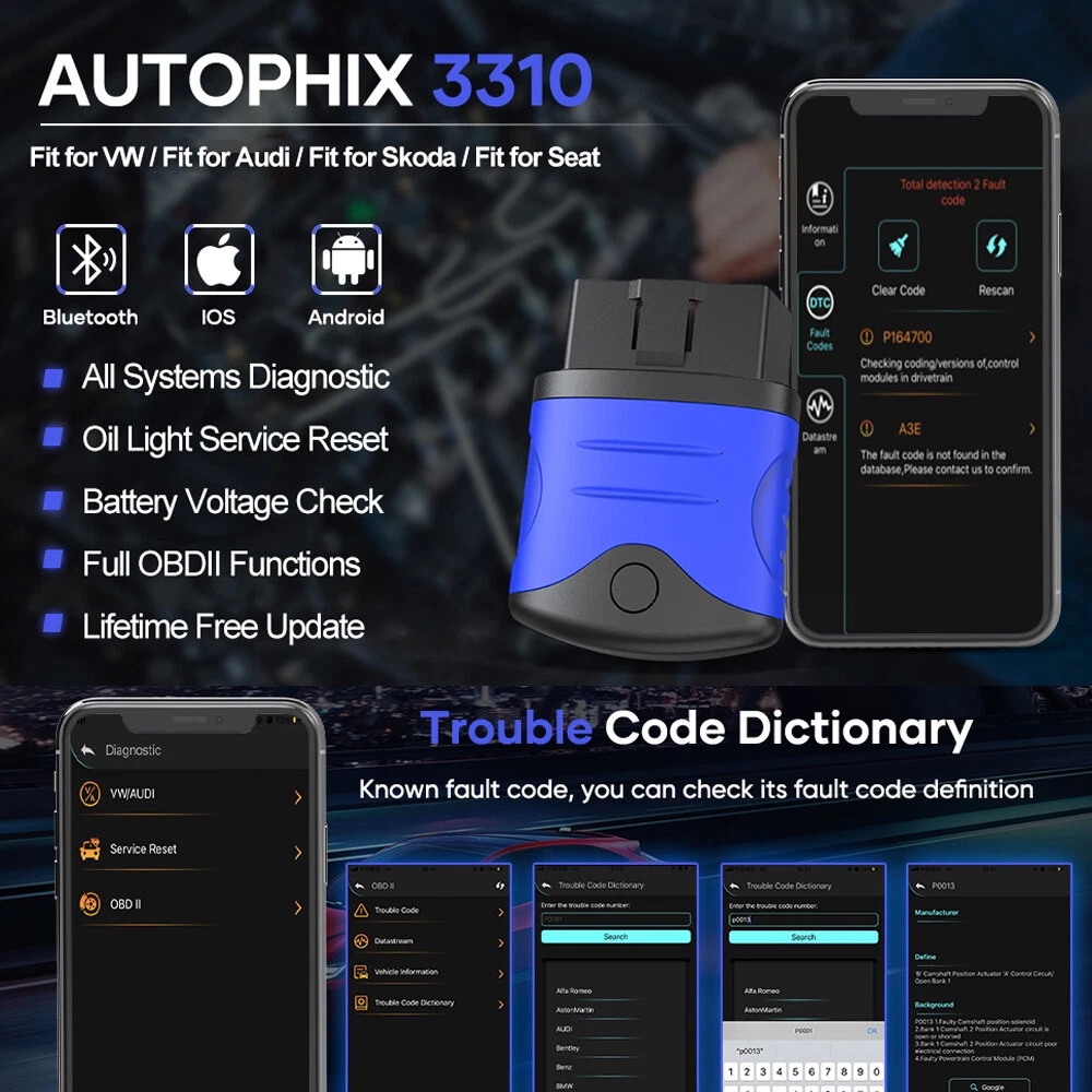AUTOPHIX Bluetooth/Wireless Diagnostic Tool’s Philosophy: Easiest, Fastest and More Powerful Full Systems Comprehensive Diagnosis: Don't underestimate its small body, the AUTOPHIX 3310 bluetooth diagnostic scanner can easily access to full control modules and then diagnose all systems for all VAG vehicles. You can deserve all basic functions while entering every systems: version information, read & clear codes, datastream(text & chart display). Universal Scanner — Wide Compatiblity: AUTOPHIX 3310 bluetooth scanner tool is not only a full systemscanner for VAG vehicles, but a universal obd2 code reader that can check the engine system for all car brands' vehicles. So it would be great if you have several cars at home! Read Fault Codes:Option is used to read the current, pending or permanent trouble codes. Erase/Clear Codes:Option allows you to clear the existing or historic trouble codes. Vehicle Information:allows you to view the relevant information of the vehicle, including VIN (Vehicle identification Number), CID (Calibration ID) and CVN (Calibration verification number). Service Reset:Allows you to reset the service lamps on the instrument cluster,enabling you to do your own maintenance work efficiently and effortlessly. Support Multi-language:Chinese,English,German,Spanish,French,Italian Feedback function: Please feel free to feedback your problems to us through "Autophix"APP, Our professional technical team will provide you with excellent solutions. Report Function: Simple and super easy to use, AUTOPHIX 3310 is a must-have diagnostic tool for today’s technologically loaded vehicles ,it can generates professional diagnosis report, you can share diagnosis report to your friend or mechanic through APP to solve your car problems. BAT check:It can check the health of your battery and voltage and display the voltage change within a certain period of time in the form of graphics and tables on the mobile phone.Battery's importance: Supplies power to the starting system, ignition system, electronic fuel injection system, and other electrical equipment of the vehicle. Help Function:Select the corresponding model to view the help information, including: demo video (the phone must have a network to view),Connect Device can view the operation steps in document form. Wireless & Bluetooth:3310 obd2 scanner connects with Bluetooth via your phone/tablet to a sensor that plugs into your car's OBDII port.Just plug the vehicle code reader into the car OBD interface, then turn the ignition on and open the "Autophix" APP on your phone or iPad to automatically connect successfully instantly. Powerful Full System Diagnostic Scan Tool Compatible with VW/ Audi/ Skoda/ SEAT AUTOPHIX 3310 bluetooth obd2 scanner has developed this scan tool to meet industry demands for diagnosing and repairing virtually any vehicle on the road today. It strives to make automotive repairs accurate,easy, efficient and affordable for do-it-yourself to professional-level technicians. AUTOPHIX 3310 function has a working range of 95% to 100% ( other diagnostic tools can achieve the function of OE scanner only 60% to 75% ). Engine System: Engine is a device that provides power for the automobile and the heart of the automobile. 3310 OBD2 scanner Support all OBD2 cars from 1996 to now. It can support all modes OBDII functions & battery Voltage. Easily identify car problems and determine the engine lights. Help you pass the e-xhaust test and keep your car in the best condition. TPMS System: Allows you to check the tire sensor IDs from the vehicle and to perform TPMS p-rogramming and reset after tires sensors are replaced or rotated. SRS/ Airbag System: SRS is a device that expands the airbag to protect the passenger before the second collision occurs called Supplemental Restraint System (SRS). ABS System: ABS automatically control the braking force of the brake when the car is braking to ensure the maximum adhesion between wheels and ground. Whenever you change a part of the brake system, you will need to bleed the brake system afterward. 3310 Allows you to use the scanner temporarily to activate or control anti-lock brake system. SAS System: Allows you to perform c-alibration of the steering angle sensor, which permanently stores the current steering wheel position as straight-ahead in the sensor EEPROM. After c-alibrate sensor successfully, its fault memory will be automatically cleared. A/C (Air Conditioner) System: Supports routine maintenance of air condition modules, such as air conditioning system adaption reset, rese air conditioning compressor, run in air conditioning compressor, stepper motor initialization. Elite Enhanced All Systems Diagnostic Scanner Compatible with VW/ AUDI/ SKODA/ SEAT >>>>1.Powertrain Module: Engine, Transmission, Battery Energy,Transfer case, All wheel,Electrical Machine Electronics, Diesel Fuel Pump,etc. >>>>2. Body Module: SRS Airbag System, Camera, Audio Radio System, Gateway System, Charging Interface Module, Parking Assistance, Power Control Unit, Light, Battery Charging System, Roof, Seat & Door Motor system, Immobilizer, ABS ESP system, Air Condition, Electric Windows, and more... >>>>3.Suspension Module: Steering Angle Sender, Rear Axle Steering, Tire Pressure Monitoring, Wheel Dampening Electronics, Active Steering, Parking Brake, Chassis Control, Roll Control System, Reductant Control Module,Sensors Brake Systems, Trailer Function and More... >>>>4.Electronic Module: Centralized control system for engine and power transmission,Intelligent body electronic system, Chassis integrated control and safety system,etc. Service Reset:Allows you to reset the service lamps on the instrument cluster,enabling you to do your own maintenance work efficiently and effortlessly. BAT Check: Check vehicle battery voltage status in real time and then you can know your car battery status via the voltage reference. Battery's importance: Supplies power to the starting system, ignition system, electronic fuel