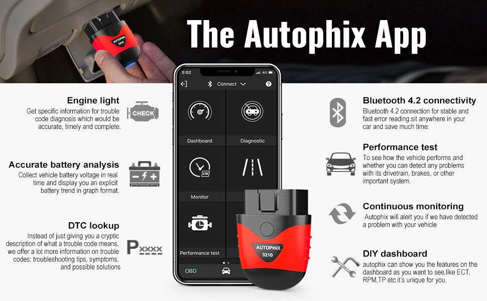 AUTOPHIX 3210 is a driving mate that communicates with vehicle terminal to complete fault diagnosis and driving assistance by smart phone or tablet, and it can support IOS device and Android device by Bluetooth 【Powerful Check Engine Light Diagnostics】 Can read and diagnose your check engine light, understand the severity of the issue, and clear fault codes in a blink of an eye. More functions compared to other simple scanner like I/M Readiness, Battery Health Check, Freeze frame, O2 sensor test, On-Board Monitoring, Evap system test, Performance Test, Data Stream, and Diagnostic reports, Handy google search button, Built-in OBD II Fault code look-up library. 【Necessary Battery Tester】 Have you ever noticed many other scanner tools without battery tester functionality, which costs you extra or more, However, AUTOPHIX 3210 can Check the health of your battery and voltage with a tap on your phone screen, so it is in great condition when you need it the most on a freezing winter day without opening the bonnet. 【 Key Point】 Don't just read vehicle malfunction codes and give you code definitions, but more importantly informs you what the possible problems are with your vehicle, even if you know absolutely nothing about cars. We are here to help you know the car troubles and clear the error code for saving money, so the understandable fault code definition is important for you. 【 Works on your car and your Language】 A necessary wireless/Bluetooth car diagnostic tool/fault code reader for today’s car owners, downloadable on both iPhone iOS, Ipad and Android and supporting major vehicle brands and models 1996 or newer. Works in English, German, Spanish, Finnish, French, Italian, Dutch, Portuguese and Chinese. 【Autophix --Repairing and Solution Consultant for your Car】 Proudly designed in the USA by Professional Engineers. Tested in 50+ local car dealers in the United States before Mass production. Autophix only does car scanning. We are professional for your cars. What does Autophix 3210 obd2 bluetooth scanner do? Read codes&Erase codes : Quickly read the error code in 3 seconds and clear pending error code, help you save time and money to fix it yourself if possible. Built-in OBD II Fault code look-up library : Instead of just giving you a cryptic description of what a trouble code means, we offer a lot more information on trouble codes Evap system test: Prevent gasoline vapor evaporated from the fuel tank of the car from being discharged into the atmosphere Data stream :Display various vehicle real-time parameters O2 sensor test : Detect the oxygen content in the mixture. Real Time Battery Voltage :Show the real-time voltage changes to monitor your battery health. Live Data : Show each data source as a Graph, Gauge, or Digital Display ; Customize the colors ; Resize and place in any arrangement. Important Vehicle Information : Vehicle specifications. Freeze Frame : Get a snapshot of the vehicle when a Freeze Frame Code was stored. I/M Readiness/Smog check : Determine if your vehicle is ready for an smog test. Mode 6 : Advanced test results (like misfire counts) for On-Board Diagnostic System Monitors. Available for testing Compatible with most USA vehicles after 1996, EU vehicles after 2002, French vehicles after 2004 and Asia vehicles after 2006 (Including CAN J1850PWM, J1850VPW, IS09141 and KWP2000 Protocols) Support some diesel-powered cars. For example, light-duty trucks, pickups and so on. On Jan 26, 2026 at 00:37:25 PST, seller added the following information: