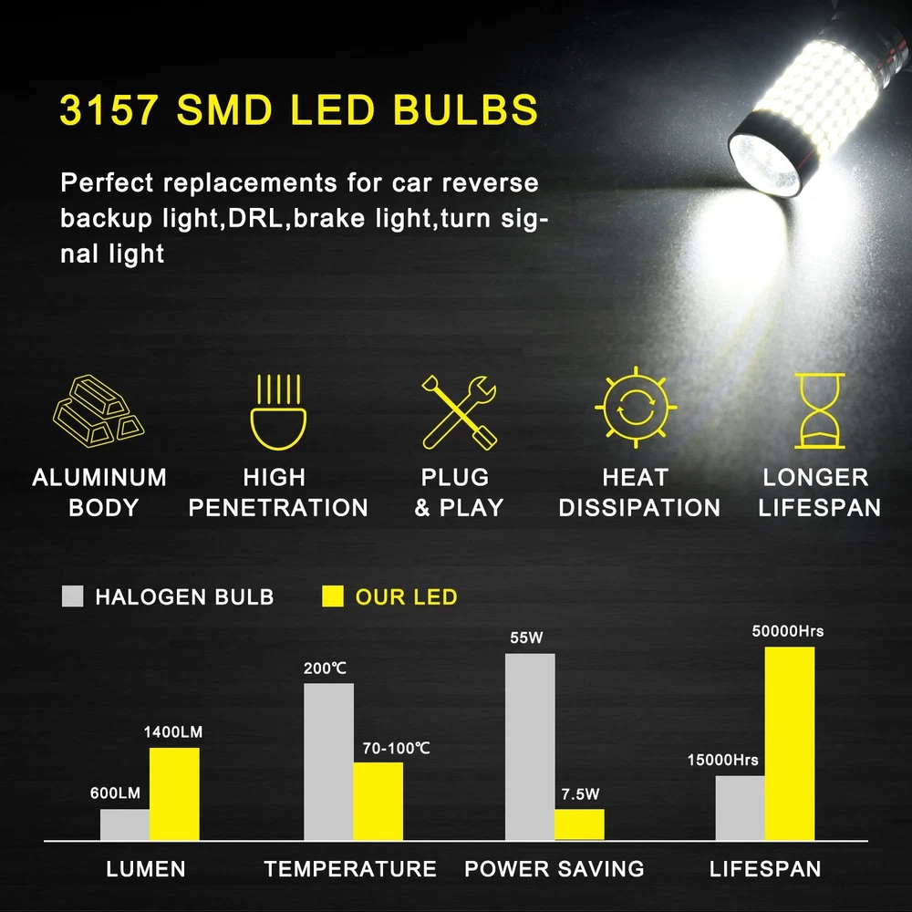 The compatible vehicle lists is only partial lists,no fully included due o Ebay listing compatible vehicles limitation. IF your car plug is 3157 3156,the item is fit your car AUXITO 2x144-SMD 3156 3056 White 2800lm Bright Super LED Reverse Backup Light The compatible vehicle lists is only partial lists,no fully included due o Ebay listing compatible vehicles limitation. IF your car plug is 3157 3156,the item is fit your car About this item 1. Good light type, the position of the light-emitting point is close to the original car halogen lamp 2.No delay to light up, low power consumption and high lighting,Good Quality And Durable,Easy to Install,Good Feel. 3.With High-purity brightness, strong penetrability and superior stability 4.360 degree light, 3014 SMD emit 360 degree light can light up every corner 5.This listing features one pair ( 2 pieces) extremely bright high power 6000K white LED Lights bulbs as car Backup Light/Daytime Running Light/Brake Light/Turn signal Light 6. It is perfect for customers who are looking for Extremely Bright output. Specifications: Model: 3 157 / 3156 LED Chip: With 3014 SMD Lamp beads: 144 H Lumen: 1400Lm/per bulb, 2800LM/per Set Color Temperature:6000K Xenon White Work Voltage(V):DC 12V Lifetime:More than 30000 hours Waterproof Level:IP65 Viewing Angle(θ):360° Certified by:CE & ROHs Warranty:1 year Canbus: NO Material:Aluminum+High Quality Plastic Placement on Vehicle:Front,Rear,Left, Right Applications: backup reverse light, tail light, brake light, turn signal light, daytime running light, parking light, side marker light, etc. Cross Reference: 3156, 3056, 3356, 3456, 4156, 3157, 3047, 3057, 3357, 3457, 3757, 4157, 4114, 4157NA, 3157A, T25, etc. Suitable For Pickup, Wagon, UTB, Cab, ATV, SUV, Jeep, Truck, Bus etc. Package include : 2x 3157 3156 LED Light Complete Error Free for most vehicles . For some vehicles, it may require install decoder or load resistor to avoid turn signal hyper flash or fast blinking. Item Specifics Brand AUXITO Manufacturer Part Number Does Not Apply Interchange Part Number 3457 3757 4057 4111 4157NA 3457A 3157A 3157LL Other Part Number Halogen turn signal back up brake tail bulb lamps Placement on Vehicle Front Rear Left Right Manufacturer Warranty Yes FAQ ♥ If you have a decoding problem or any other problems, please contact us first, we will help you with it. We will reply you within 24 hours in working days. I'm a new seller, thanks a lot for your trust and convince! I will serve you with all my heart. ♥ Q1: Will this bulb fit my vehicle? A: We can match almost any vehicle to one of our bulb sizes. eBay only lets us include some vehicle fitments per listing, but if your vehicle does not show up on the compatibility table at the top of our listings, welcome you to contact us for free consulation before purchasing a product. Q2: My item has not arrived, what's taking so long? A: Sometimes items take longer than expected, especially if it’s going far or to rural area. Check with your post office to see if your item has been held up. Sometimes Royal Mail will not update a tracking number until it has arrived at its destination. If your item still don't arrive after a few days, let us know so we can double check for you and help solve it asap. Q3: My bulbs won't fit, help! A: Special bulb holder may be required. See if you can take the holder from the stock bulb. If not, let us know. The bulb size may be wrong, double check the item you received with the item you ordered. Do you have an aftermarket lighting housing? These may not be perfectly fitted for aftermarket bulbs and will require some manual modifications. Q4: Neither side lighting up? Both sides flicker, hyper flash, or work inconsistantly. A:Check the light fuses, and then check the ballast plugs to insure correct installation. If this doesn't work, there may be a voltage problem with the vehicle. You probably just need a relay or capacitor. Even though some bulbs are builtin resistors, they may still need a decoder. Pay & Ship (1). We gladly accepts payment via PayPal, We will ship your item(s) within 24 hours. (2). Before payment, please keep the consistency of Paypal address and ebay address. (3). Quantity orders are welcome! Returns (1). We offer 60 days free return policy. Please contact us within 60 days from the date you receive your order if you have any issues with the product or want return. Refund will be send after we got your resend package. (2). All returned items should be in the original packaging , return tracking information should be provided . Contact Us (1).Negative feedback will not help resolve any problems you have, please contact us via eBay messages before leaving negative feedback , our customer service will make best effort to help you with the issues. (2).We maintain high standards of excellenceand strive for 100% customer satisfaction! Feedback is very important to us. We request that you contact us immediately before you give us neutral or negative feedback, so that we can satisfactorily address your concerns. About us We're professional in car and motorcycle accessories, especially in LED bulbs. We have our own factory and R&D team. Our belief is to sell top quality items that fit your car and serve you with our heart. Anything please feel free to contact us! Our customer service is very responsibility. Come and follow us! DESCRIPTION NEW ARRIVED HOT SALE CONTACT US SAVE US Store Category Store Home Other Hot Item RGB LED Car Neon Light Chassis Atmosphere Lamp Kit For Honda Nissan Subaru Audi USD 31.34 5Pcs FORD F350 F150 For F250 Roof Top 1973-1997 Cab Lights Marker Amber Lights USD 27.54 LED License Plate Tag Lights For 2014-18 Chevy Silverado GMC Sierra 6000K White USD 14.89 LED License Plate Light For 88-00 Chevy C/K 1500 2500 3500 BRIGHT WHITE Tag Lamp USD 13.99 1000pcs Headliner Star Light kit Roof Twinkle Ceiling Light Optic Fiber Home Car USD 72.99 New List Item AUXITO 2X 9005 LED Headlight Bulbs High Beam for Dodge Ram