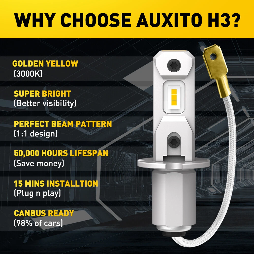 The compatible vehicle lists is only partial lists,no fully included due To Ebay listing compatible vehicles limitation. IF your car plug is H3,the item is fit your car About this item CSP Chips, Brightness Improved AUXITO h3 LED fog light bulb is designed with 6 CSP chips, 3000K Golden Yellow, about 3 times brighter than stock halogen bulbs, allowing you to see better and drive safer in snow, fog and rain Non-polarity, Easy to Install AUXITO H3 fog light bulb adopts the latest 1:1 mini size design, no polarity, one wire connection, so you can stay away from all kinds of installation problems. Plug and play without any modification AUXITO H3 LED Fog Light Bulbs 8000LM Mini Size 3000K Bright Golden Yellow S The compatible vehicle lists is only partial lists,no fully included due To Ebay listing compatible vehicles limitation. IF your car plug is H3 ,the item is fit your car About this item CSP Chips, Brightness Improved AUXITO h3 LED fog light bulb is designed with 6 CSP chips, 3000K Golden Yellow, about 3 times brighter than stock halogen bulbs, allowing you to see better and drive safer in snow, fog and rain Non-polarity, Easy to Install AUXITO H3 fog light bulb adopts the latest 1:1 mini size design, no polarity, one wire connection, so you can stay away from all kinds of installation problems. Plug and play without any modification IP67 Waterproof, Widely Use AUXITO led fog lights are used for upgrading stock dim h3/h3ll halogen bulb on most vehicles. With a IP67 waterproof design, you can use it in all kinds of extreme weather without worrying about water and dust entering Super Cooling, Long Lifespan Using the new LED technology, power consumption reduced by 60%. The entire aviation aluminum fuselage provides superior cooling capacity. Guaranteed up to 50,000 hours of life, saving you from the hassle of frequent bulb replacements 98% Error Free, No Worries AUXITO H3 LED bulbs are suitable for most of vehicle computer systems without error or flicker, but some sensitive models may require a canbus decoder. Specifications: Model: Common for H3 Voltage: DC 9V-16V Light source: CSP Color : 3000K Yellow Operating Life: >50000hrs Application: Fog light, daytime running light, headlight Package include: 2X H3 LED BULB lights Item Specifics Features CANbus Compatible Bulb Fitment Code H3 Manufacturer Warranty 5 Years OE/OEM Part Number AUXITOH3LED Voltage 9-16 V Fitment Type Direct Replacement Performance Part Yes Lighting Technology LED Suitable For Fog Light Lumens 4000 lm To Fit Foglight, Daytime Running Light, Headlight Color Temperature 3000K Light Color Yellow Number of Bulbs 2 Placement on Vehicle Front Manufacturer Part Number AUXITOGFH3 Brand AUXITO Light source CSP Bulb Life Hours Up to 50,000 Hours Type Light Bulb Performance Part Yes FAQ ♥ If you have a decoding problem or any other problems, please contact us first, we will help you with it. We will reply you within 24 hours in working days. I'm a new seller, thanks a lot for your trust and convince! I will serve you with all my heart. ♥ Q1: Will this bulb fit my vehicle? A: We can match almost any vehicle to one of our bulb sizes. eBay only lets us include some vehicle fitments per listing, but if your vehicle does not show up on the compatibility table at the top of our listings, welcome you to contact us for free consulation before purchasing a product. Q2: My item has not arrived, what's taking so long? A: Sometimes items take longer than expected, especially if it’s going far or to rural area. Check with your post office to see if your item has been held up. Sometimes Royal Mail will not update a tracking number until it has arrived at its destination. If your item still don't arrive after a few days, let us know so we can double check for you and help solve it asap. Q3: My bulbs won't fit, help! A: Special bulb holder may be required. See if you can take the holder from the stock bulb. If not, let us know. The bulb size may be wrong, double check the item you received with the item you ordered. Do you have an aftermarket lighting housing? These may not be perfectly fitted for aftermarket bulbs and will require some manual modifications. Q4: Neither side lighting up? Both sides flicker, hyper flash, or work inconsistantly. A:Check the light fuses, and then check the ballast plugs to insure correct installation. If this doesn't work, there may be a voltage problem with the vehicle. You probably just need a relay or capacitor. Even though some bulbs are builtin resistors, they may still need a decoder. Payment (1). We gladly accepts payment via PayPal, We will ship your item(s) within 24 hours. (2). Before payment, please keep the consistency of Paypal address and ebay address. (3). Quantity orders are welcome! Returns (1). We offer 60 days free return policy. Please contact us within 60 days from the date you receive your order if you have any issues with the product or want return. Refund will be send after we got your resend package. (2). All returned items should be in the original packaging , return tracking information should be provided . Contact us (1).Negative feedback will not help resolve any problems you have, please contact us via eBay messages before leaving negative feedback , our customer service will make best effort to help you with the issues. (2).We maintain high standards of excellenceand strive for 100% customer satisfaction! Feedback is very important to us. We request that you contact us immediately before you give us neutral or negative feedback, so that we can satisfactorily address your concerns. About us We're professional in car and motorcycle accessories, especially in LED bulbs. We have our own factory and R&D team. Our belief is to sell top quality items that fit your car and serve you with our heart. Anything please feel free to contact us! Our customer service is very responsibility. Come and follow us! DESCRIPTION PAYMENT SHIPPING RETURN POLICY CONTACT US Shop Category Store Home Othe