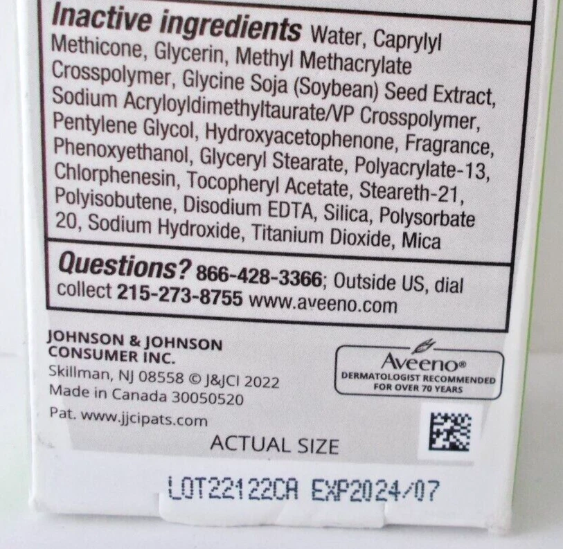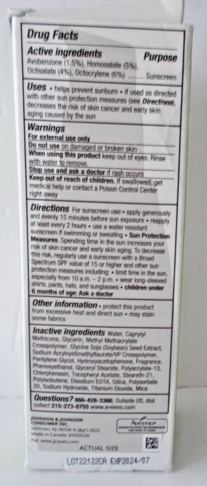 Formulation: Lotion MPN: Does Not Apply Size: Regular Body Area: Face Product Line: Aveeno Scent: Unscented Ingredients: Glycerin Skin Type: All Skin Types gtin13: 3 81372 02081 1 Active Ingredients: Sunscreen Set Includes: 1 Bottle Country/Region of Manufacture: Canada Type: Sunscreen Volume: 2.3 FL OZ UVA Protection: Broad Spectrum Features: Hypoallergenic & Oil-Free Period After Opening (PAO): NEW EXP 07/2024 Brand: Aveeno UPC: 3 81372 02081 1 Department: Unisex Sun Protection Factor (SPF): SPF 15