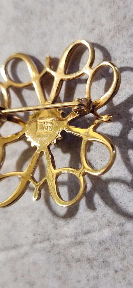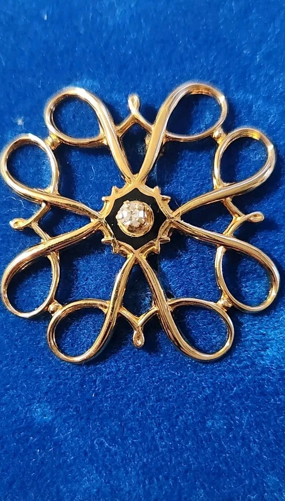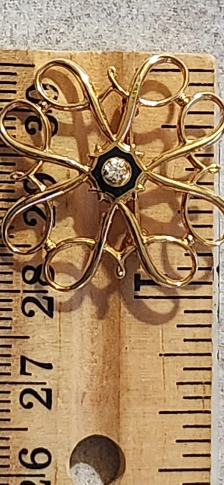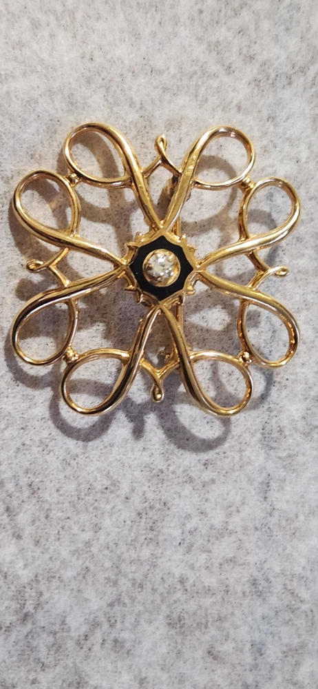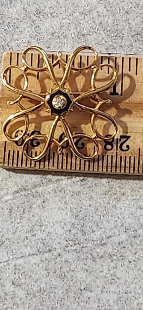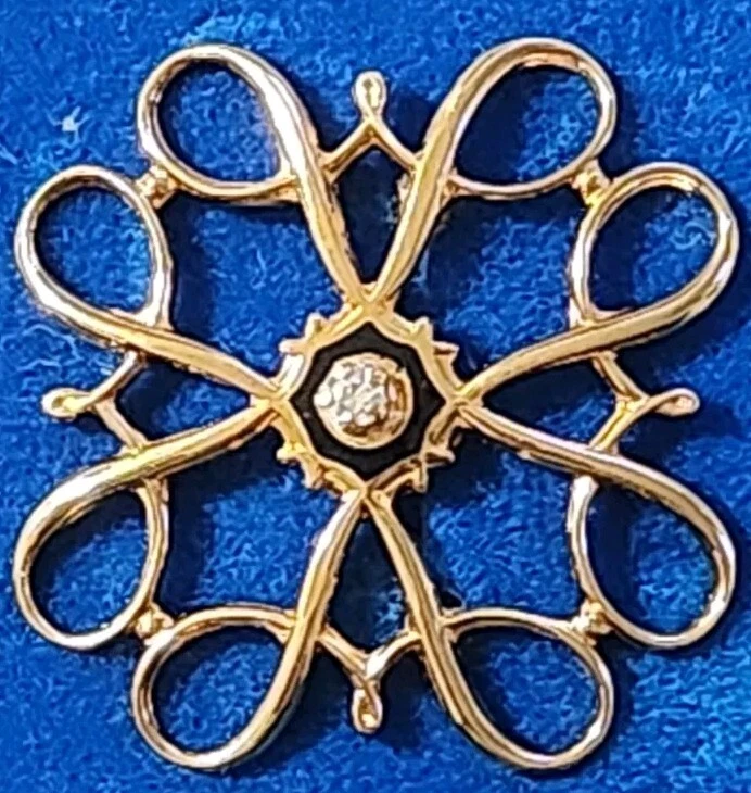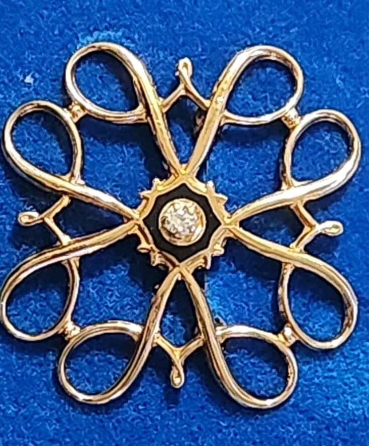 This vintage Avon Award Art Nouveau brooch is a stunning piece of jewelry that will add a touch of elegance to any outfit. The brooch features a beautiful flower shape with clear diamonds set in 10K yellow gold. The piece is signed and weighs 2.36 grams, making it a substantial addition to any jewelry collection. The brooch is perfect for all occasions, whether it's for a special event or just a day out. Its designer features and textured finish make it a unique and eye-catching piece. The brooch is an original piece from the United States and is a great addition to any estate jewelry collection.