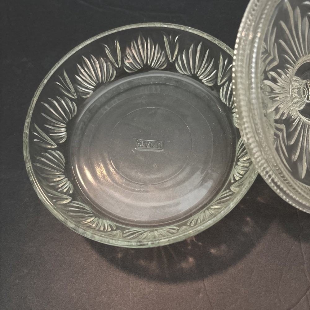 Brand: Avon Features: Cover Color: Clear Primary Material: Glass Object Type: Candy Dish Style: Victorian Material: Glass Original/Reproduction: Vintage Original Type of Glass: Pressed Glass