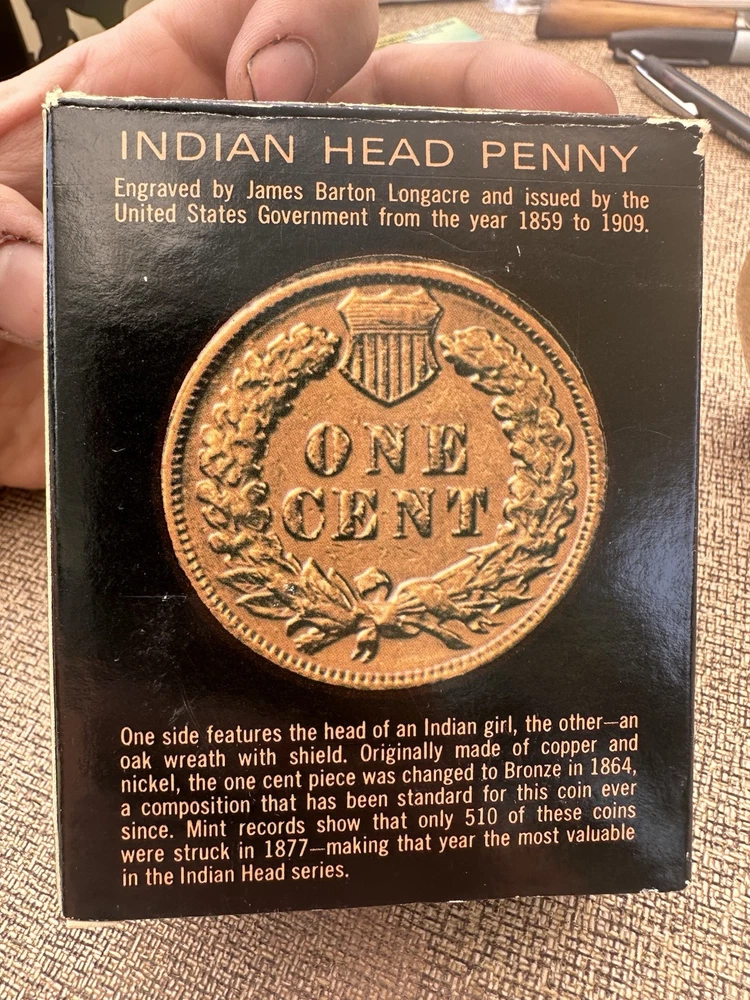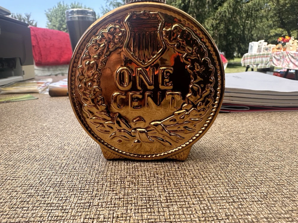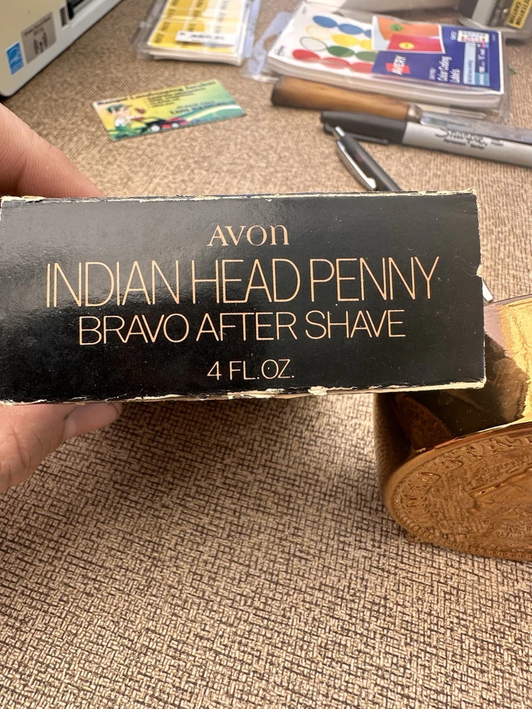 This Avon Indian Head Penny Excalibur aftershave bottle is a small, 3D abstract novelty item made of shiny copper glass. It features a coin design with a height of 4 inches and a width of 1.25 inches. The bottle has been used and comes in its original box. It is suitable for adults and can be displayed in any room as a decorative collectible from the late 20th century.