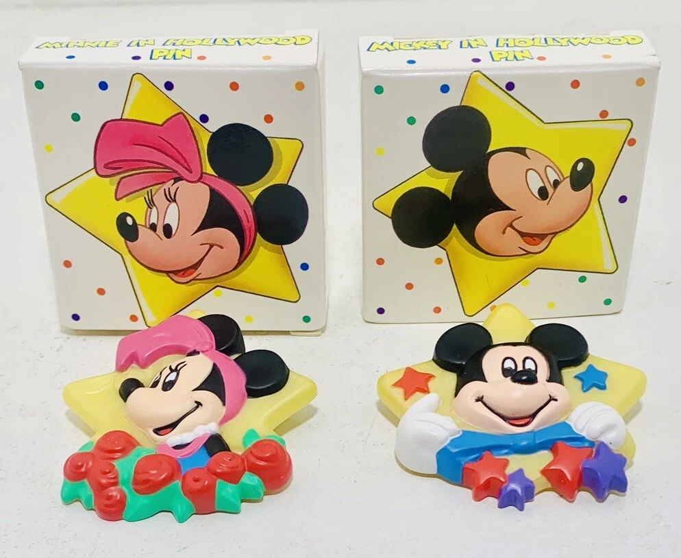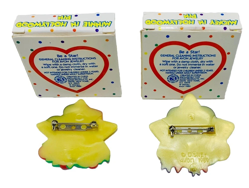 Add a touch of Disney magic to your lapel with this AVON Mickey + Minnie Mouse in Hollywood Lapel Pins set from 1989. These Walt Disney resin buttons feature the iconic duo in a Hollywood theme, perfect for any Disney fan. The pins are new in original box and ready to be added to your collection.