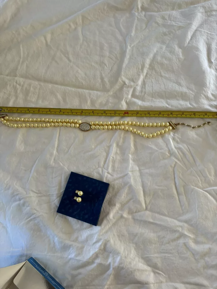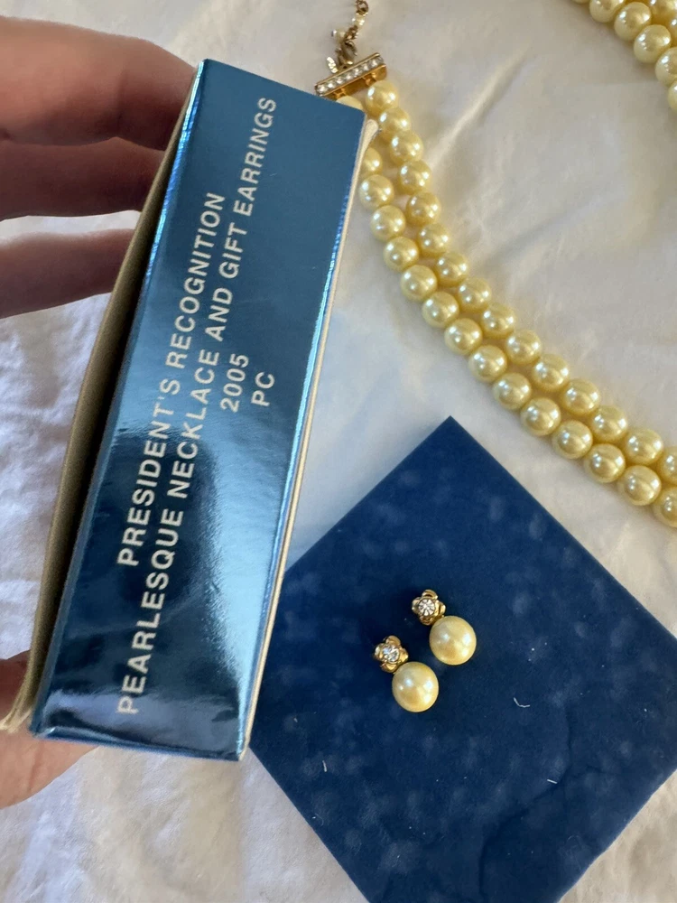 This lovely Avon necklace and earring set from 2005 is the perfect addition to any jewelry collection. The ivory color and pearl design exude elegance and beauty, while the silver metal adds a touch of sophistication. The oval pendant shape and amulet type make for a unique and charming look, and the clip-on earrings ensure comfortable and secure wear. The set is branded by Avon and features a lovely pearl and silver color scheme. It is vintage and has been well-maintained to ensure its longevity. This necklace and earring set is perfect for any occasion, whether it be a formal event or a casual day out. See all photos!!