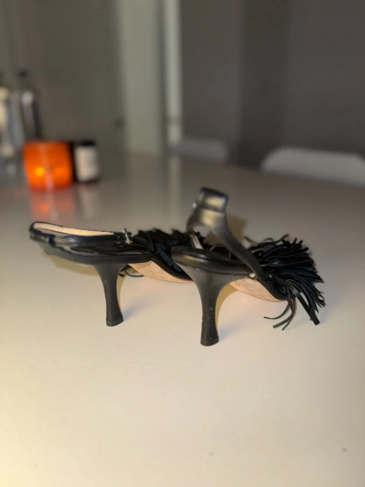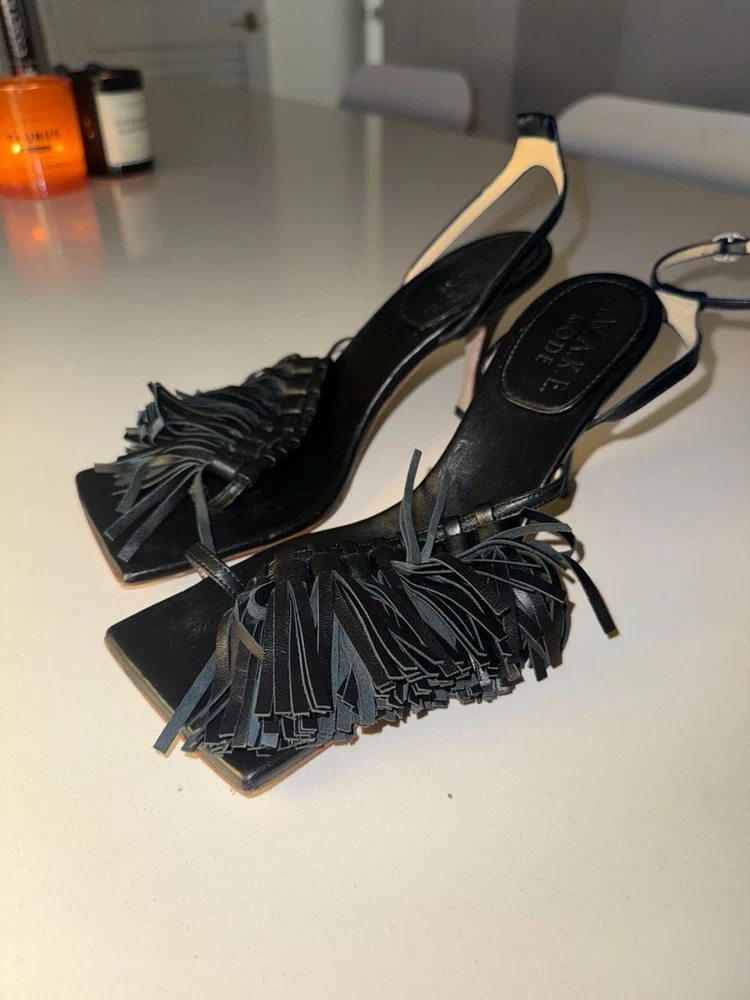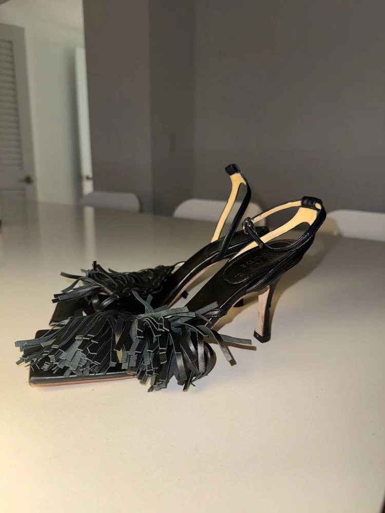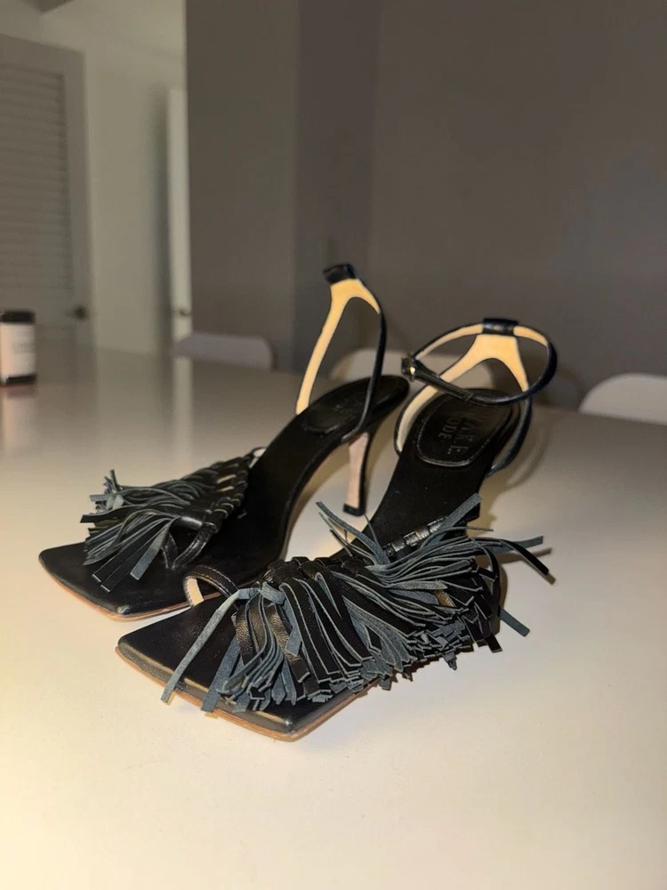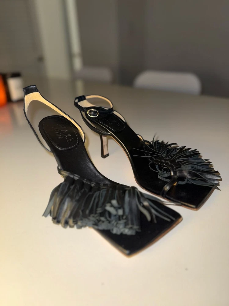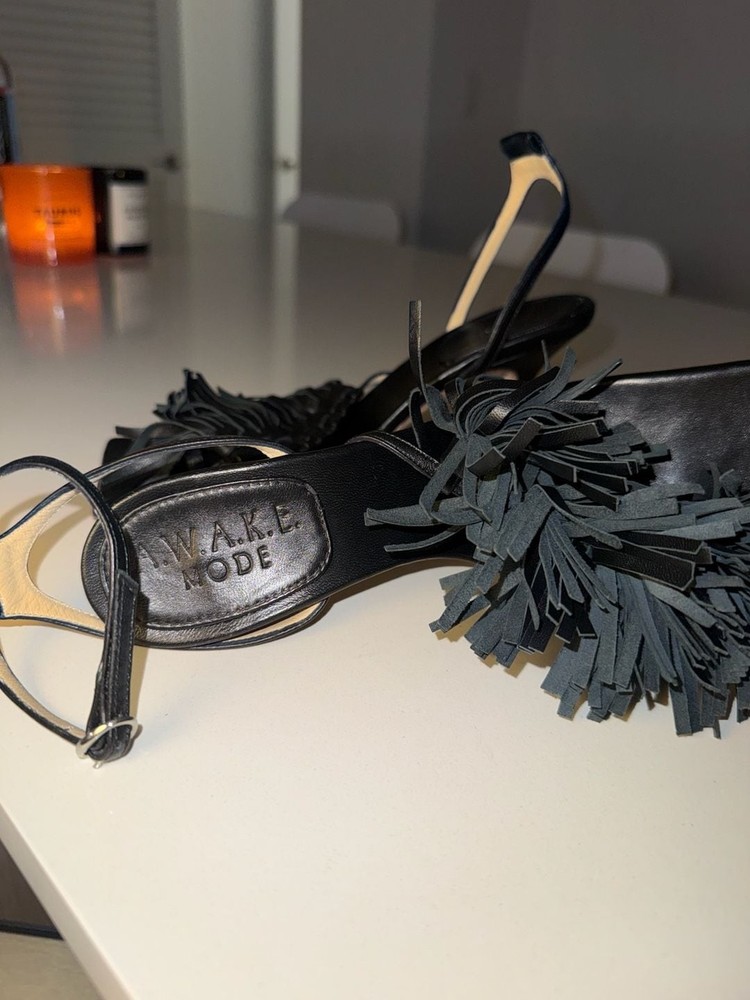 Missing ankle strap buckle on one shoe!!! A.W.A.K.E. MODE Delta Black Tassel High Heel Sandals. These avant-garde heels feature a striking square toe aesthetic with voluminous leather fringe/tassel detailing across the front strap. Crafted with an adjustable ankle buckle closure and a slim architectural high heel. Missing ankle strap buckle on one shoe. These are constructed from high-quality leather (Vero Cuoio) and were expertly made in Italy. Stylish and statement-making for evening wear or special occasions. Condition: Good pre-owned condition. Shows some light scuffs on the back of the heels and general wear on the soles as pictured. Tassels remain intact and lush.