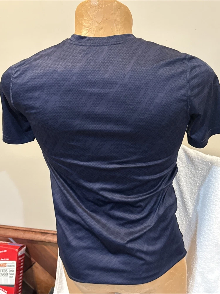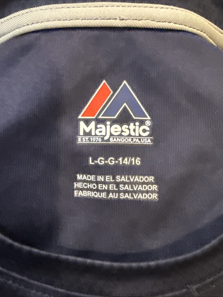 You are purchasing a very nice New York Yankees short sleeved shirt. Shirt is a youth size large 14-16. Shirt has small Yankees NY logo and New York Yankees lettering screen printed on front. Shirt has nothing on back side. Shirt is dark blue in color. Shirt is 100% thin, light weight polyester. Made by Majestic. Shirt is like new, never worn condition. Very nice shirt for your younger Yankee fan Buyer pays $5.00 shipping. Shipping combined whenever possible. Thanks for your business! Please check out my store for other great items!!