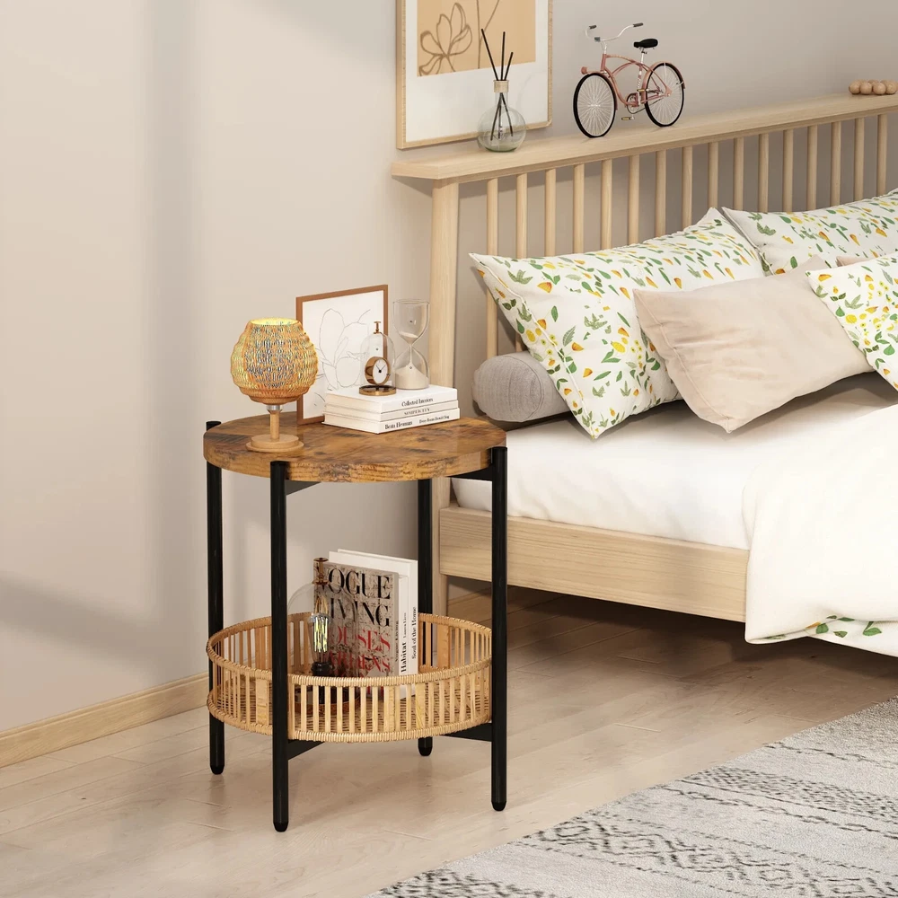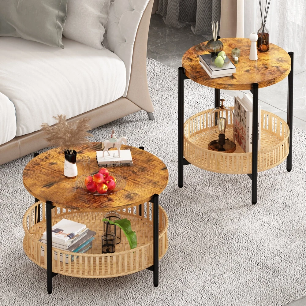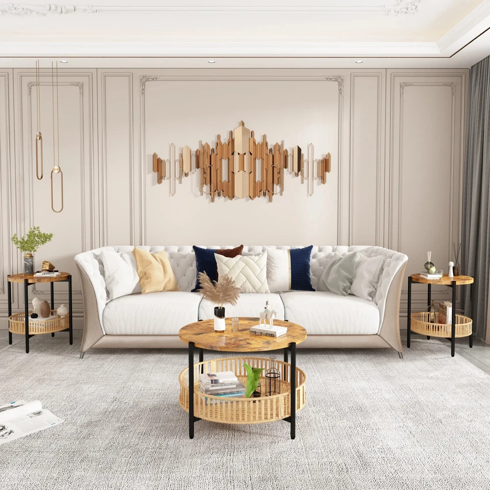 AWQM Round Coffee Table with Rattan Storage Shelf, Rustic Brown Enhance your living space with this stylish and functional AWQM Round Coffee Table Set , featuring a rattan-woven storage shelf and a solid wood tabletop. Perfect for any modern, farmhouse, or rustic décor, this set includes one coffee table and two matching end tables , providing a cohesive and versatile solution for your home. Product Features: Complete Set – Includes 1 round coffee table and 2 end side tables , ideal for living rooms, bedrooms, or lounge areas. Spacious Dimensions – Coffee table: 28.93”L x 28.93”W x 18.7”H ; End tables: 19.09”L x 19.09”W x 22.83”H . Durable Rattan Storage Shelf – The lower shelf offers a stylish storage solution for books, magazines, blankets, and more. Solid Wood Tabletop – Provides a sturdy surface for displaying décor items like photo frames, plants, and candles. Waterproof & Easy to Clean – The smooth surface is resistant to water and stains , making maintenance effortless. Why Choose This Set? ✔ Multi-Functional Design – Use the tables together or separately to fit your space and needs. ✔ Rustic Brown Finish – Complements a variety of interior styles, adding warmth and charm. ✔ Easy Assembly – Simple setup with included instructions and hardware. Upgrade your home with this AWQM Round Coffee Table Set —a perfect blend of functionality and rustic elegance!
