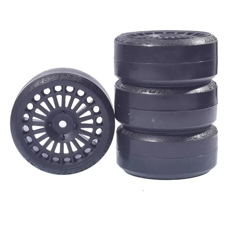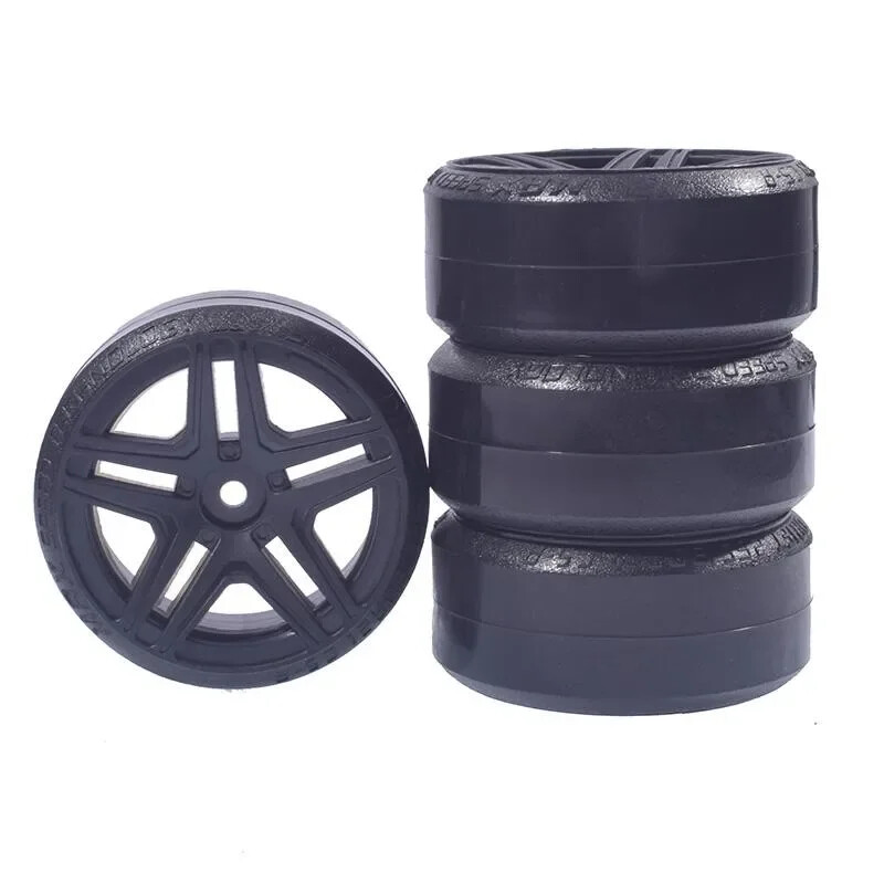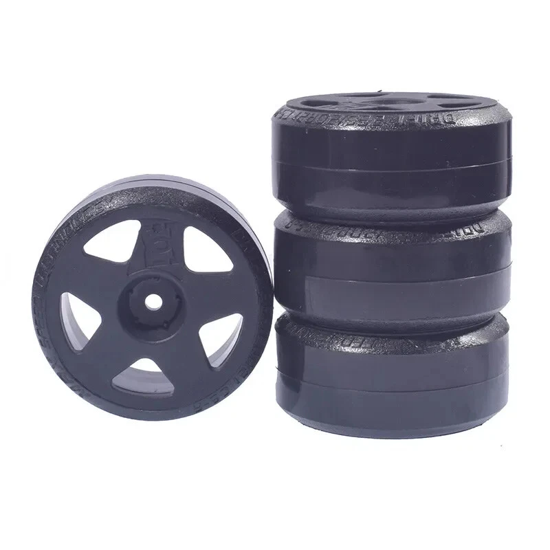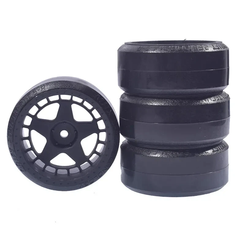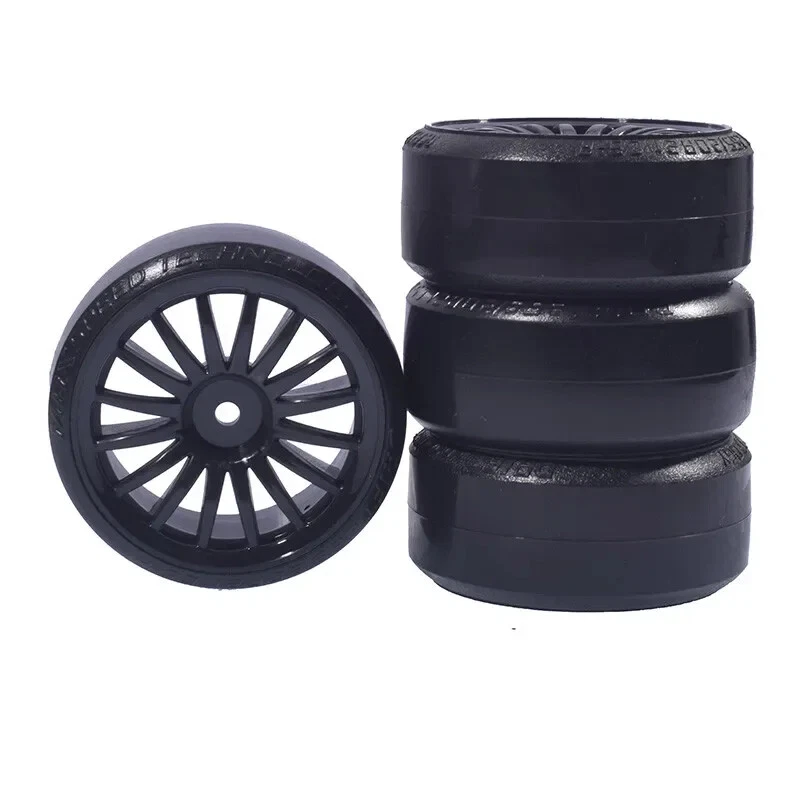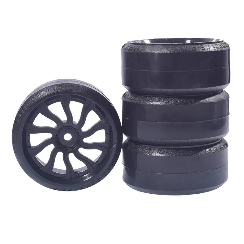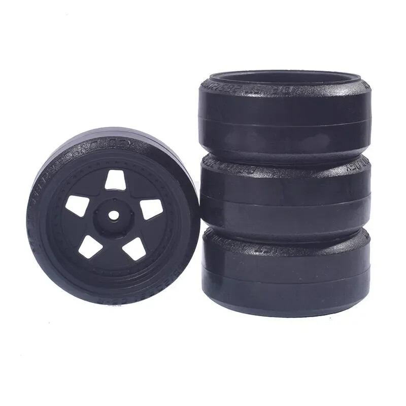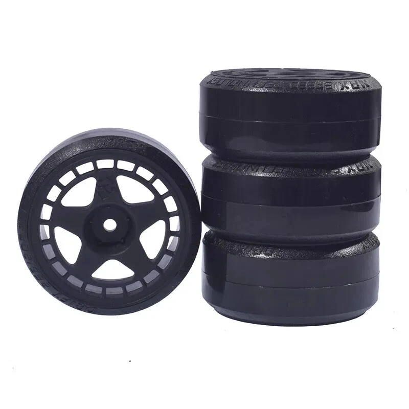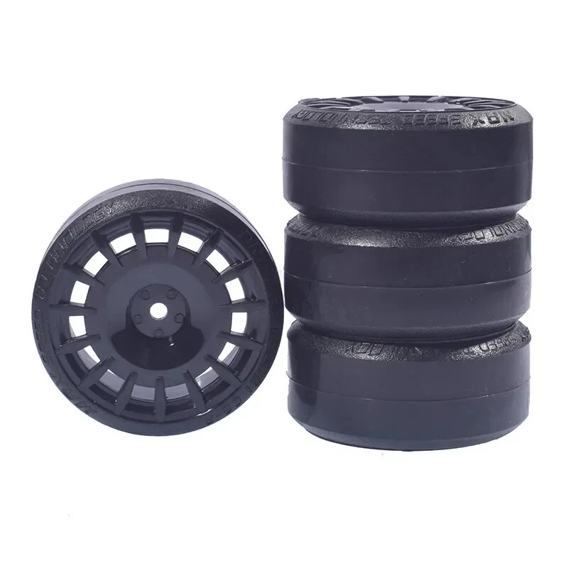 Material: Nylon Rims & Nylon Tires Tires Diameter: 60.5mm Tires Width: 26mm Rim Inner Diameter: 45mm Hex: 12mm Package Included: 4Pcs Rims + 4Pcs Tires Please check the part number and pictures of your product specification before your purchase. Factors such as lighting, contrast and color display may cause the photo to look different from the actual product.